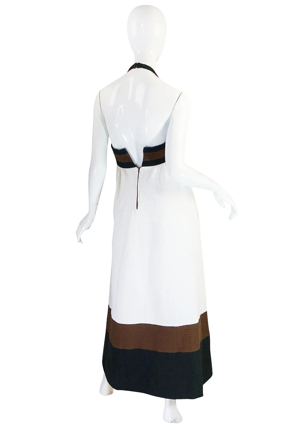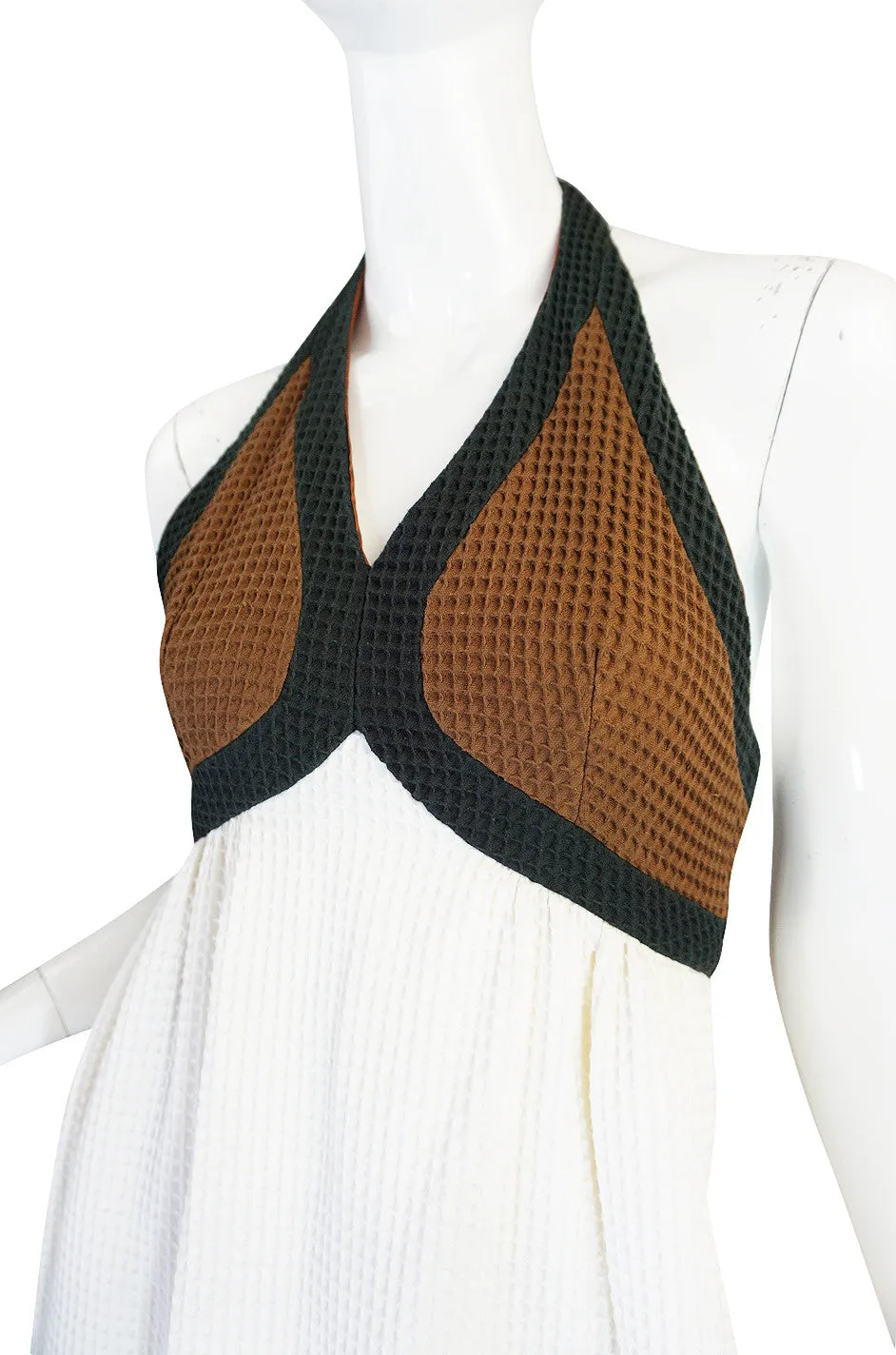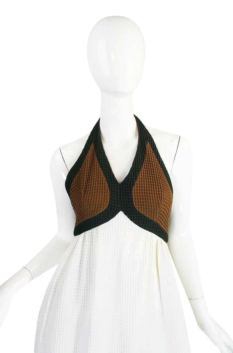 The color combination in this dress are amazing - they have an almost graphic feel that makes it look so very modern still. The entire dress is made of a waffle weave cotton whose "waffle" is large and pronounced and acts as a design element in itself. The halter sweeps up and around the neck, hooking into place. I love the deep chocolate edges with a wide black band as it really emphasizes the bust. A band of chocolate and black anchor the hem as well giving the dress balance and visual interest. Between those anchoring bands of fabric and that sexy halter is a stark white expanse. The back is left completely bare and little pockets are hidden along the seam of each hip. It is quite fabulous! Excellent condition.