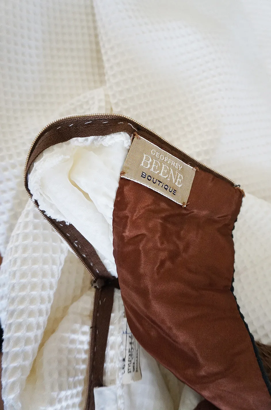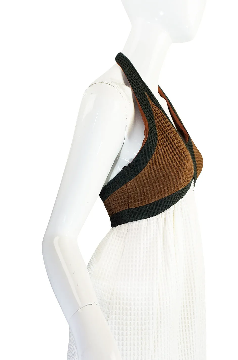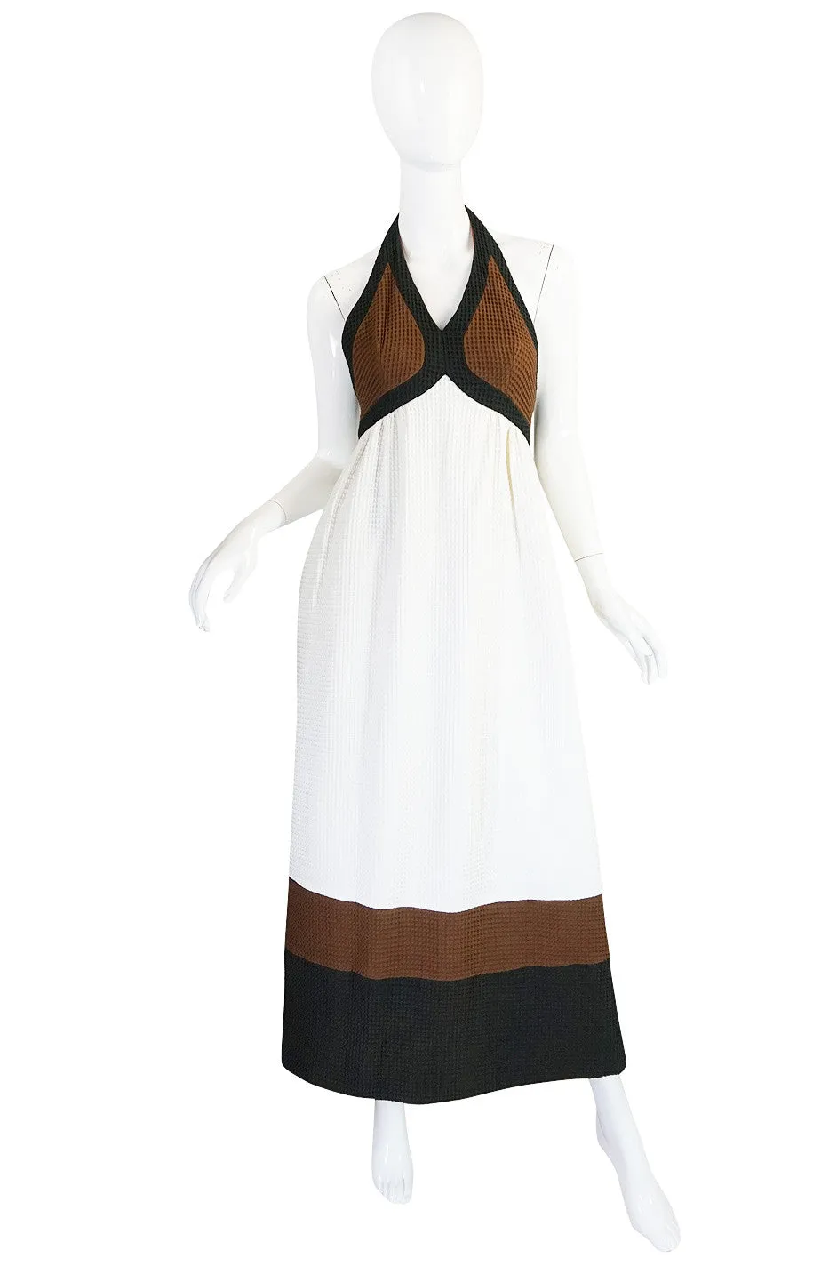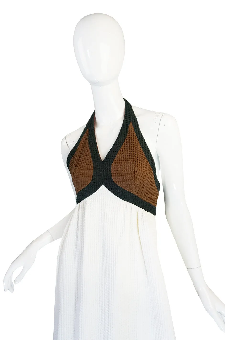 The color combination in this dress are amazing - they have an almost graphic feel that makes it look so very modern still. The entire dress is made of a waffle weave cotton whose "waffle" is large and pronounced and acts as a design element in itself. The halter sweeps up and around the neck, hooking into place. I love the deep chocolate edges with a wide black band as it really emphasizes the bust. A band of chocolate and black anchor the hem as well giving the dress balance and visual interest. Between those anchoring bands of fabric and that sexy halter is a stark white expanse. The back is left completely bare and little pockets are hidden along the seam of each hip. It is quite fabulous! Excellent condition.