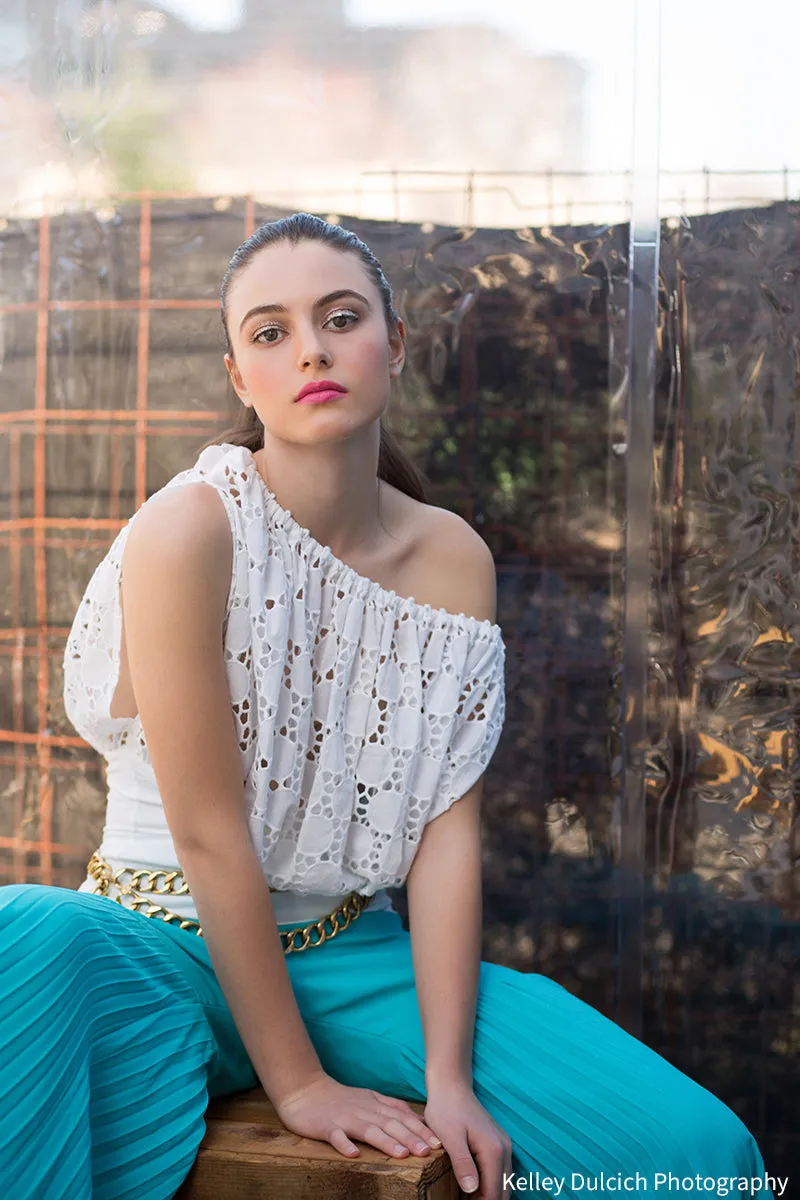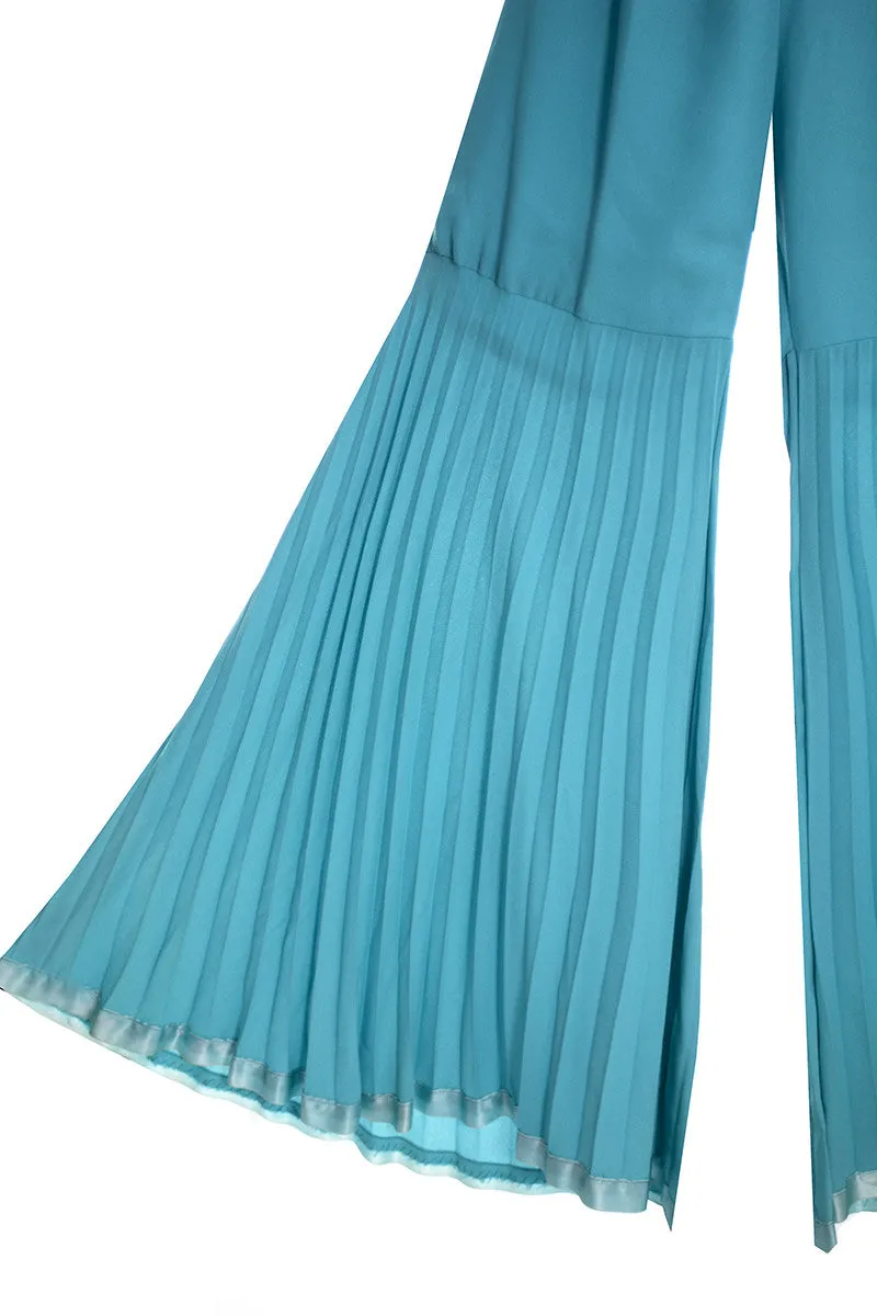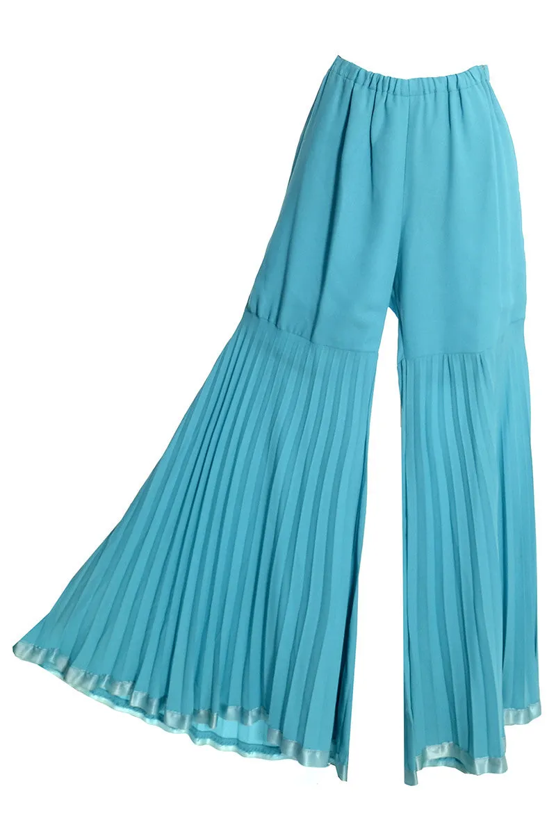 These are really fun vintage aqua blue pleated palazzo pants from the 1960s. These wide leg pants have an elastic waist and are fully lined. There is a satin ribbon trim at the bottom of the hem. Pants like these are great statement pieces to pair with simple tops and they are super comfortable to wear! We are showing the pants styled with an Anne Fontaine eyelet blouse that has sold, but they can be worn with a simple t-shirt, cropped top or blouse.