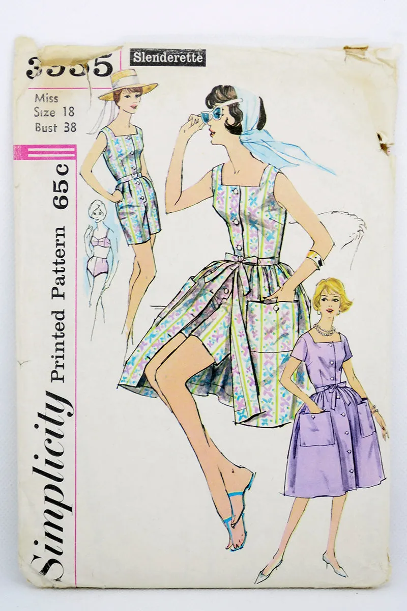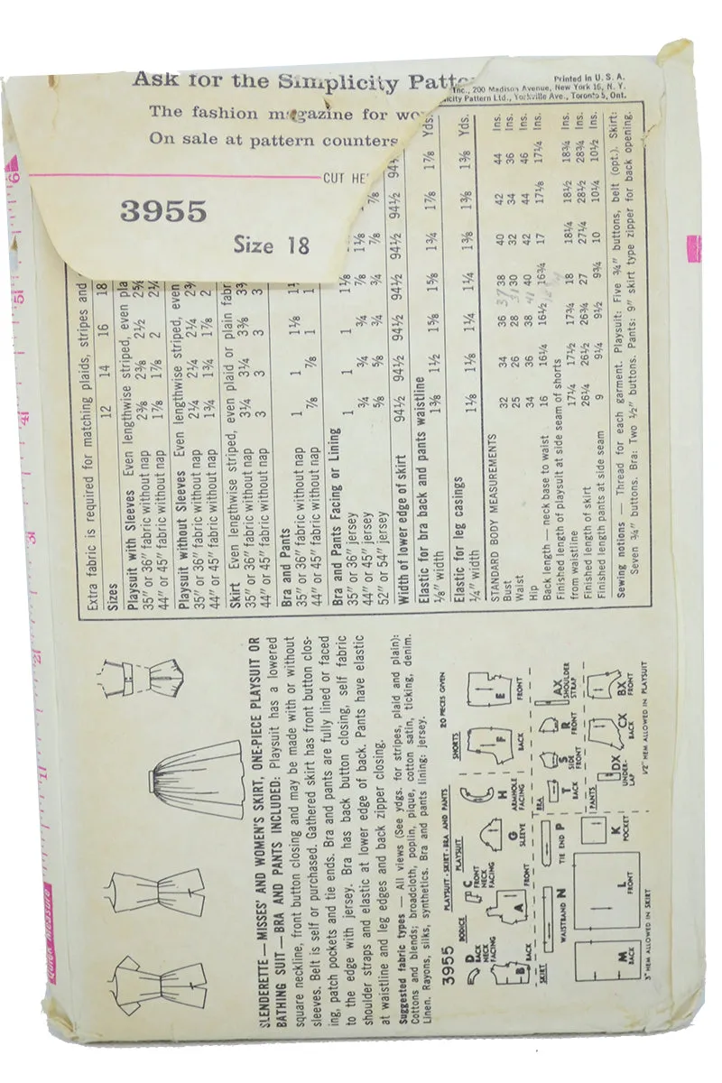Simplicity 3955 vintage 1961 sewing pattern for a skirt, playsuit, and swimsuit. This pattern is cut but complete and includes a playsuit that has sleeve or sleeveless options a gathered skirt with pockets, and a 2 piece swimsuit. You can wear the skirt over the playsuit or over the swimsuit and leave it unbuttoned from the waist down!The pattern is for a size 38 Bust but please remember that all patterns can be adjusted for size!