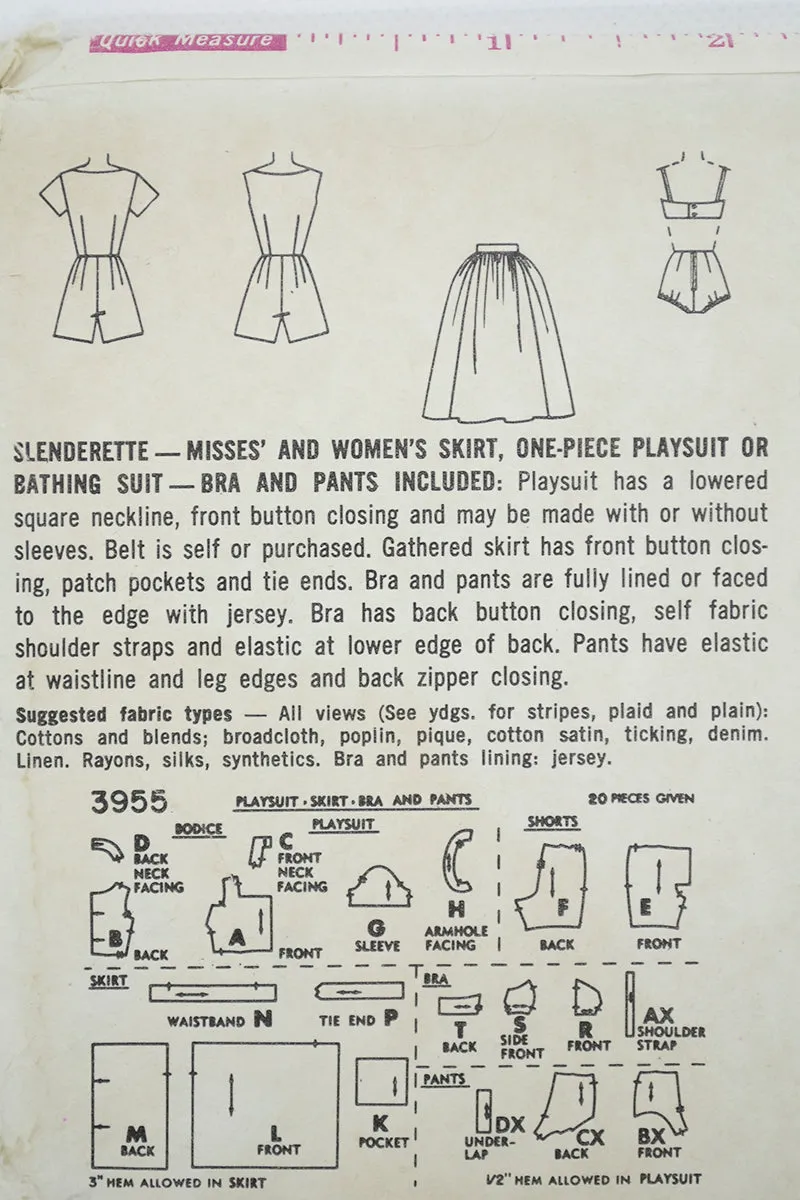 The envelope description reads: SLENDERETTE – MISSES’ AND WOMEN’S SKIRT, ONE-PIECE PLAYSUIT OR BATHING SUIT – BRA AND PANTS INCLUDED: Playsuit has a lowered square neckline, front button closing and may be made with or without sleeves. Belt is self or purchased. Gathered skirt has front button closing, patch pockets and lie ends. Bra and pants are fully lined or faced to the edge with jersey. Bra has back button closing, self fabric shoulder straps and elastic at lower edge of back. Pants have elastic at waistline and leg edges, and back zipper closing.