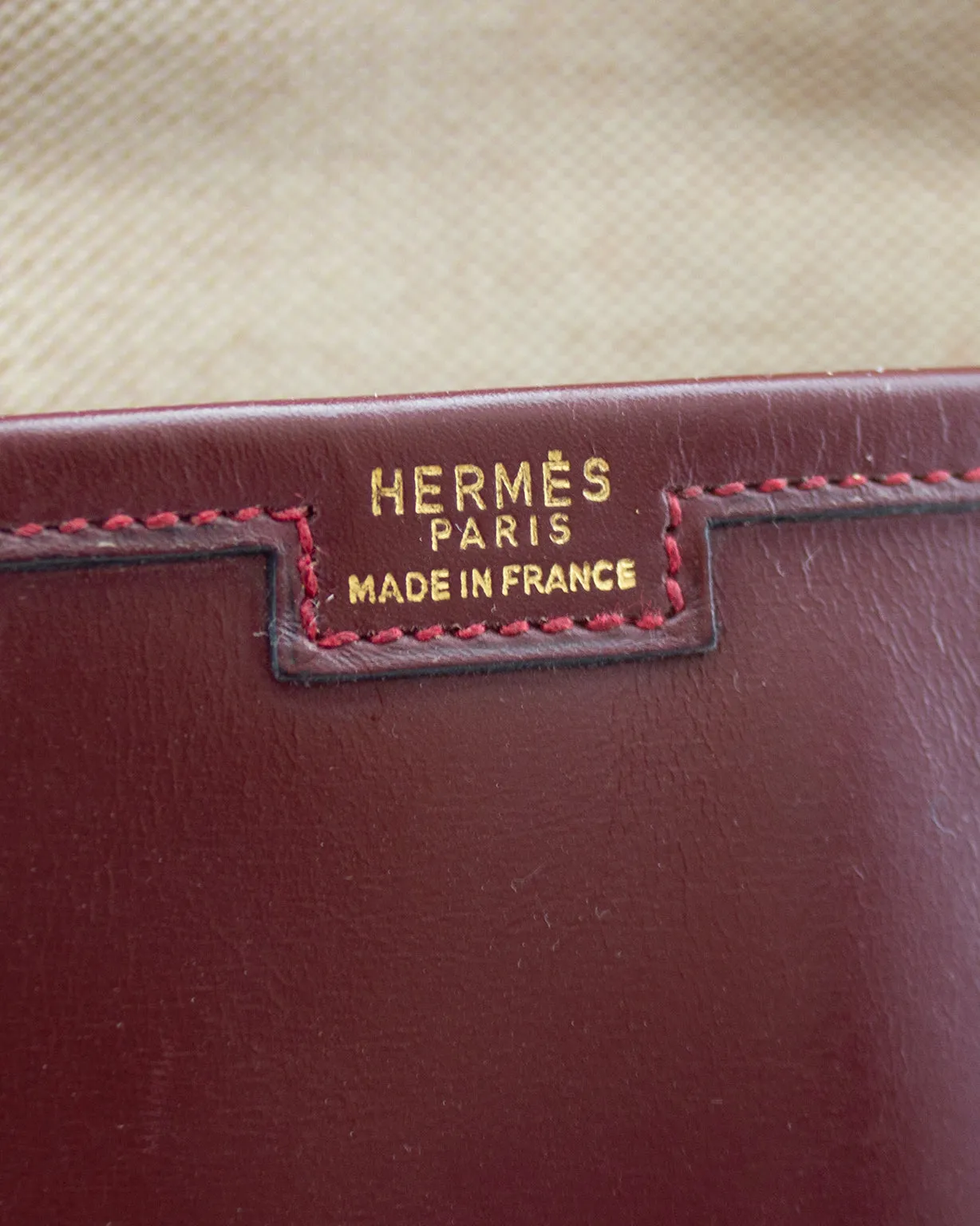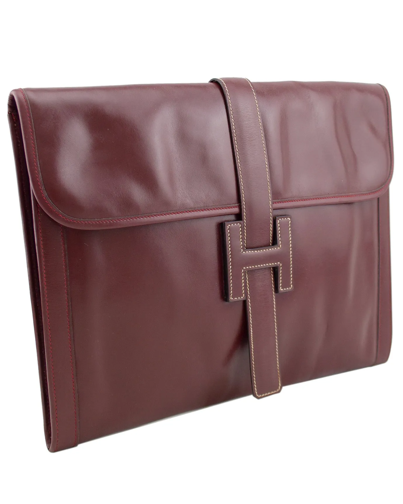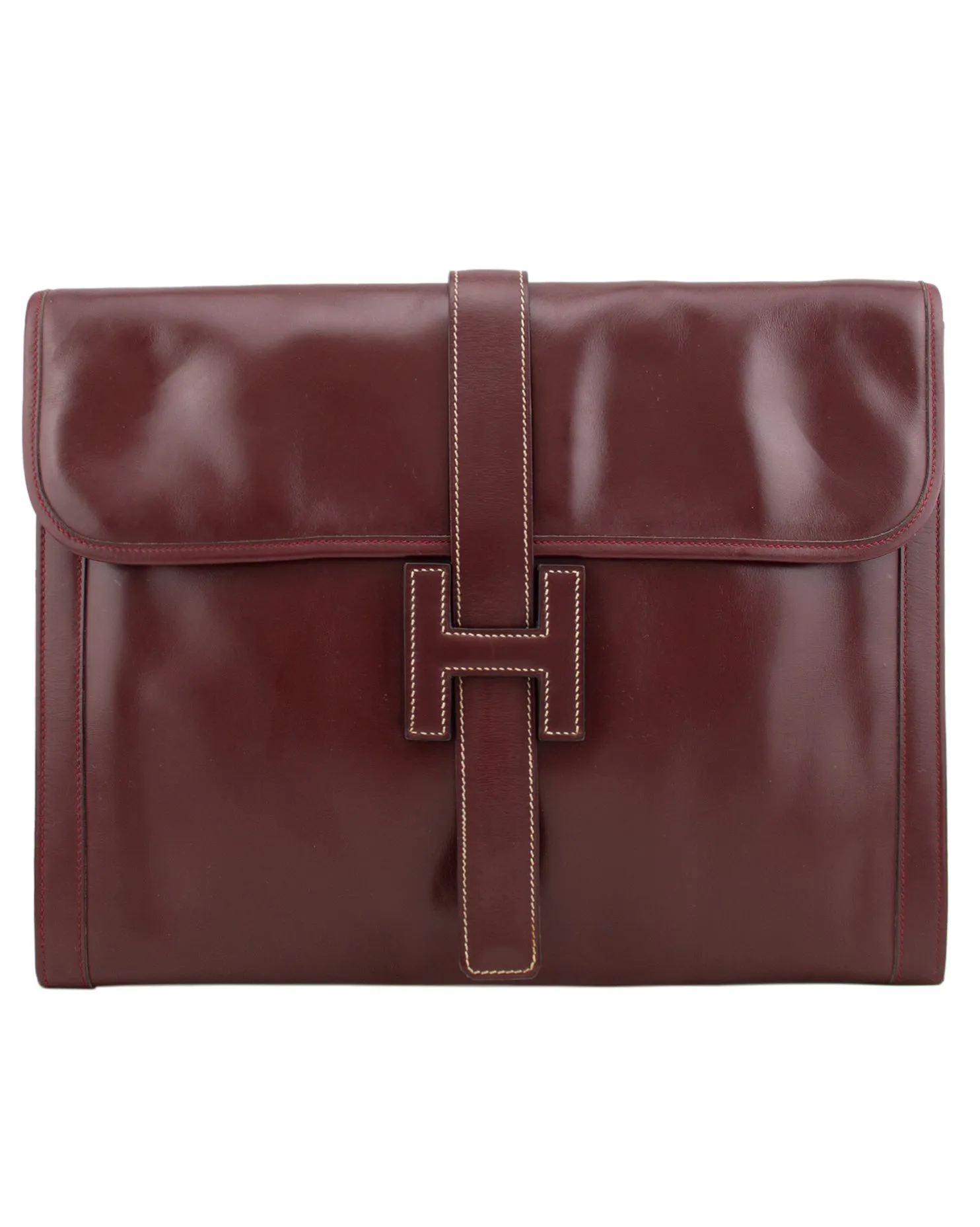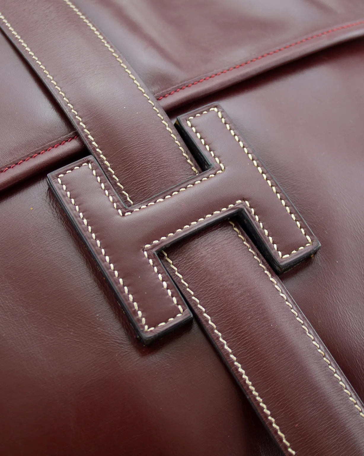 A classic day-to-night clutch that never goes out of the style, this Hermés Jige dates from the same year as its creation, 1975. This maroon leather version has the H style leather clasp on the front with a top flap opening. Finished with cream and navy top stitching, the interior has one large pocket lined in maroon and Hermes beige toile fabric. In excellent condition with some light signs of wear to the exterior and a few pen marks at the bottom of the interior. Blind stamped with an G in a circle, indicating 1977 as the production year. Handmade in France. No box or sleeper bag. 13" x 10.5" x 1".