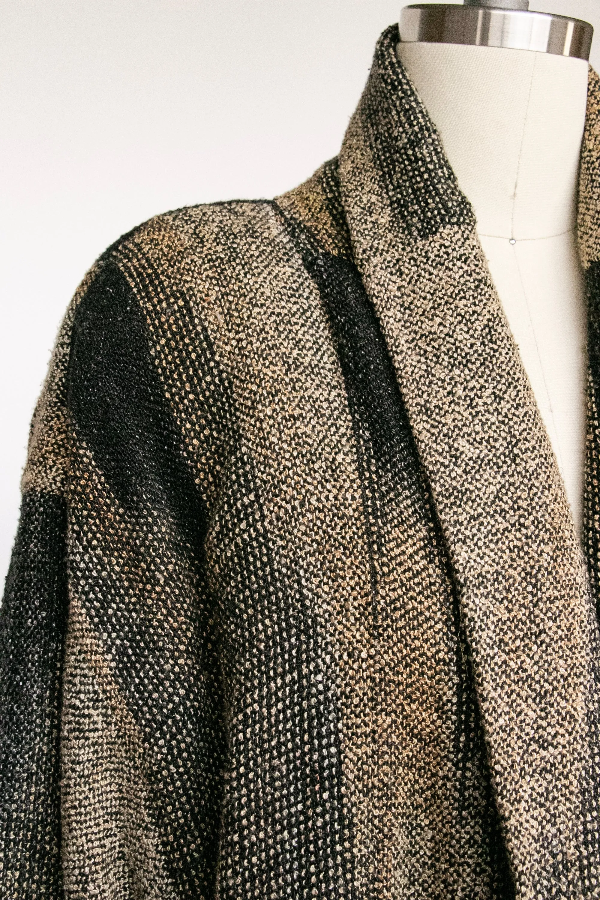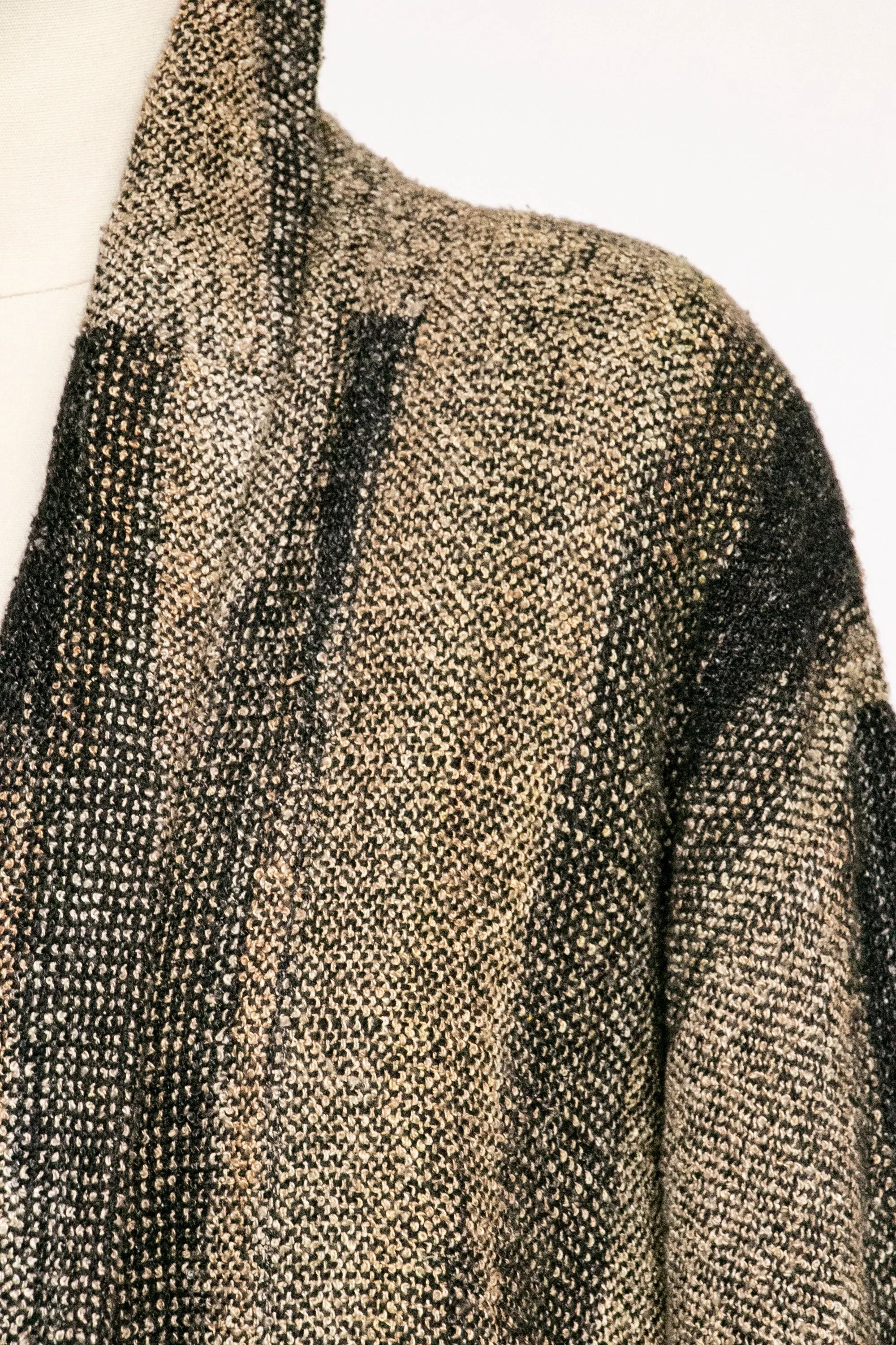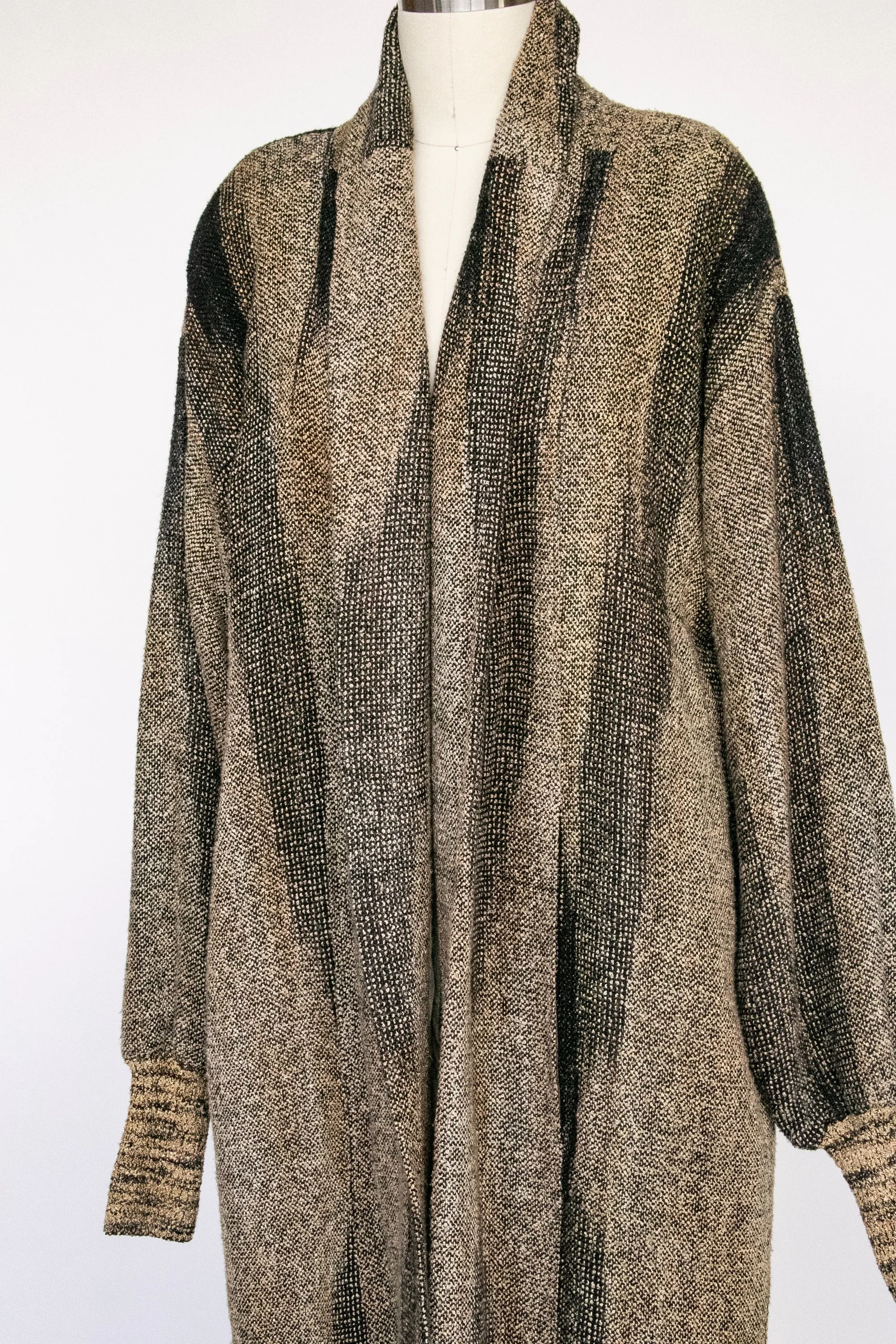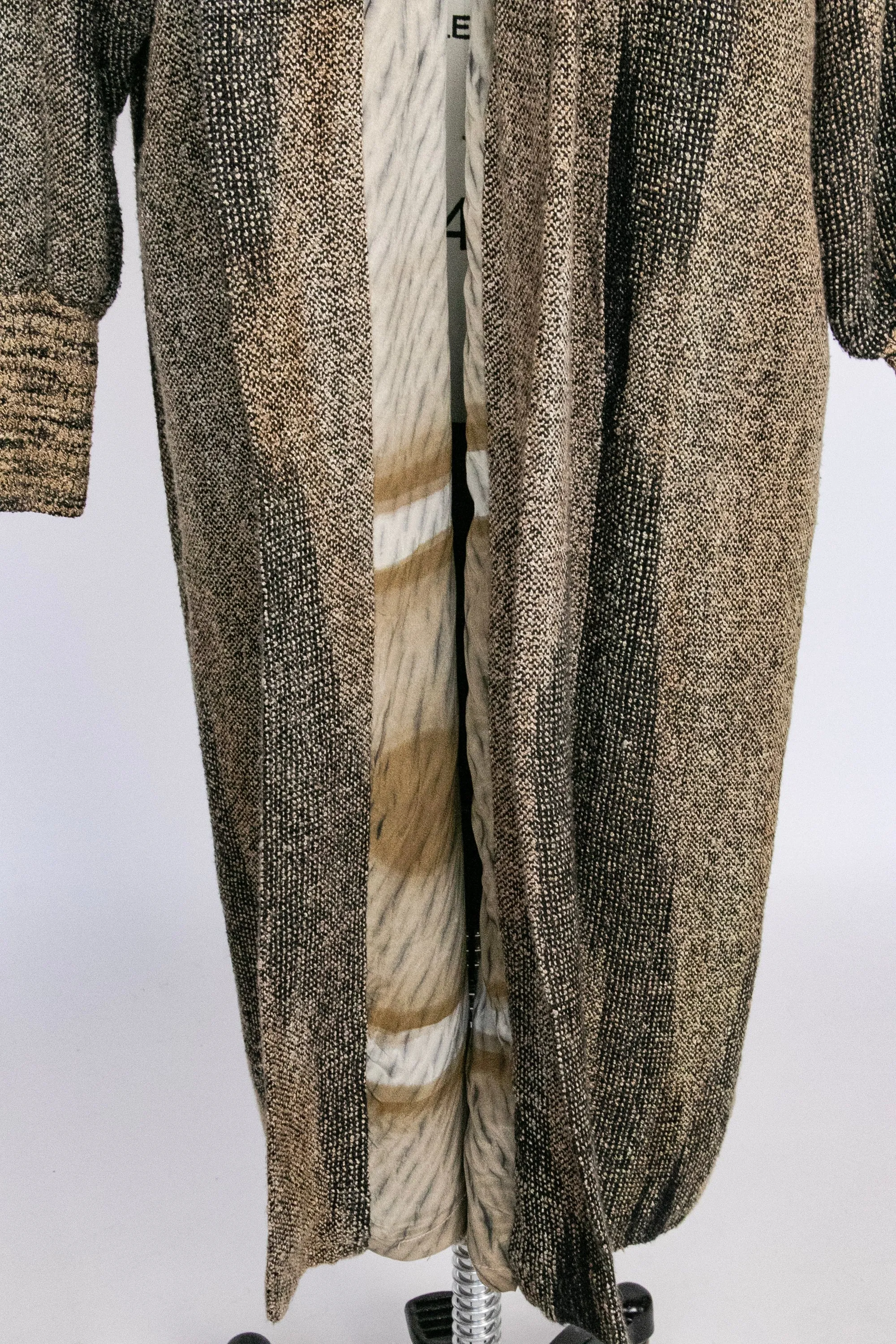 Incredible vintage 1980s oversized duster cardigan sweater by Jean McGee. Stunning hand woven silk knit wearable art piece that feels so luxurious and comfortable to wear. Long sleeves with wide fitted cuffs, open fit, attached removable shoulder pads, hangs open with no closures. Lined in stunning printed silk.