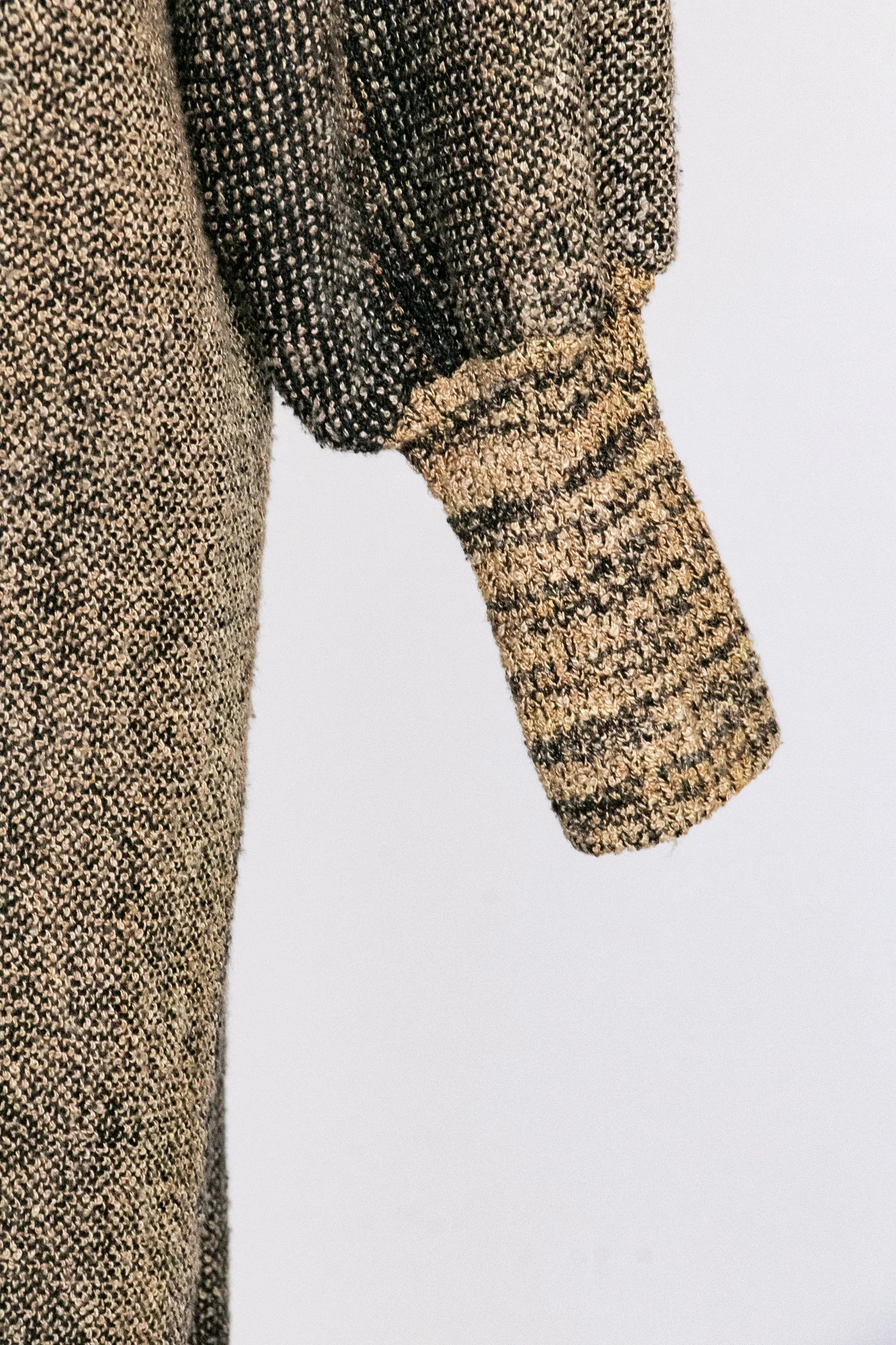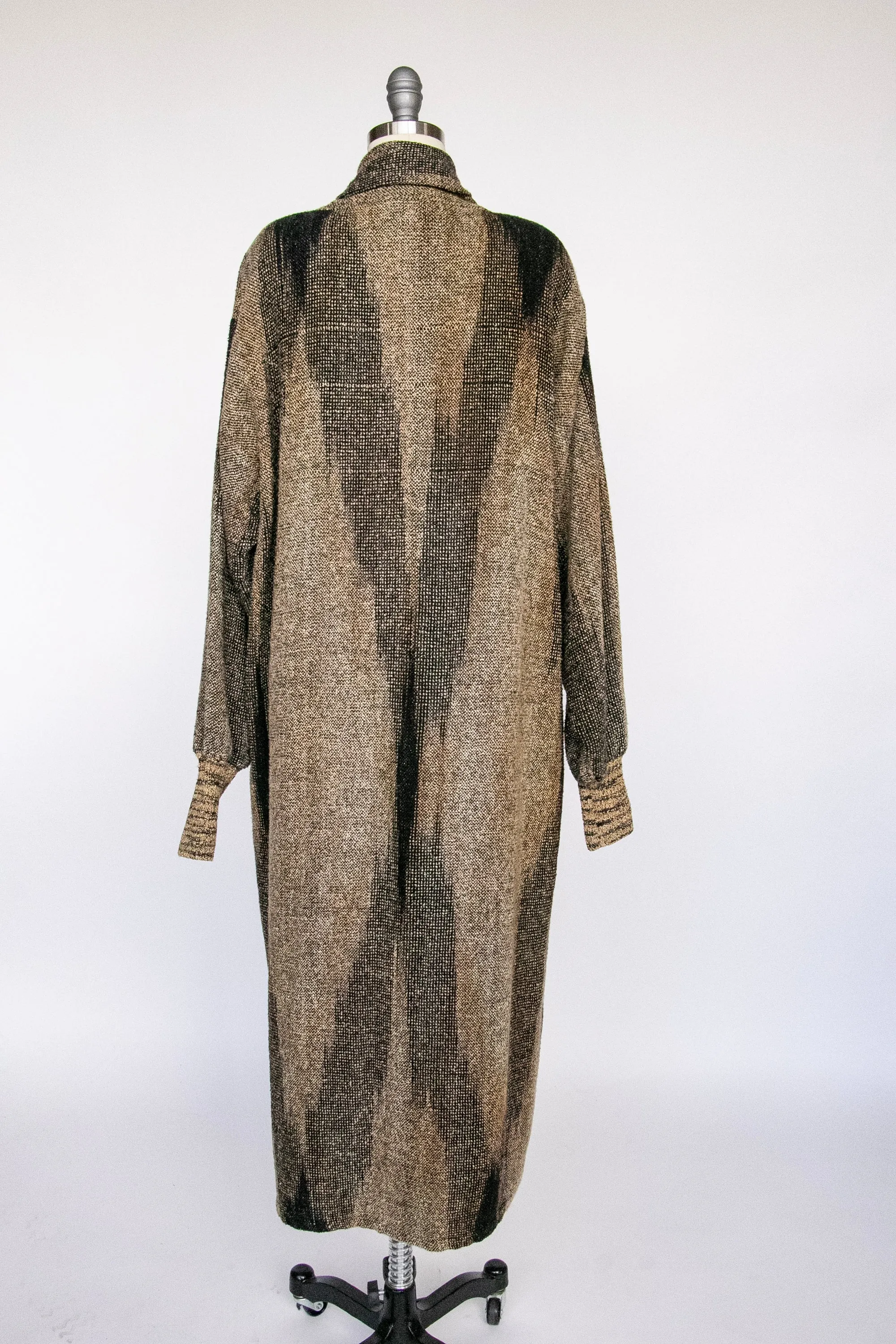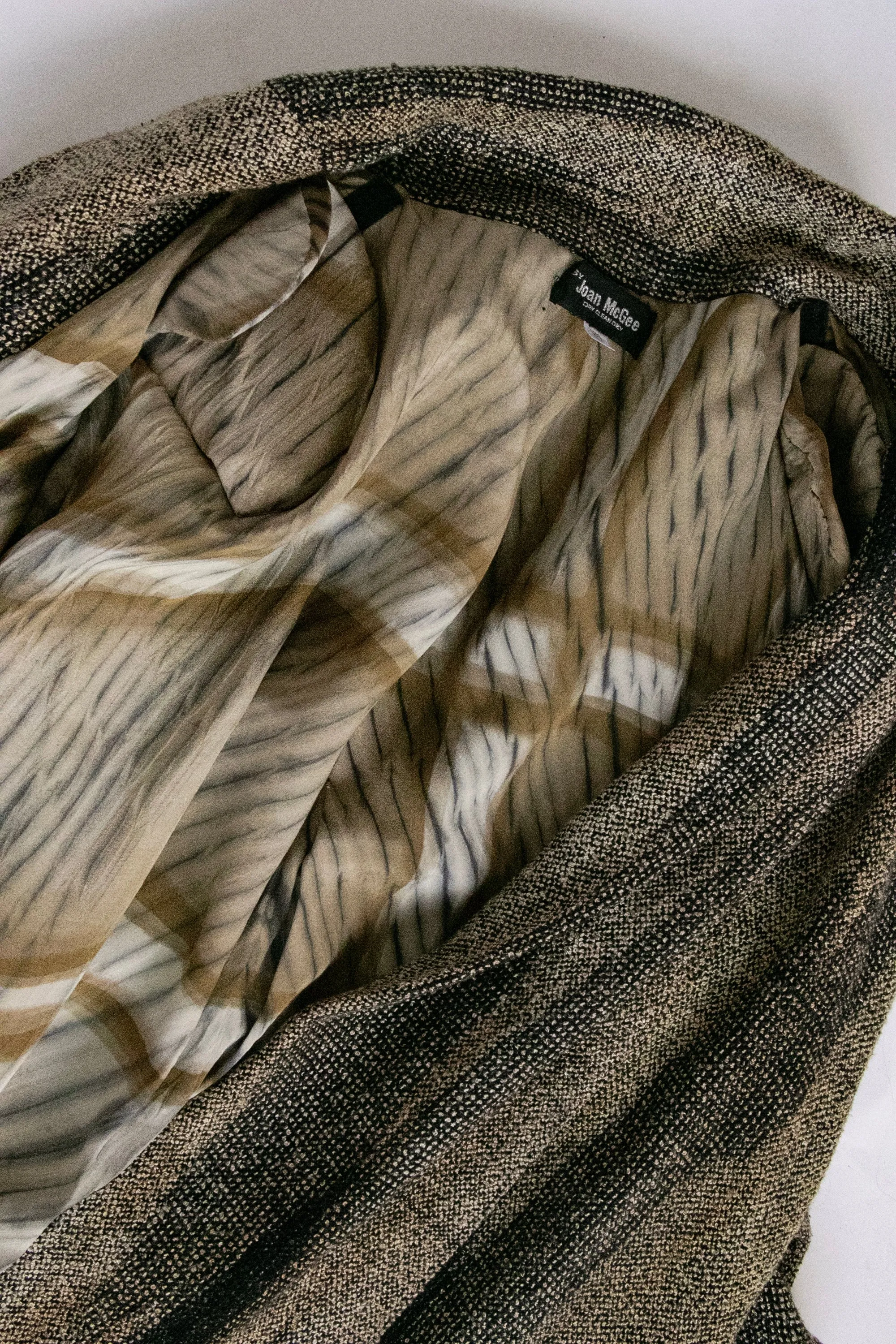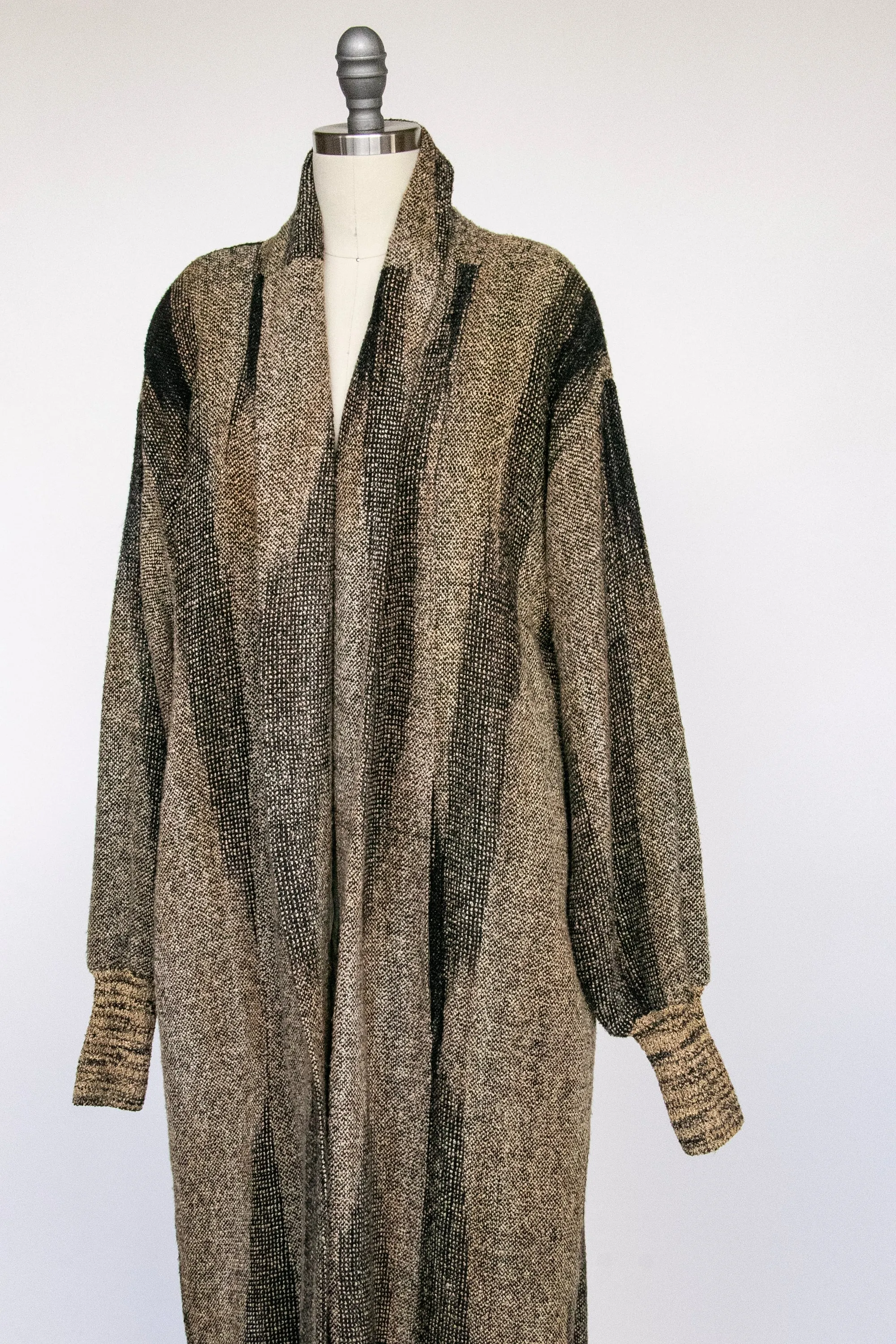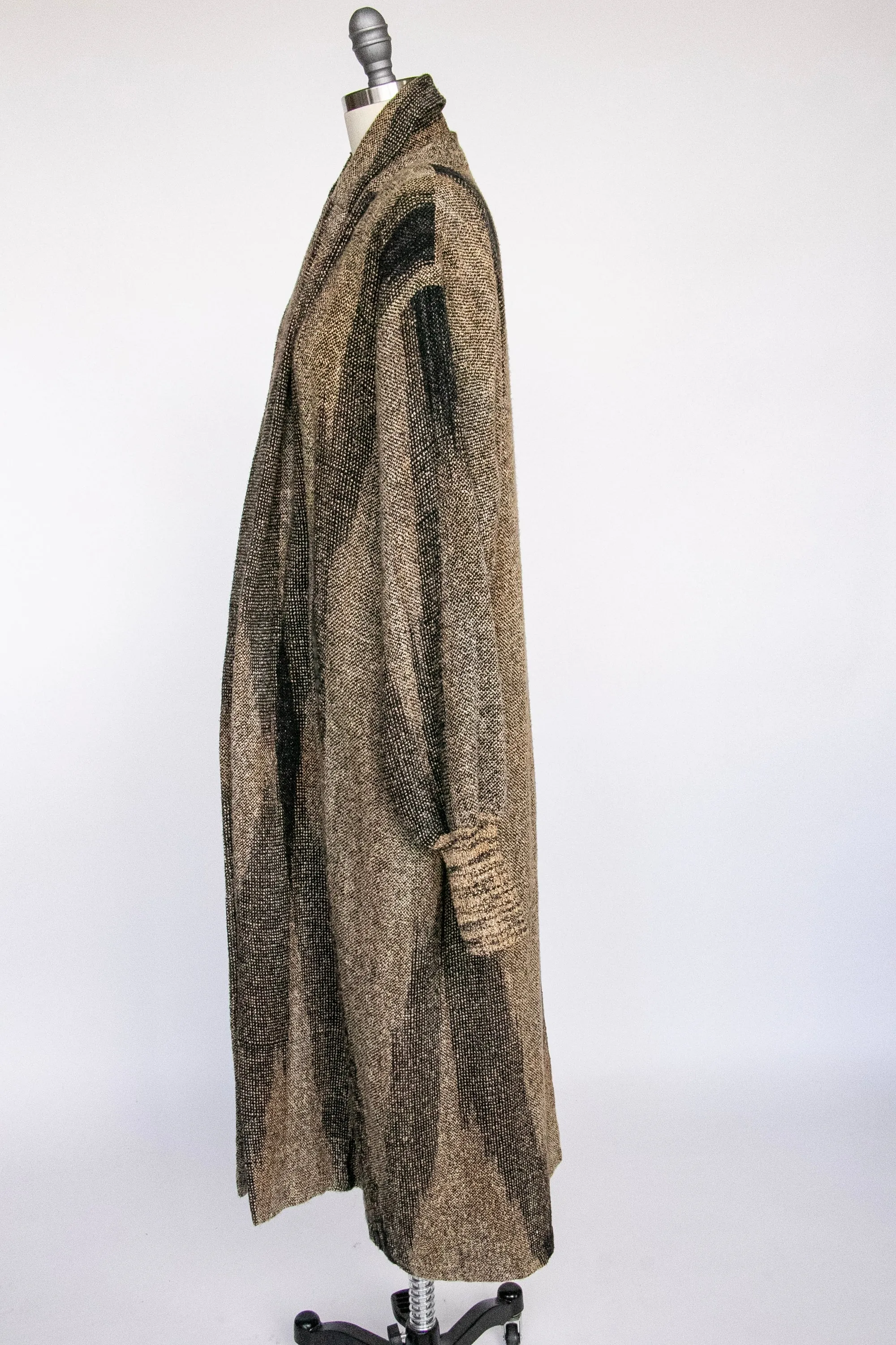 Incredible vintage 1980s oversized duster cardigan sweater by Jean McGee. Stunning hand woven silk knit wearable art piece that feels so luxurious and comfortable to wear. Long sleeves with wide fitted cuffs, open fit, attached removable shoulder pads, hangs open with no closures. Lined in stunning printed silk.