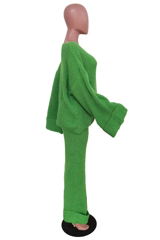Sexy sweater top long bell sleeves, v neckline, elasticized trim waist wide leg pants