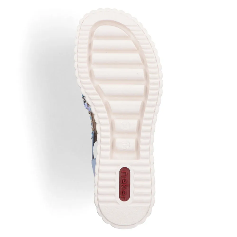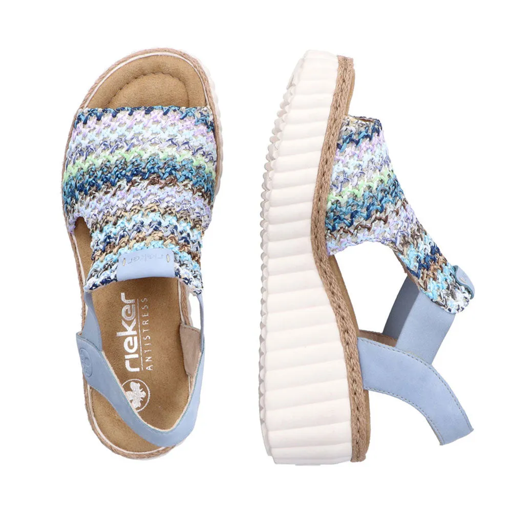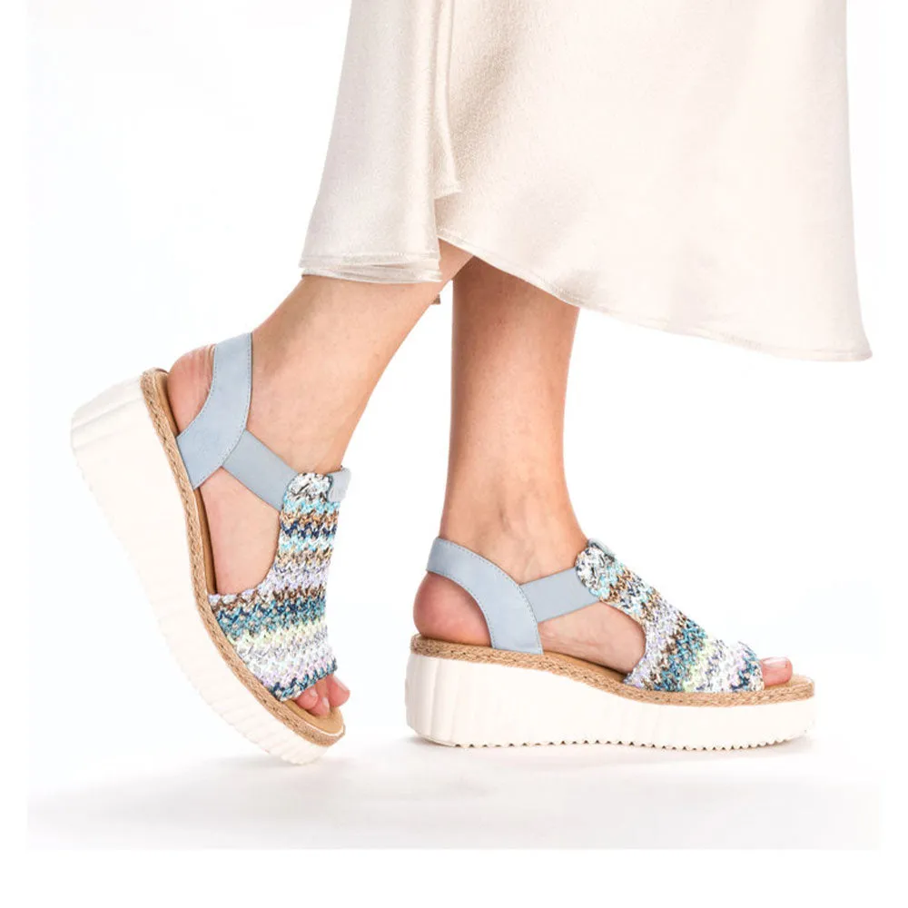 Rieker 69172 Women's Woven Platform Sandal features a colorful woven textile upper and elastic closure for a secure fit. Add a pop of color to your summer wardrobe with these sandals. The rubber sole and cushioned foot bed make these shoes comfortable to wear all day. Elevate a pair of jeans or pair with a sun dress for a casual summer outfit.