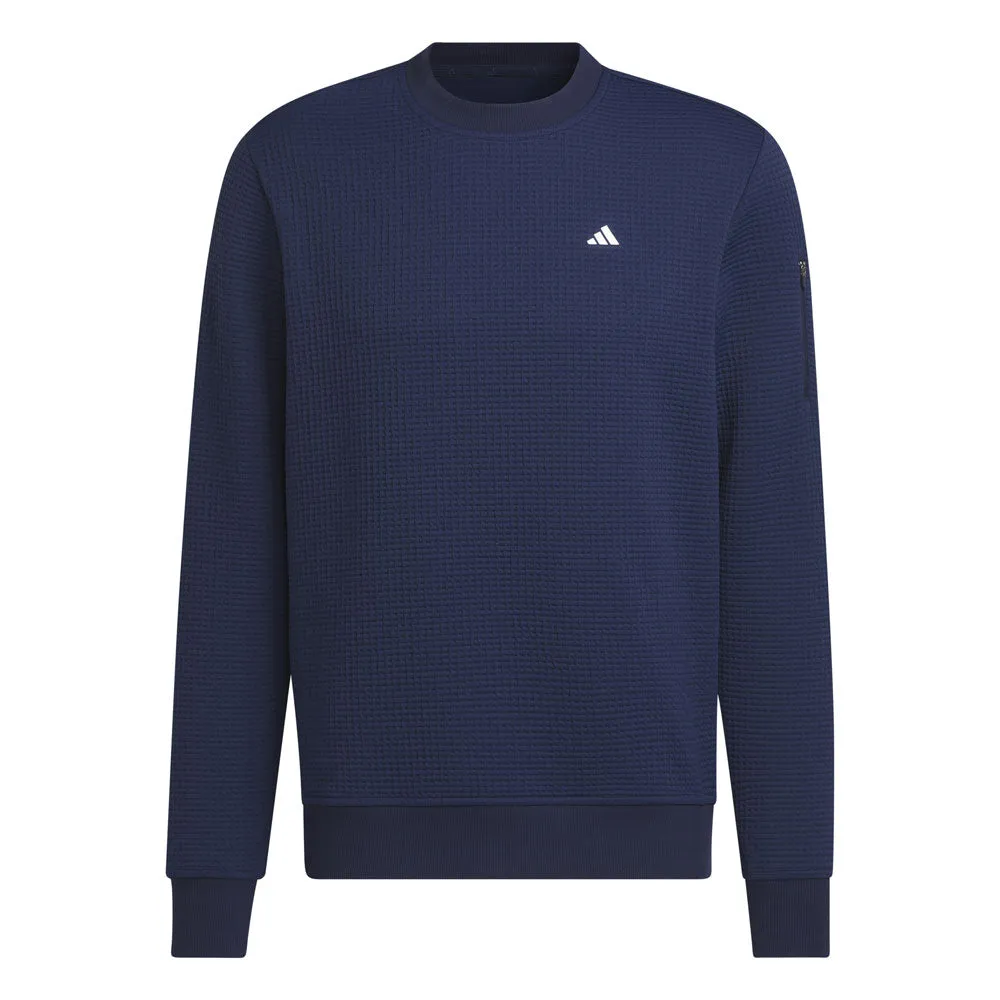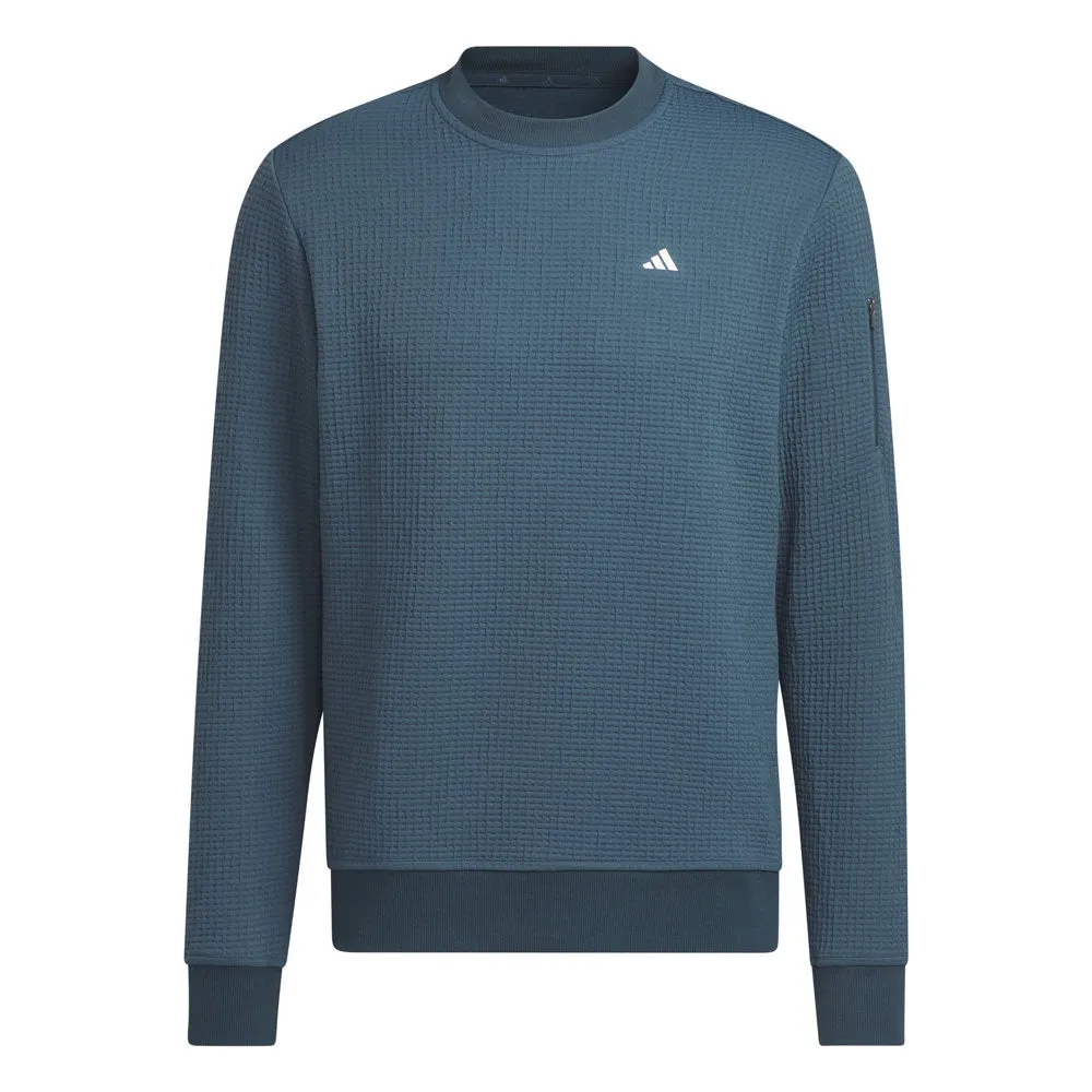 Simple style wins the day, especially when it's cold out there. Stay warm and focused in this adidas golf crewneck pullover. It's made with COLD.RDY to keep you warm so you can swing with confidence in cold conditions. Ribbed cuffs and hem help seal out the chill. A zip pocket on the upper sleeve stashes tees and markers for easy access. Made with 100% recycled materials, this product represents just one of our solutions to help end plastic waste.