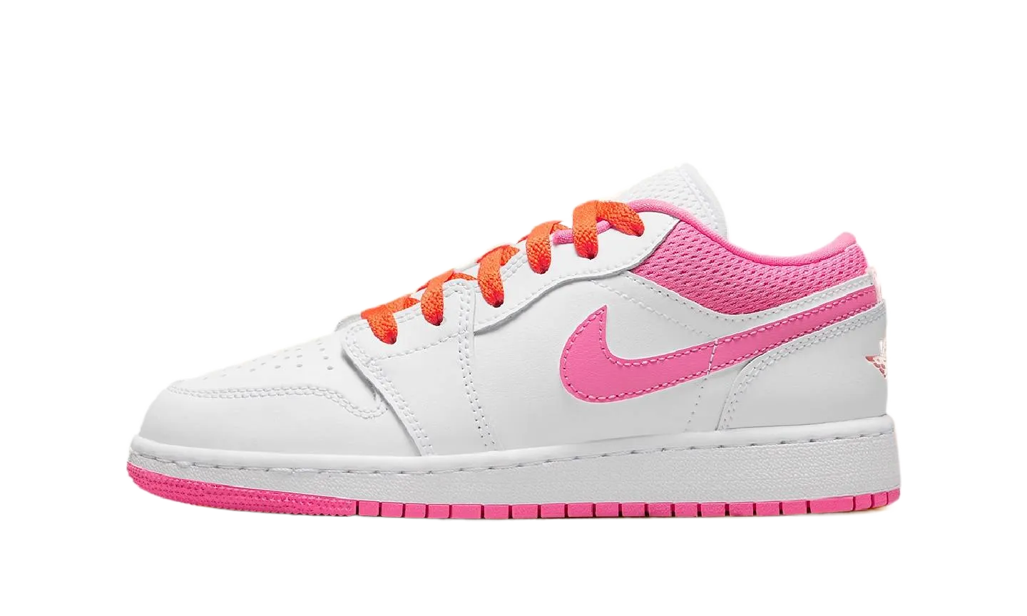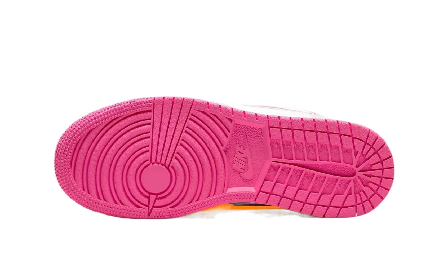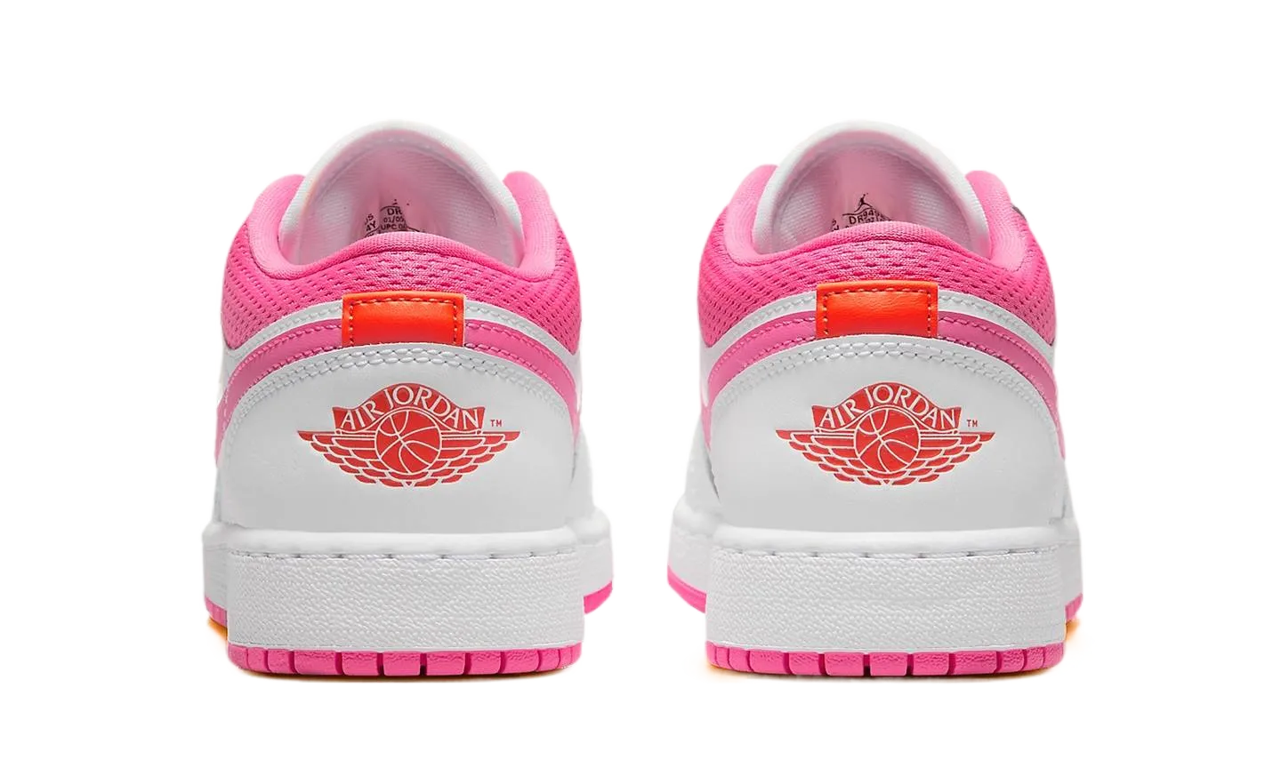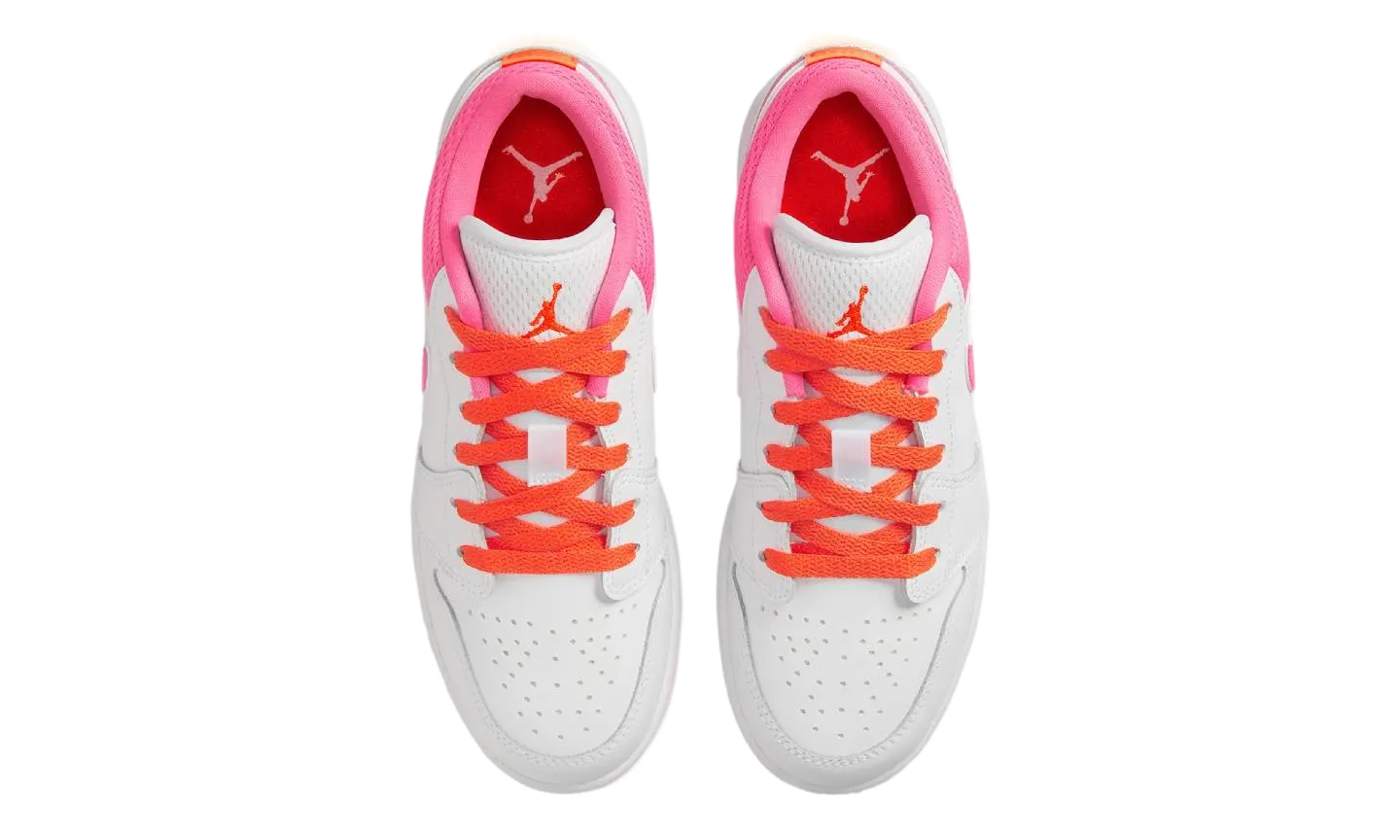 By way of its accents, the pair mirrors Dunkin’ Donuts’ signature colors. “Pinksicle” is used across three fixtures — the Swoosh, mesh collar, and outsole — while “Safety Orange” pops just adjacent, lacing up the shoe and threading the embroidered Jumpman. The rest of the construction is much less colorful, as it applies white neutrals to the leather upper, tongue, and midsole.