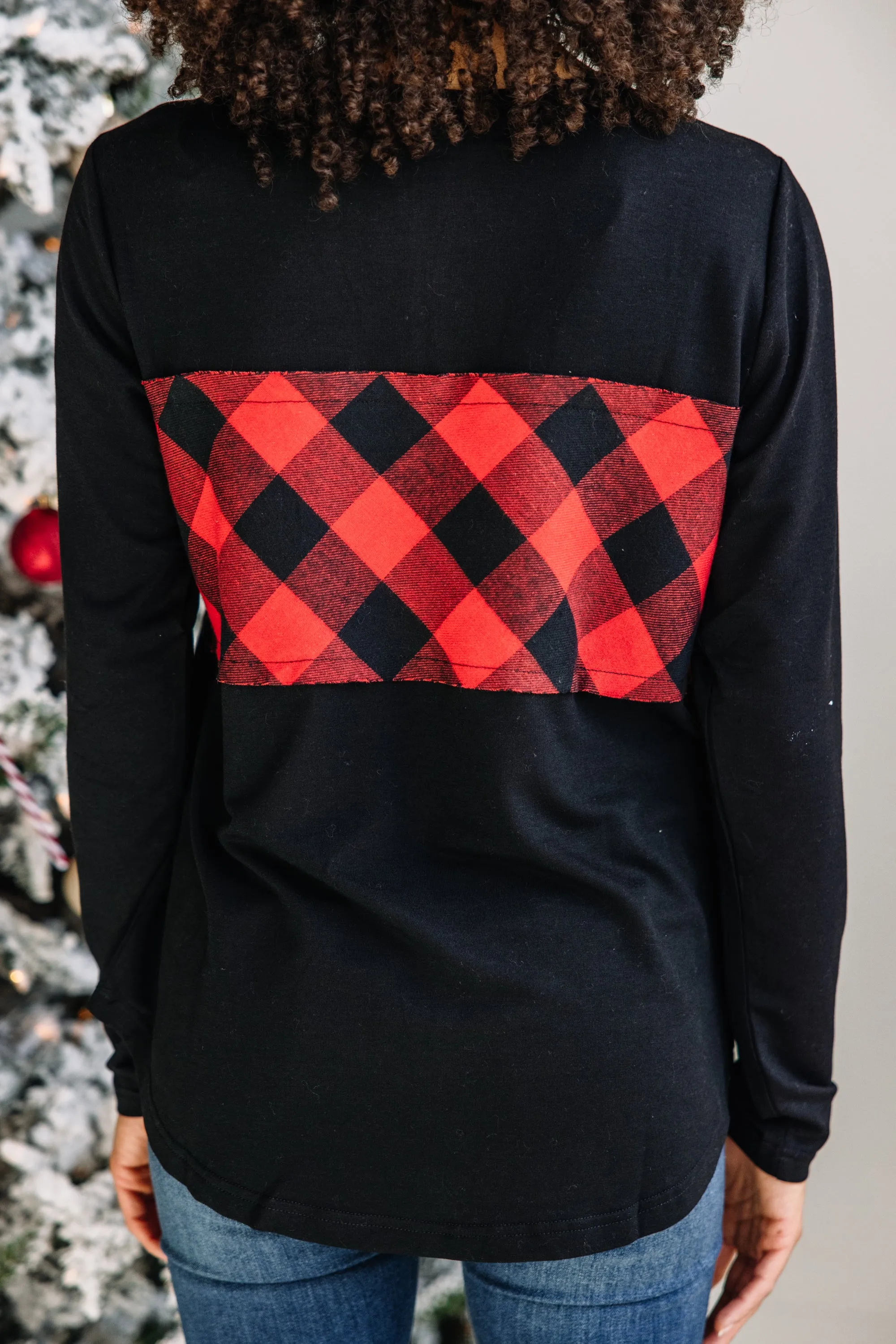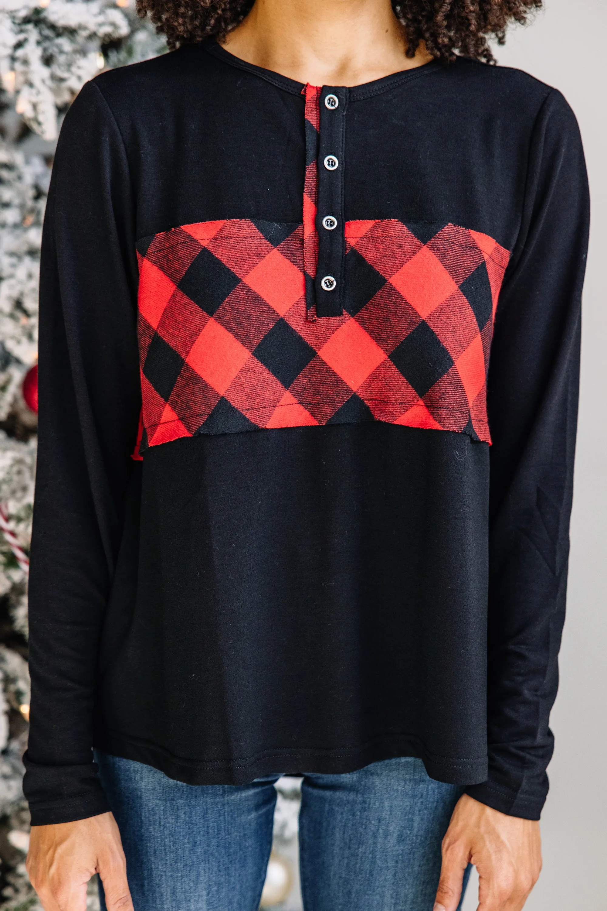 This pullover is all for fun! It's so comfy and casual! We love the classic simple fit and the pop of buffalo plaid across the chest is perfectly festive! This comfy pullover is perfect for any causal day! This pullover features long sleeves, a henley neckline, and a buffalo plaid print.