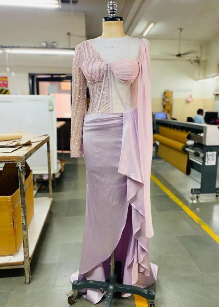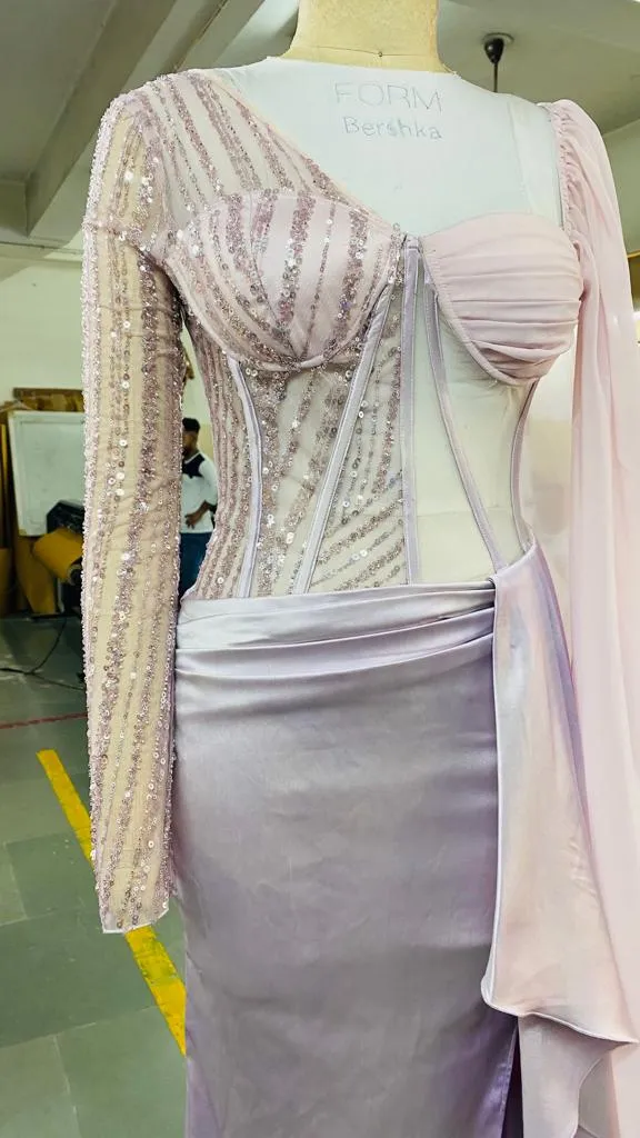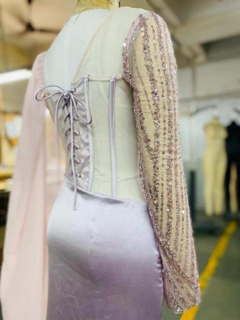Say hello to the latest addition to the lea Luxe family, our Althea Lavender Embroidered Corset Gown. Made with a luxurious lavender Celina satin, mesh, and chiffon fabric, our Althea comes with our signature boned corsetry with bustier detailing, asymmetrical sleeves in mesh and chiffon, and a bodice with sheer panels adorned with breathtaking, monochrome embroidery. A draped skirt with a thigh-high slit, waterfall panel, and an elegant trail completes this mesmerising look!