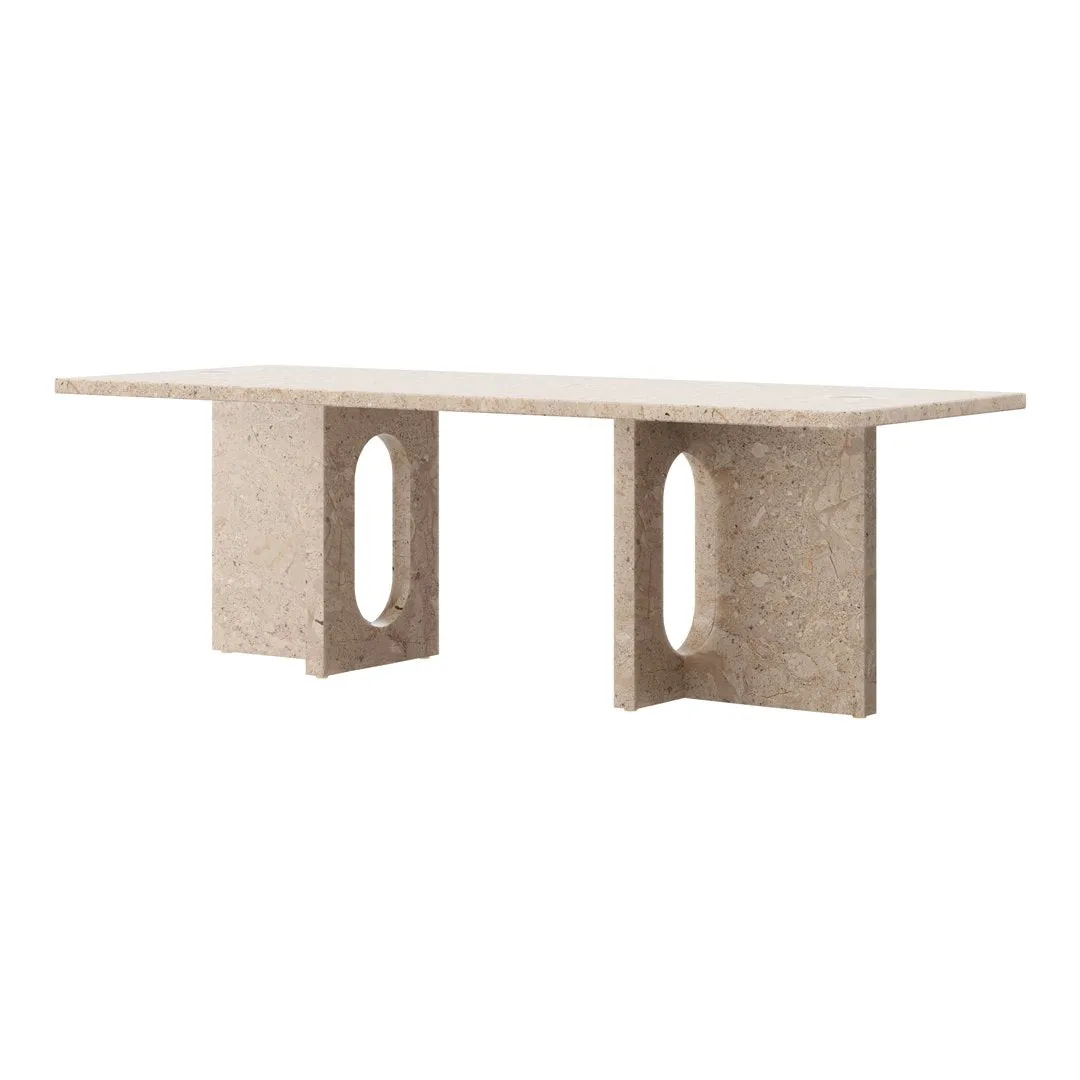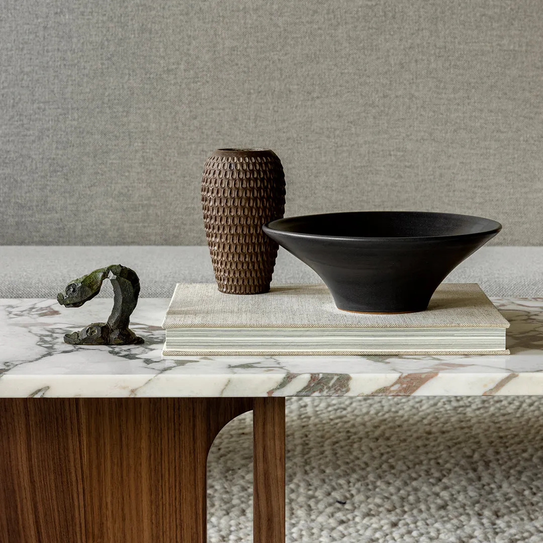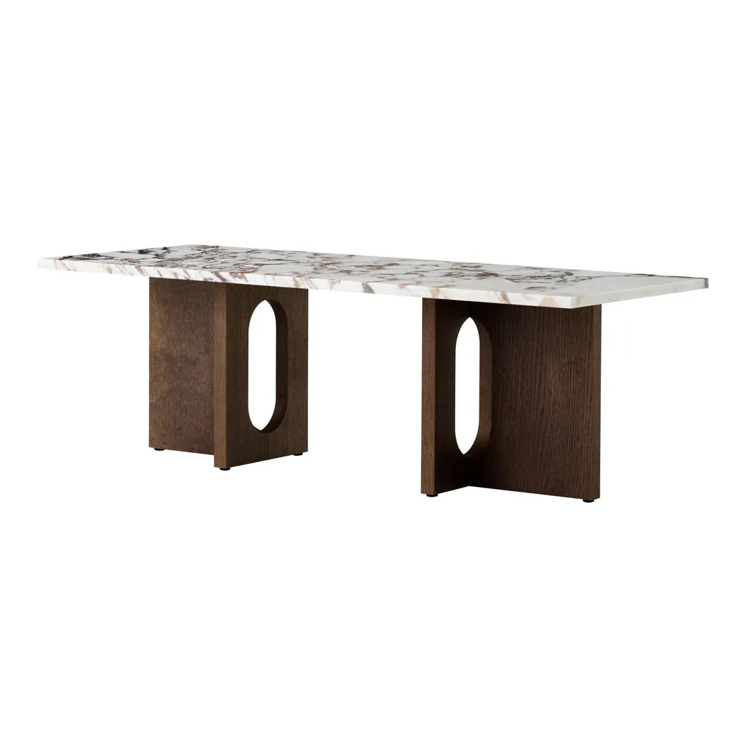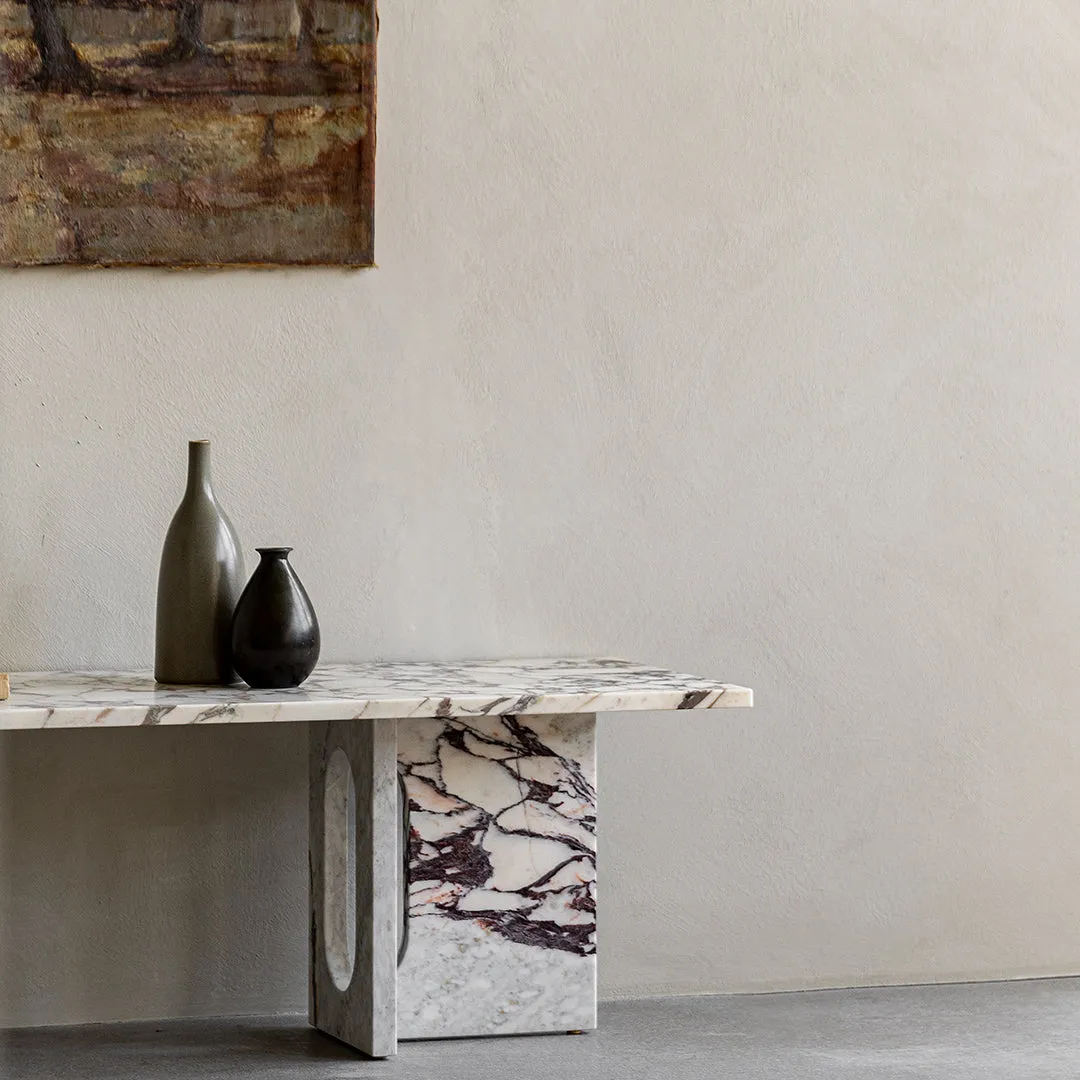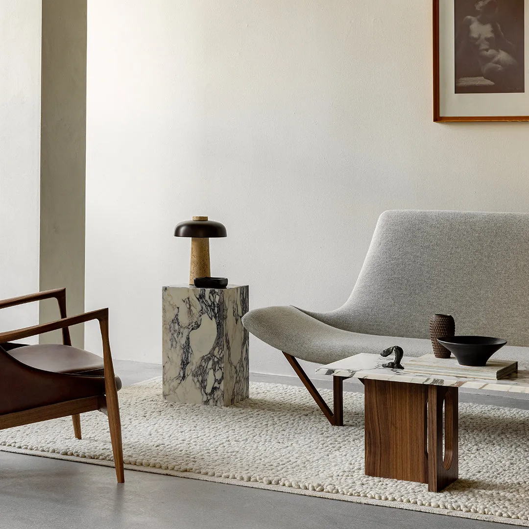 MENU's Androgyne Collection is distinguished by its playful, yet elegant silhouette and considered combination of natural materials. The invention of the Copenhagen-based Norwegian architect and designer Danielle Siggerud, its blend of the masculine and feminine, true androgyny, is what lends the collection its name. Like a magnificent monument, the new Androgyne Dining Table pairs oak and stone to striking effect. The bold and confident take on a dining table amplifies the silhouette of the collection's popular side table to grander proportions thanks to an elegant oak base, available in natural or dark stained, and a table top in corresponding wood or kunis breccia, an artistic blend of stones in warm tones that create subtle texture and add a new dimension to the design. A table not for the faint of heart, it makes a characterful accent in any space, from a domestic dining room to a modern restaurant or office gathering point, and serves multiple functions to bring a timeless quality to the design.