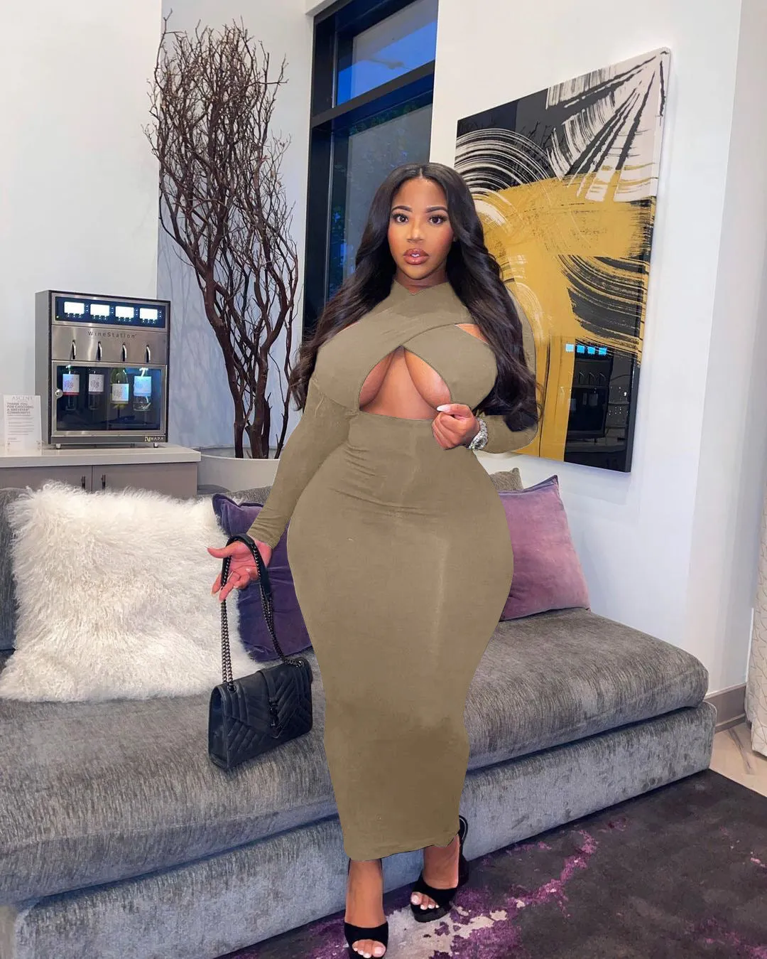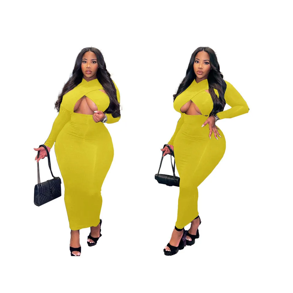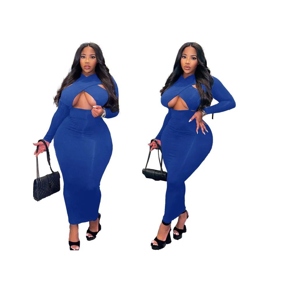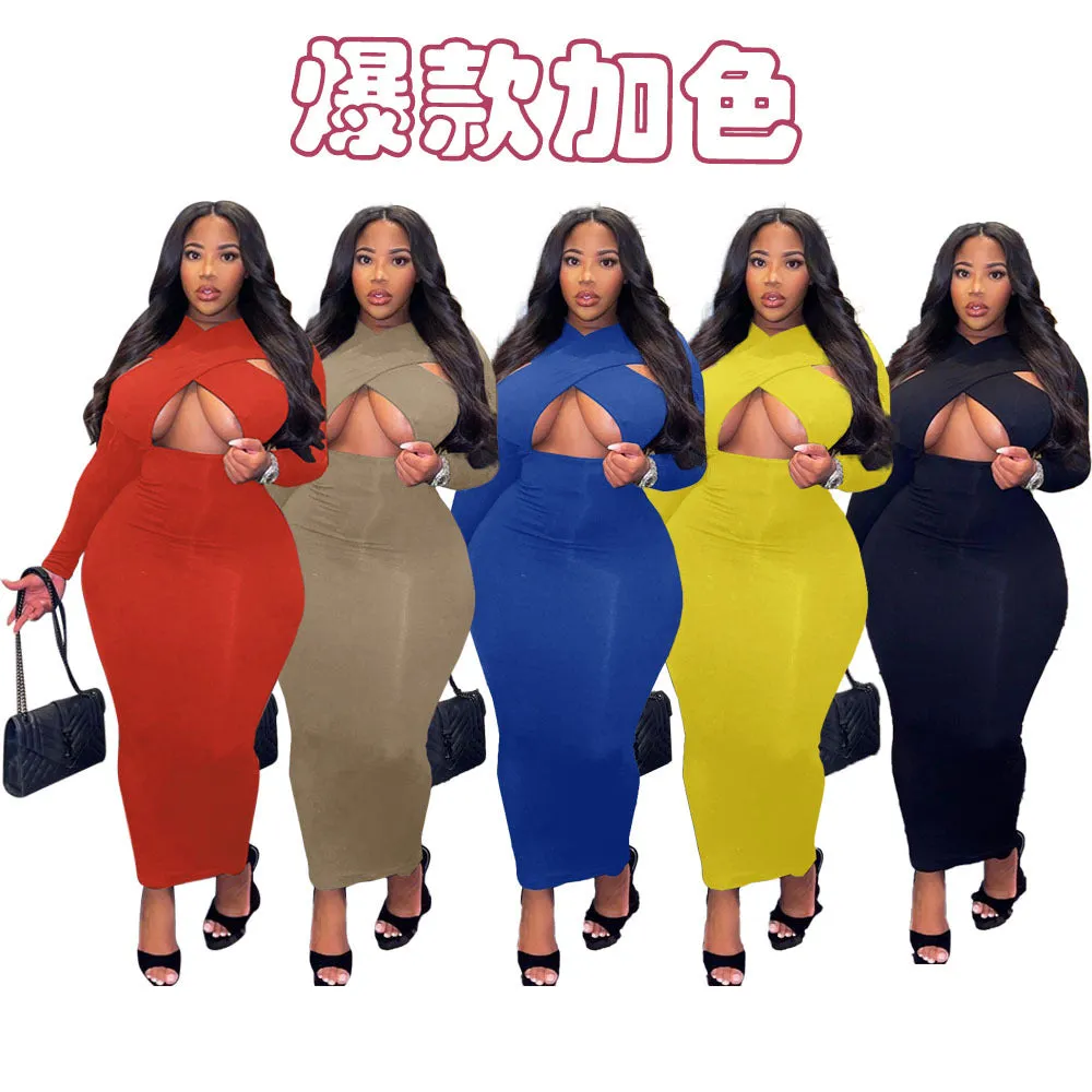 autumn and winter clothing cross-wrapped long-sleeved solid color casual fashion dress ladies plus size women's clothing
