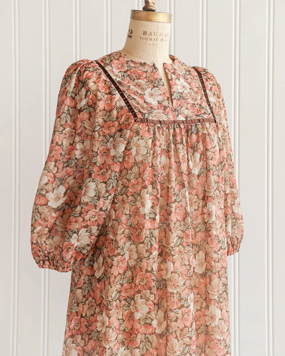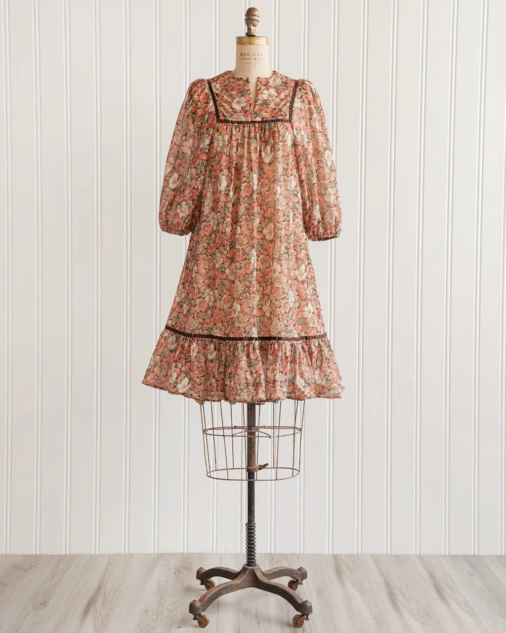 Perfect for the woman whom Autumn eternally lives in her heart, this vintage 1970s brown floral print boho peasant midi dress features a heavy floral print of dusky coral, pink, cream, and ruddy brown. This vintage 70s dress features notched round neckline, puffed peasant sleeves, a-line silhouette, and flounce ruffle hem.