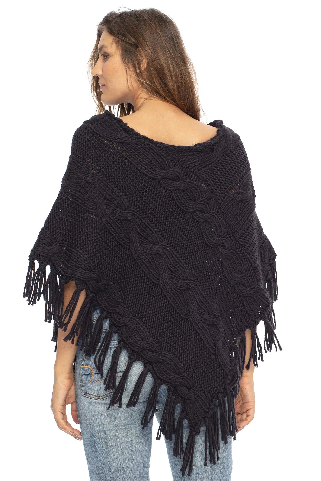 - BOHO INSPIRED FRINGED HEM and diagonal cable knit gives this ladies knitted poncho a fun, modern, look. The V shaped cut is flattering to all figure types. One size fits most