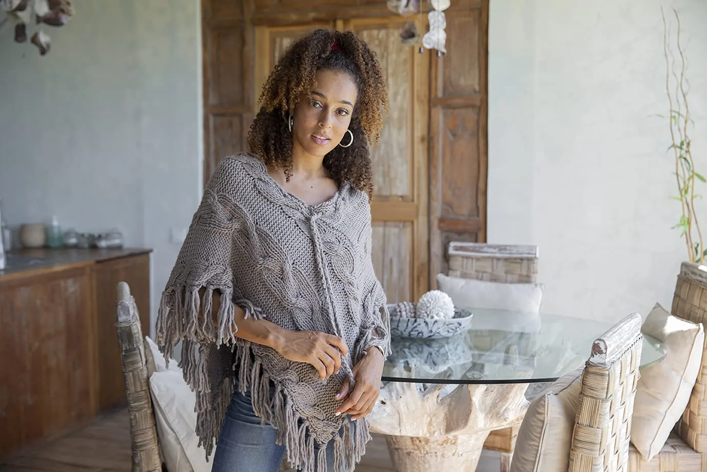 Made from luxuriously soft-as-cotton acrylic knit, this boho inspired poncho cape has a fringed hem with matching tassels at the neck, giving it a fun, modern, look.