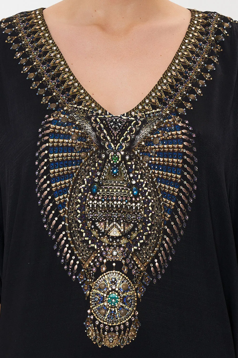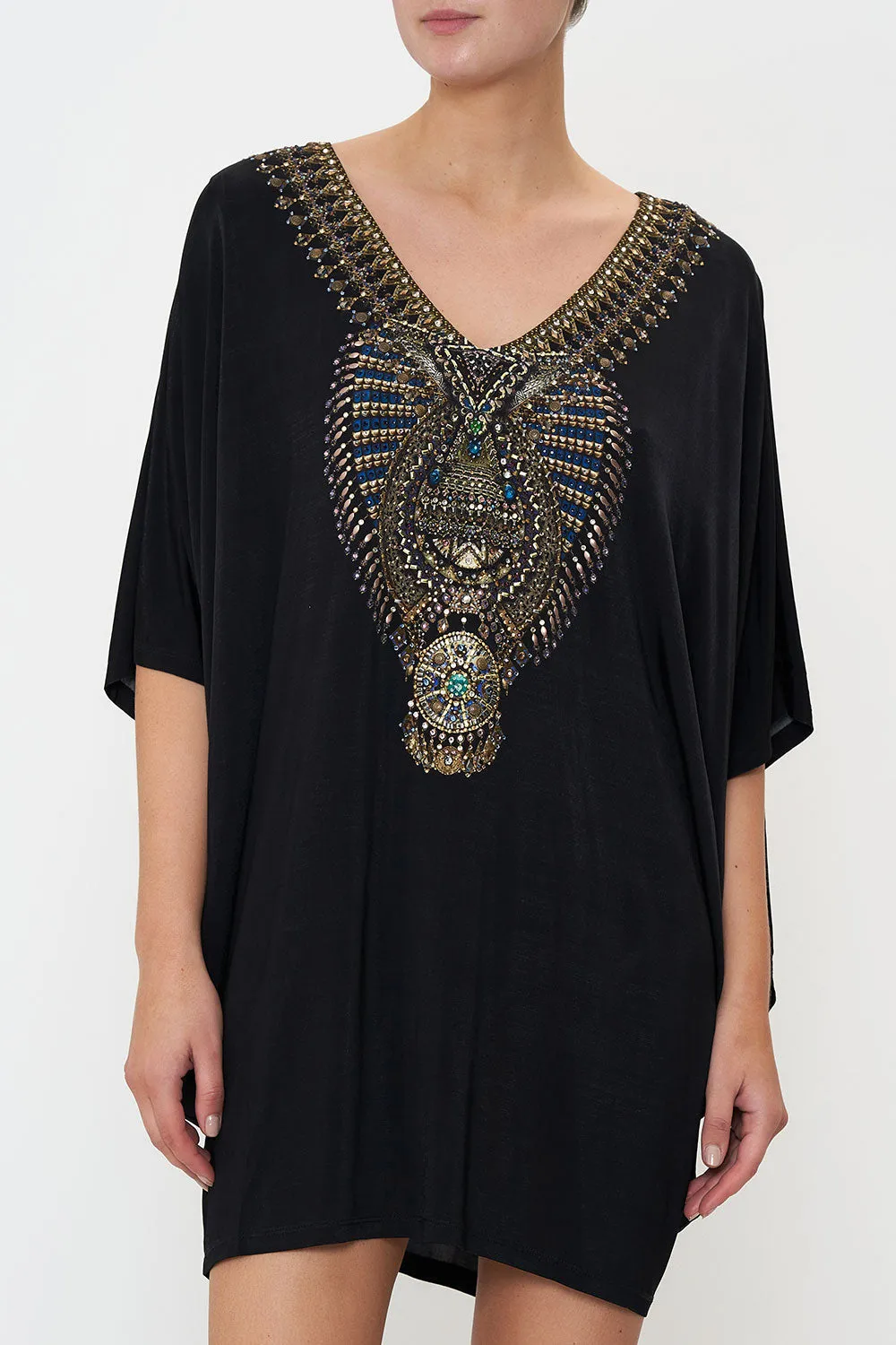 Deep midnight hues meet intricate detailing, the Knight Of The Wild Bat Sleeve Dress sports a sea of black adorning hand-embellished gold CAMILLA crystals. An elevated take on everyday comforts, this luxury mini dress plays host to a relaxed silhouette, cropped sleeves that dance at the elbows, a contrasting deep v neckline and side draped details.