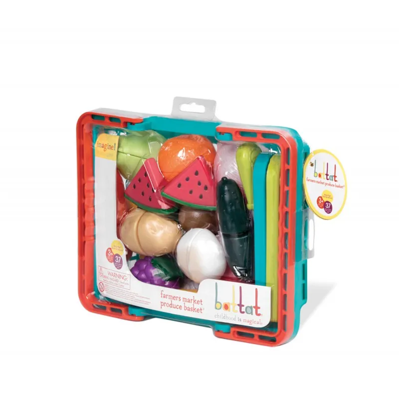 Whether it's fresh tomatoes or big round potatoes, your toddler will love pretend play grocery store with the Battat Famers market basket. Filled with plastic play food, 2 cutting boards and 2 safe plastic knives to cut fruits and vegetables, this basket is easy to grab and bring anywhere.