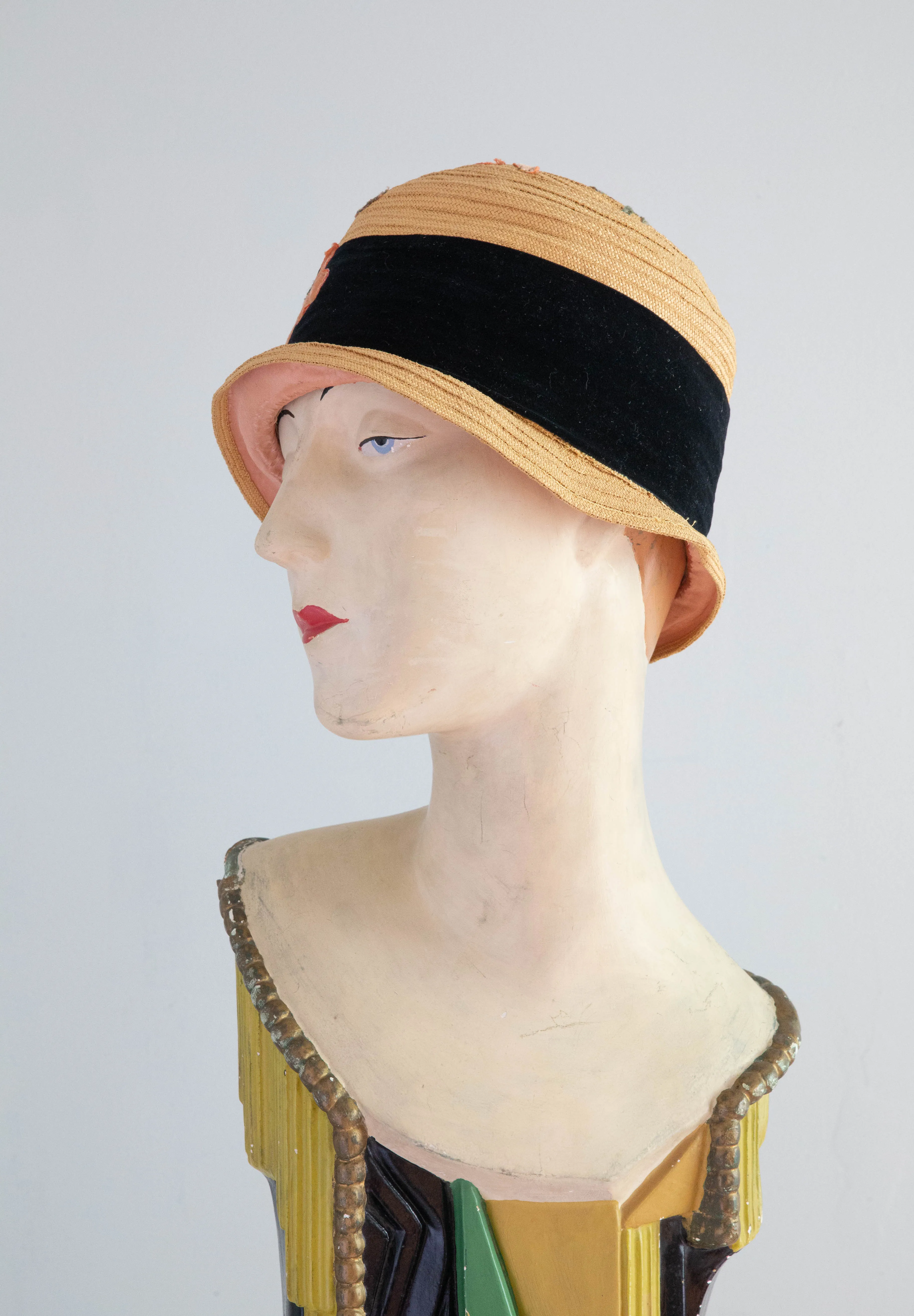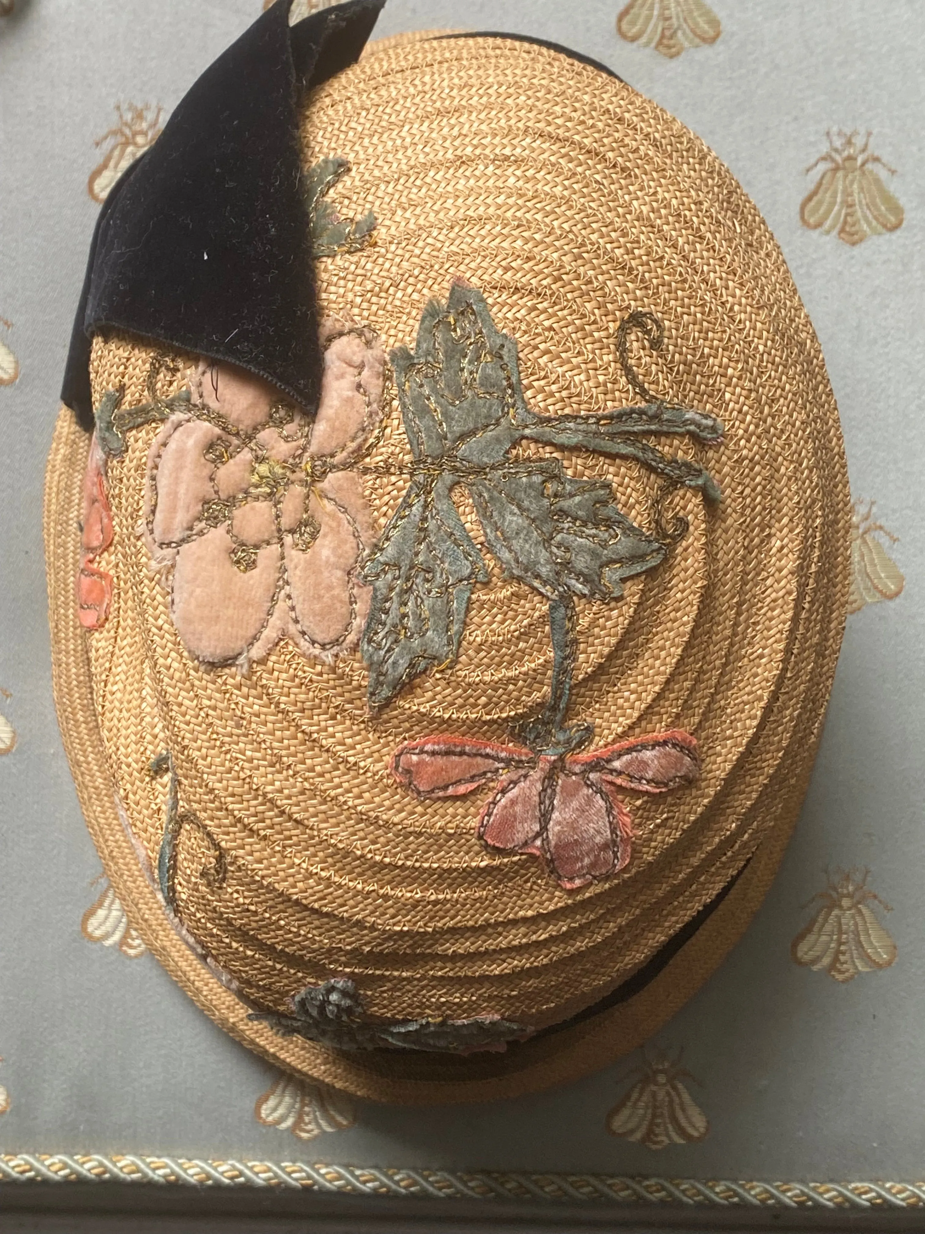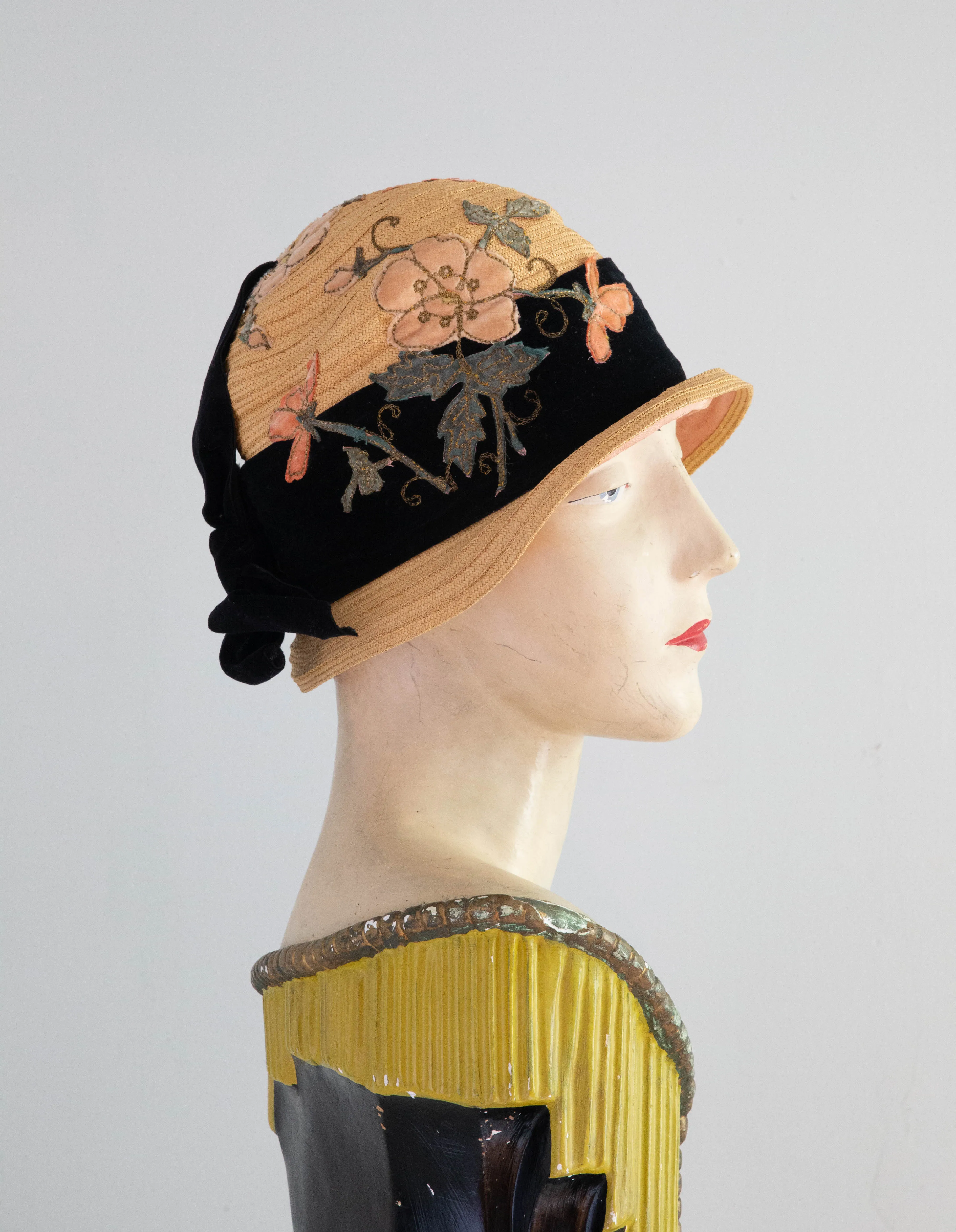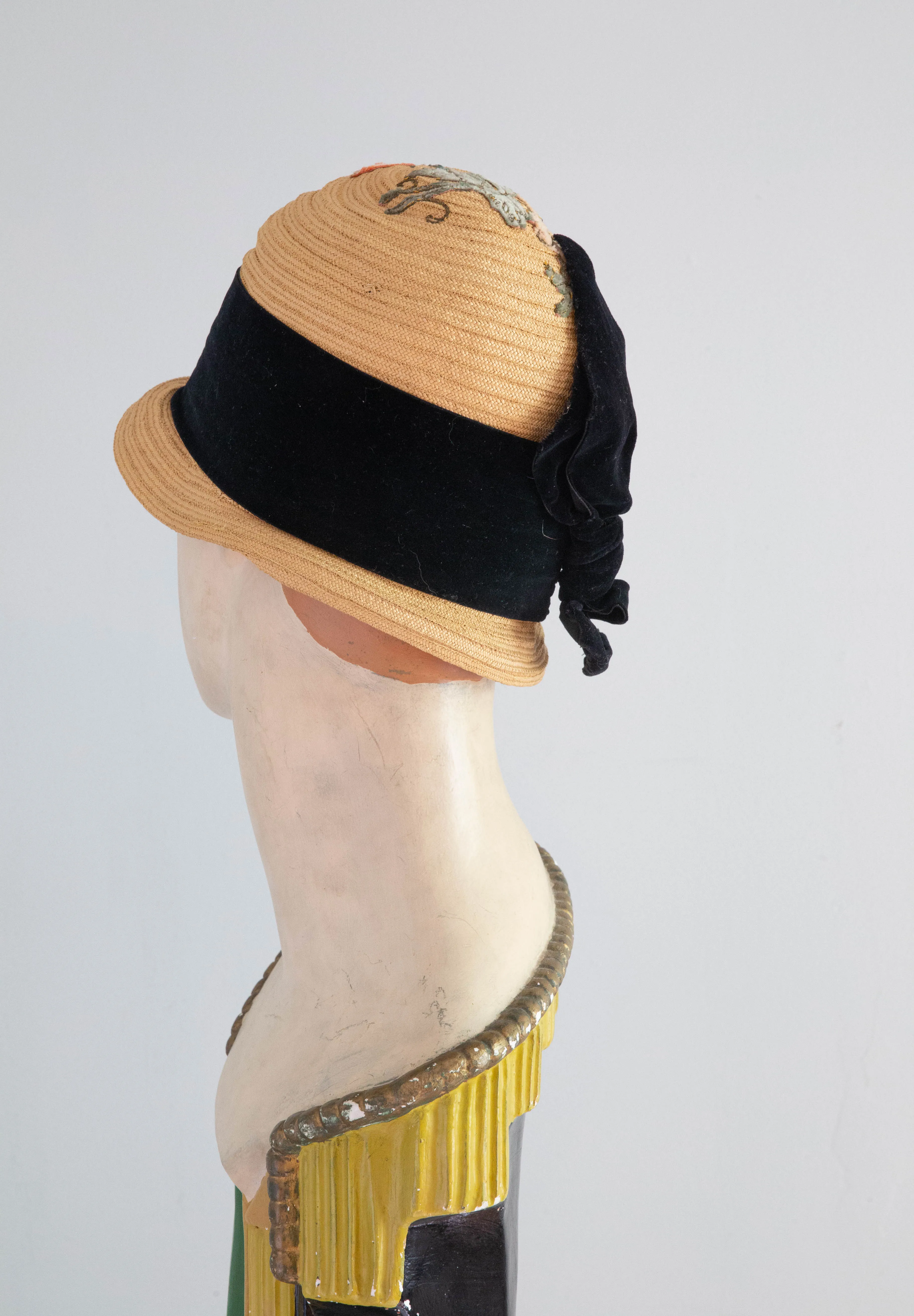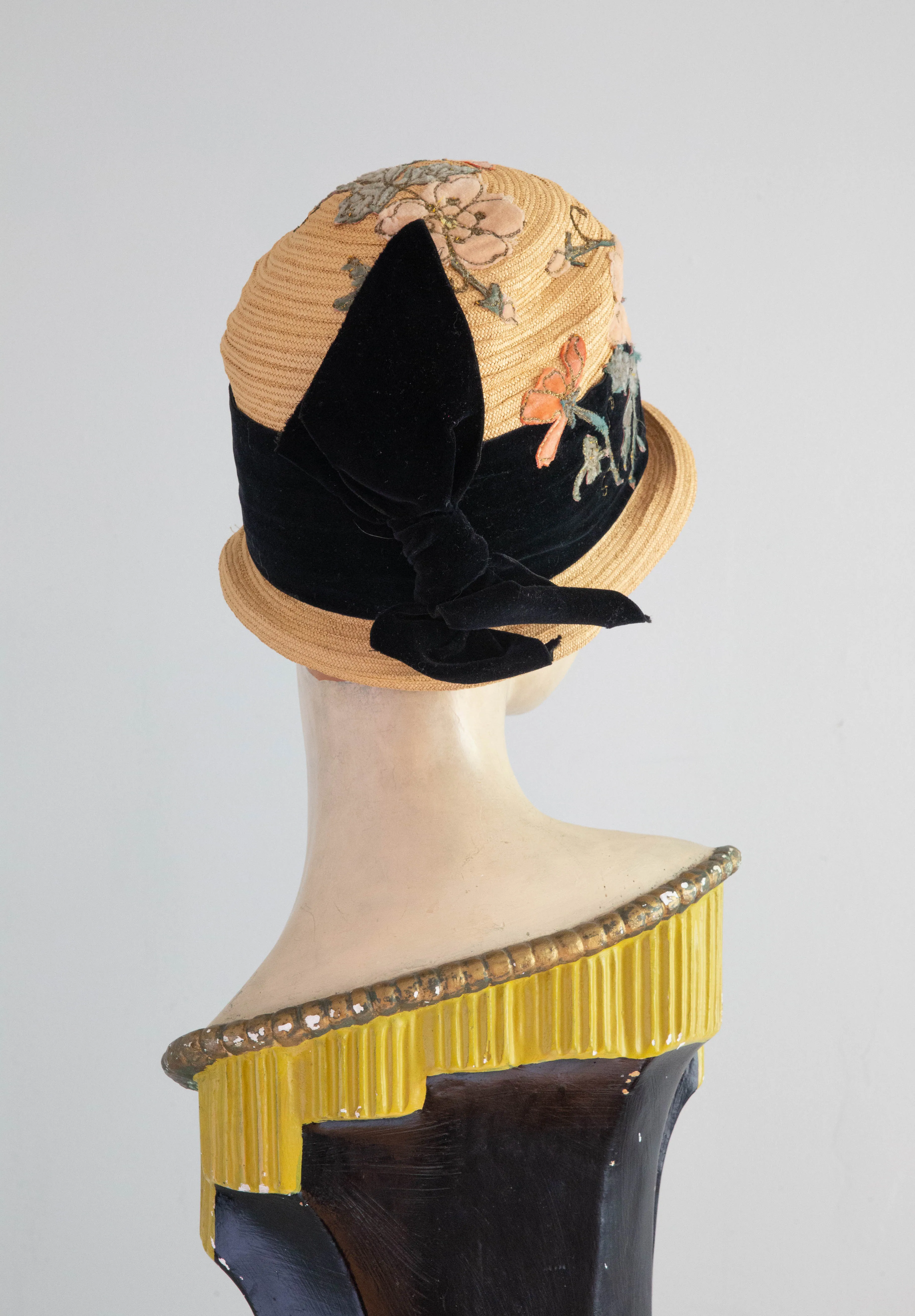 Beautiful 1920's straw cloche featuring colorful floral velvet appliques and a black velvet band and bow. Sits low on the head and frames the face with a short brim lined in pink silk. Lined in a pale pink silk. Made by Premier Importers. In overall excellent condition for age. Clean and ready to wear.