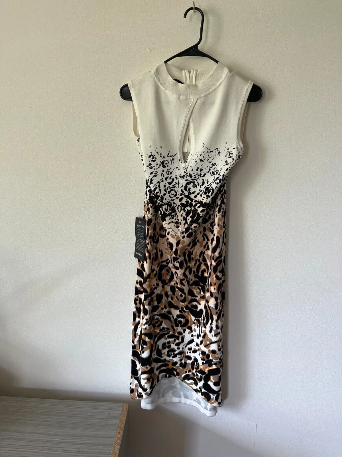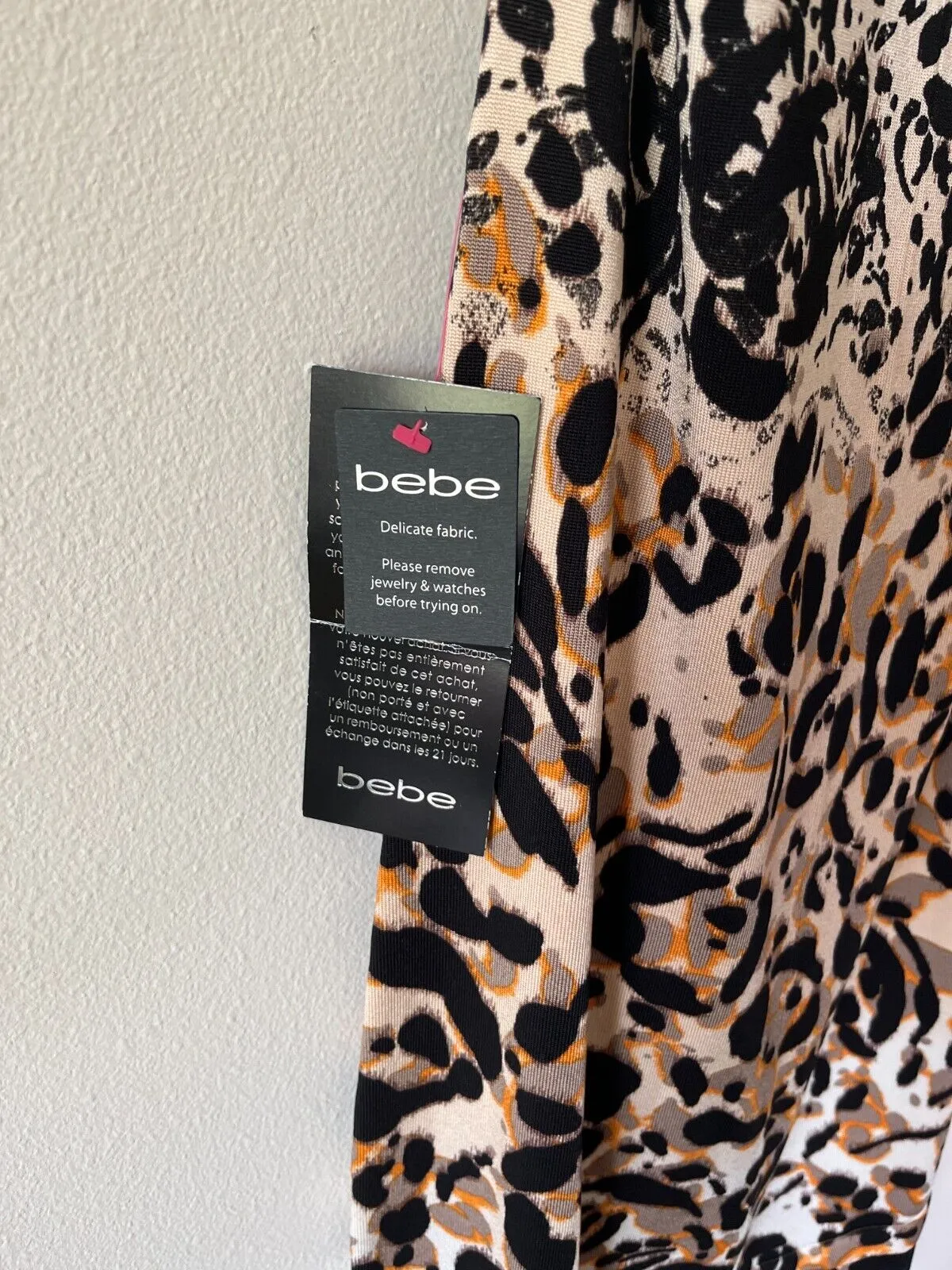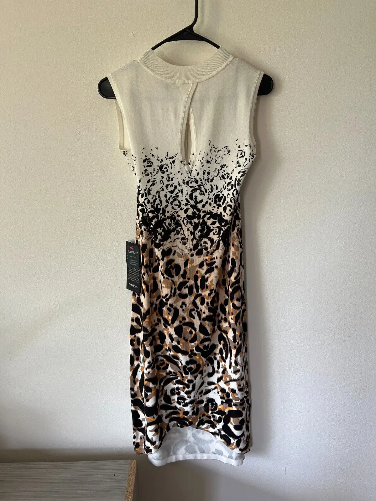 brand new BEBE cocktail dress. NWT. Unique ombre print cream to leopard print- back zip- keyhole opening in front- sleeveless- stretchy knit fabric for comfort- these dresses retail for over 100$