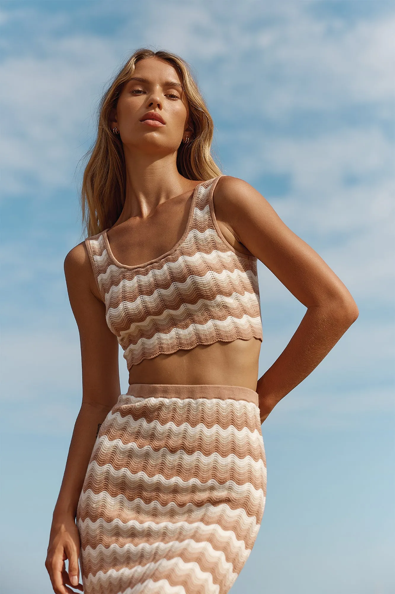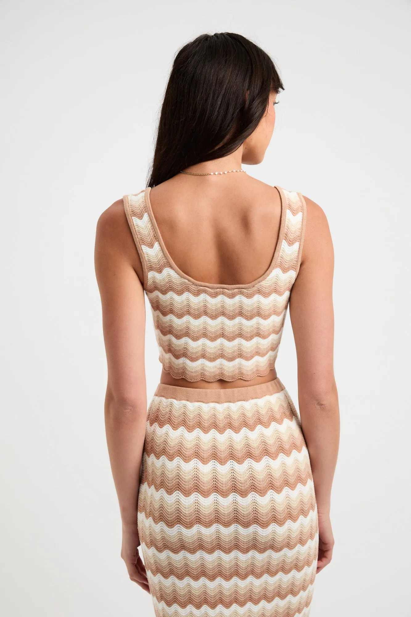 A lightweight summer staple, the Beckett Bralette is as comfortable as it is stylish. This zig-zag print is knitted in hues of beige and white cut from a stretchy cotton blend. Fitted with thick straps, this scoop-neck crop features beige trims at the neckline and armholes. Note the bralette’s scalloped hemline evoking elevated detail.