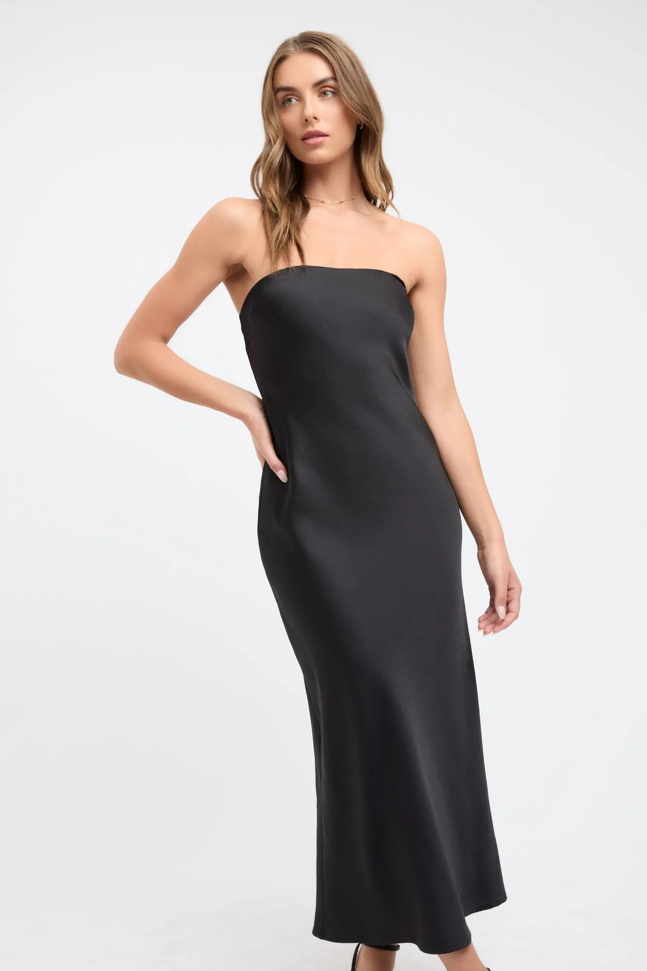 This slip style dress is the perfect cocktail dress. In a black silk-like fabrication, the Belle Strapless Slip Dress features an all-over shiny finish. Fitted at the bust and cinched at the waist, this slip silhouette completes the elegant look with a fluted hemline.