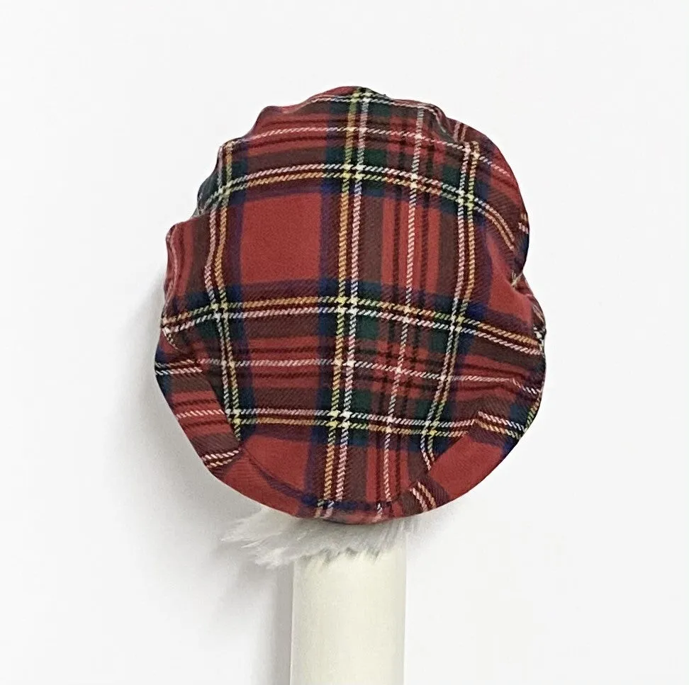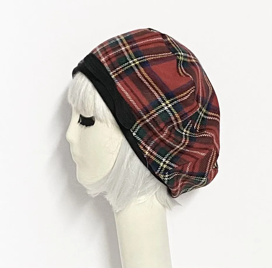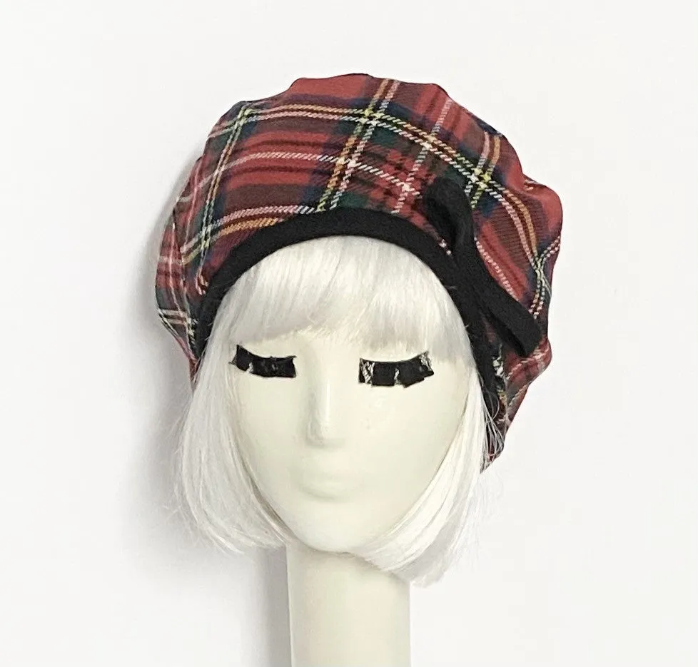 Oversized beret hat vintage light weight soft tartan plaid wool, with wool bow, slouchy beret hat with with a 1/2" band lined rayon print with 1" soft elastic band inside.