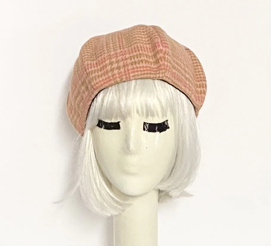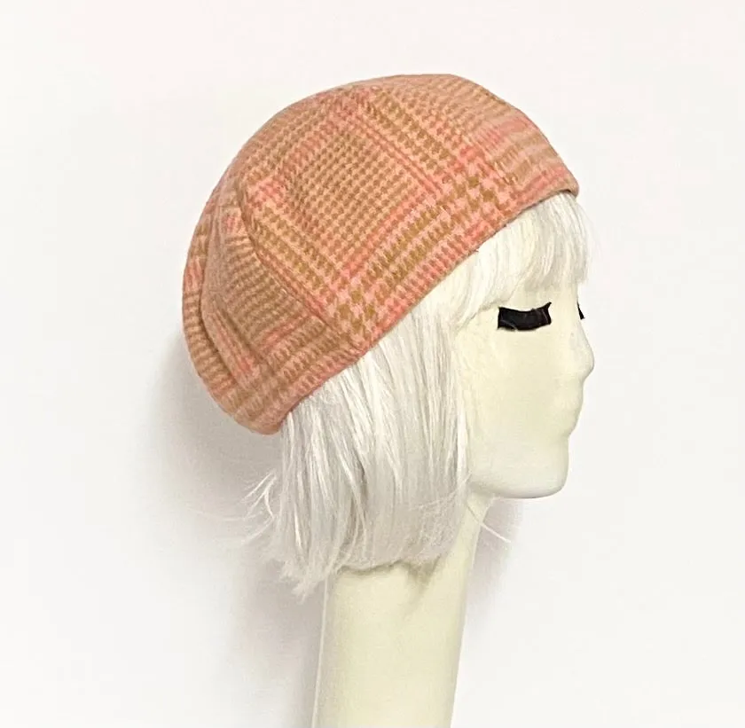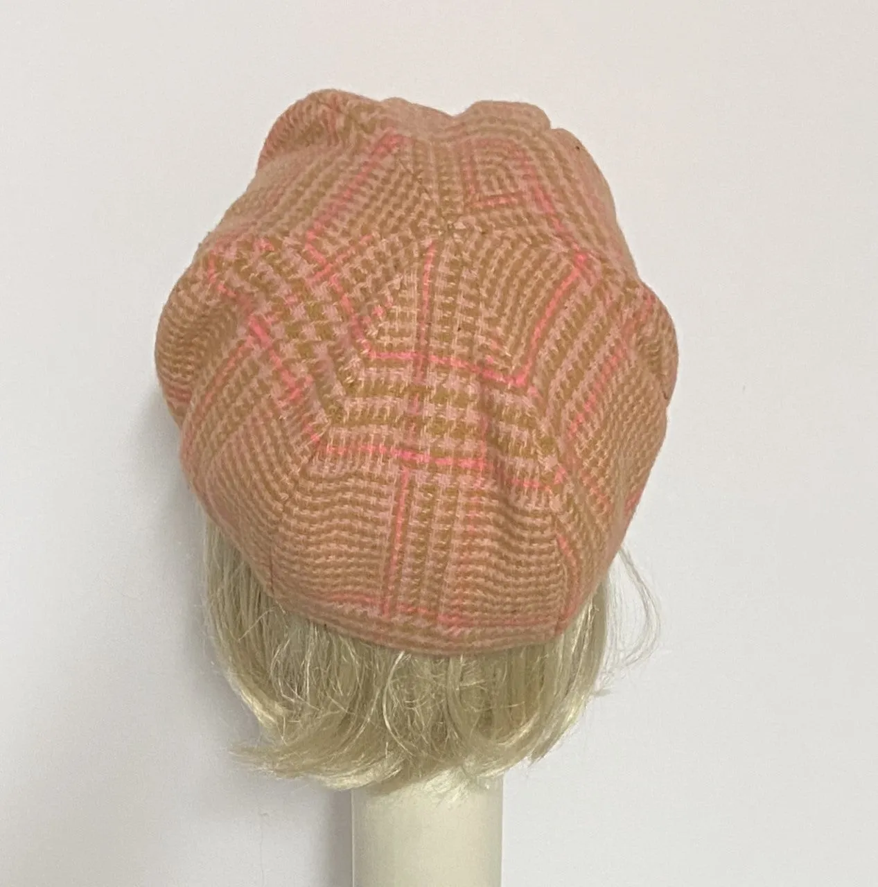 Beret Hat made with a vintage double knit pink plaid fabric, lined in rayon print, the top of the hat is made up of 6 section crown, and has a 1" soft elastic band inside.