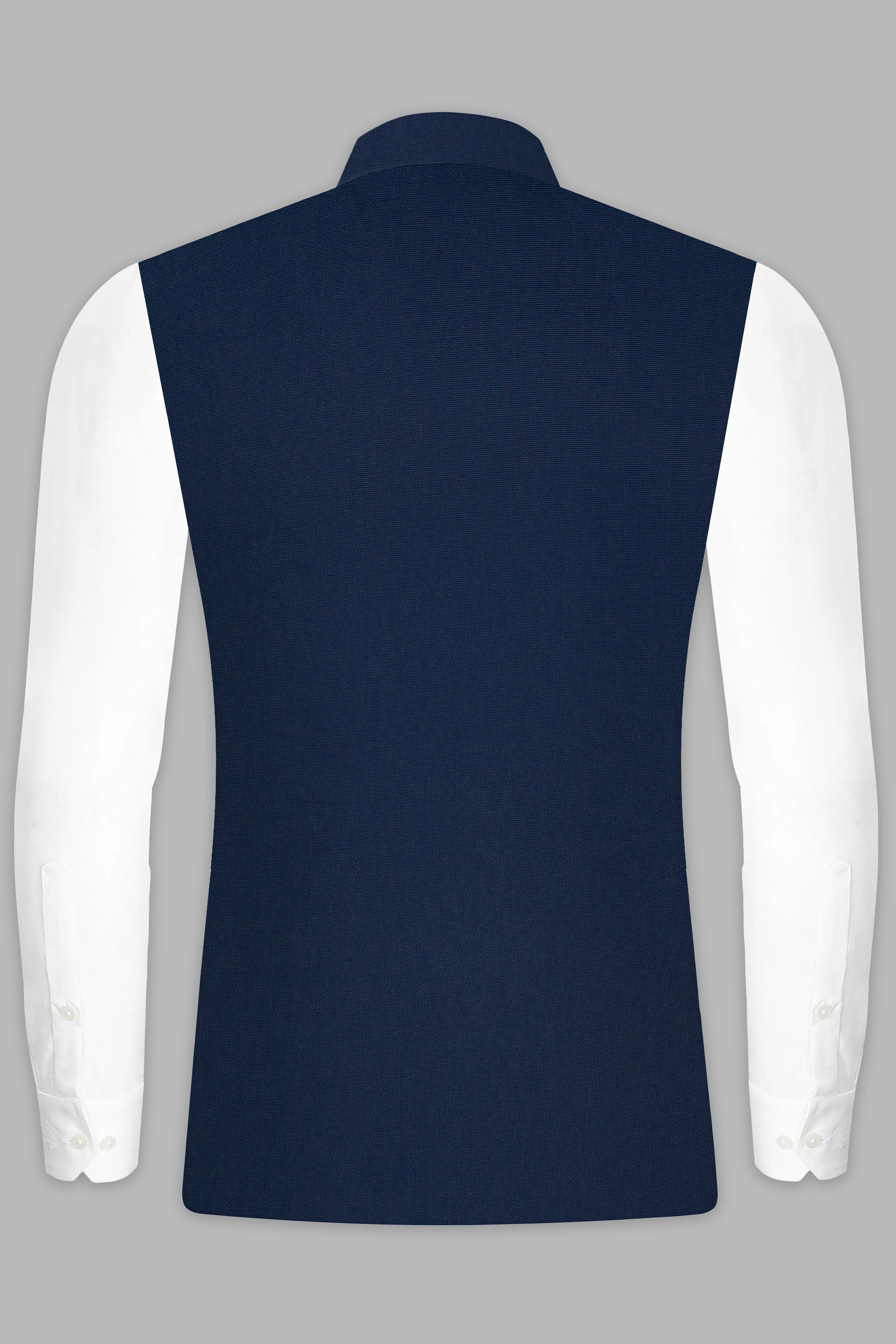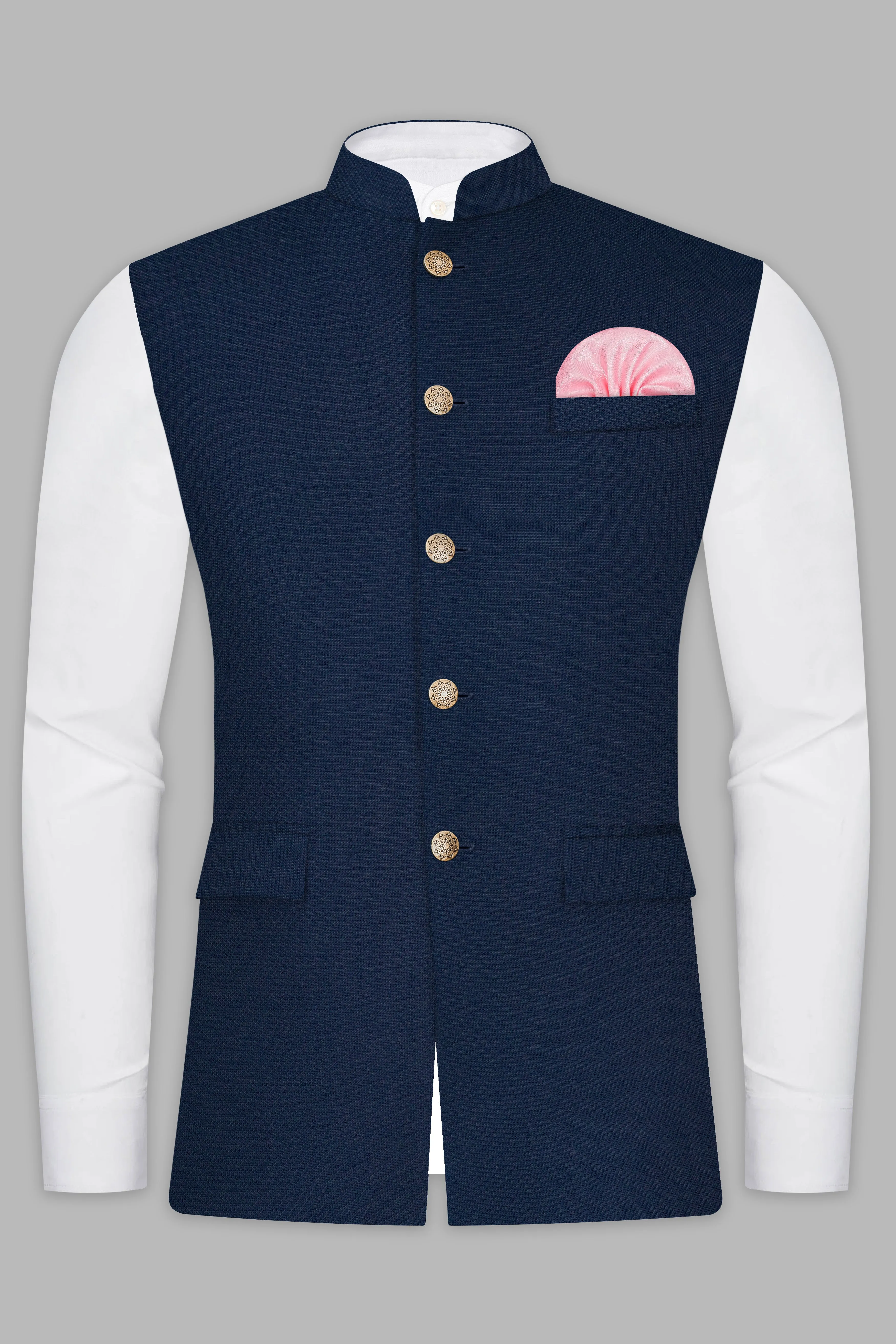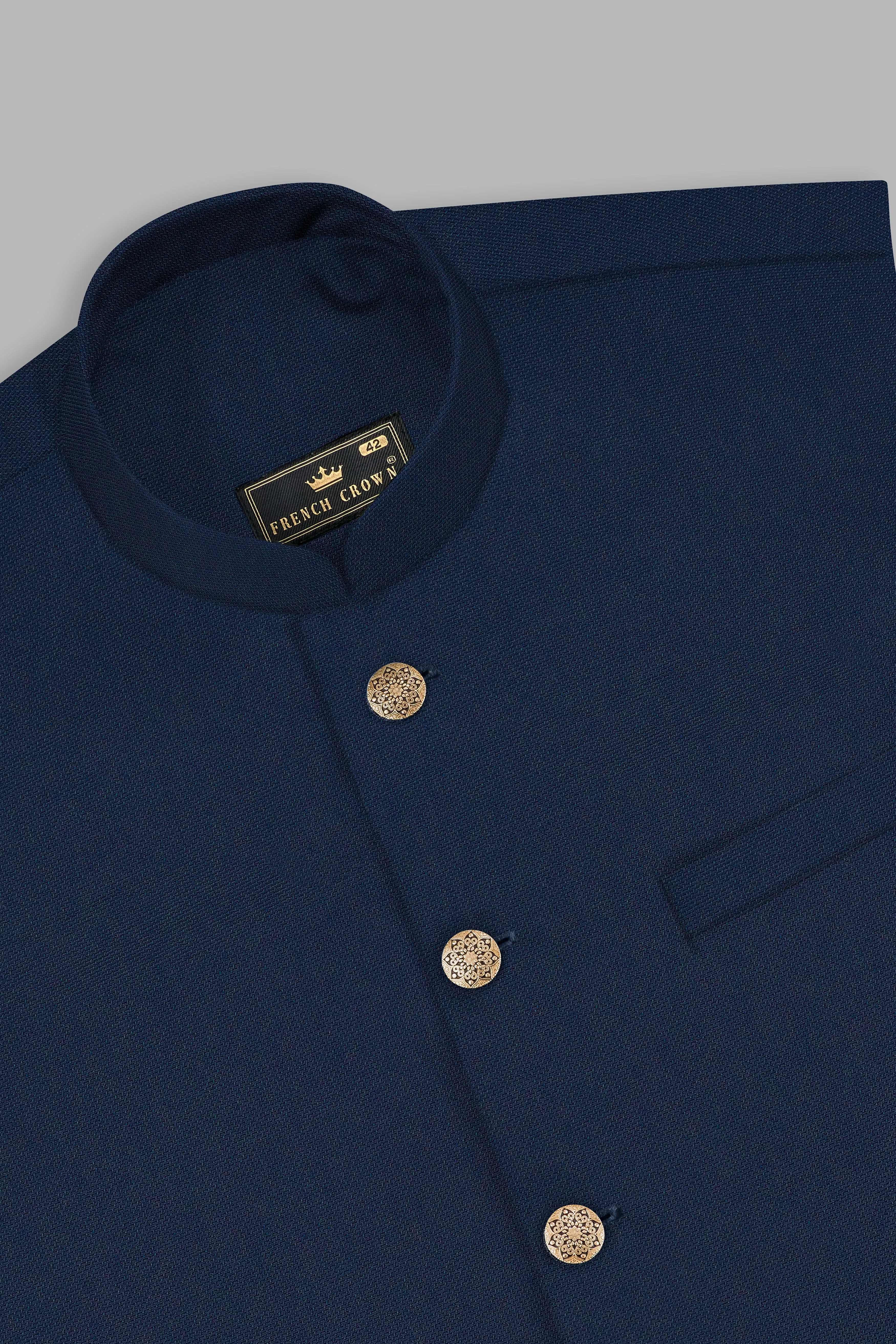 This Big Stone Blue Textured Wool Blend Nehru Jacket is a statement of elegance and tradition. The rich wool blend fabric ensures comfort and durability, while the unique texture adds depth to its sophisticated design. Ideal for weddings or festive occasions, this Nehru Jacket perfectly combines modern flair with classic charm. Pair it with a crisp white shirt for a timeless look or a light grey shirt for a contemporary touch.
