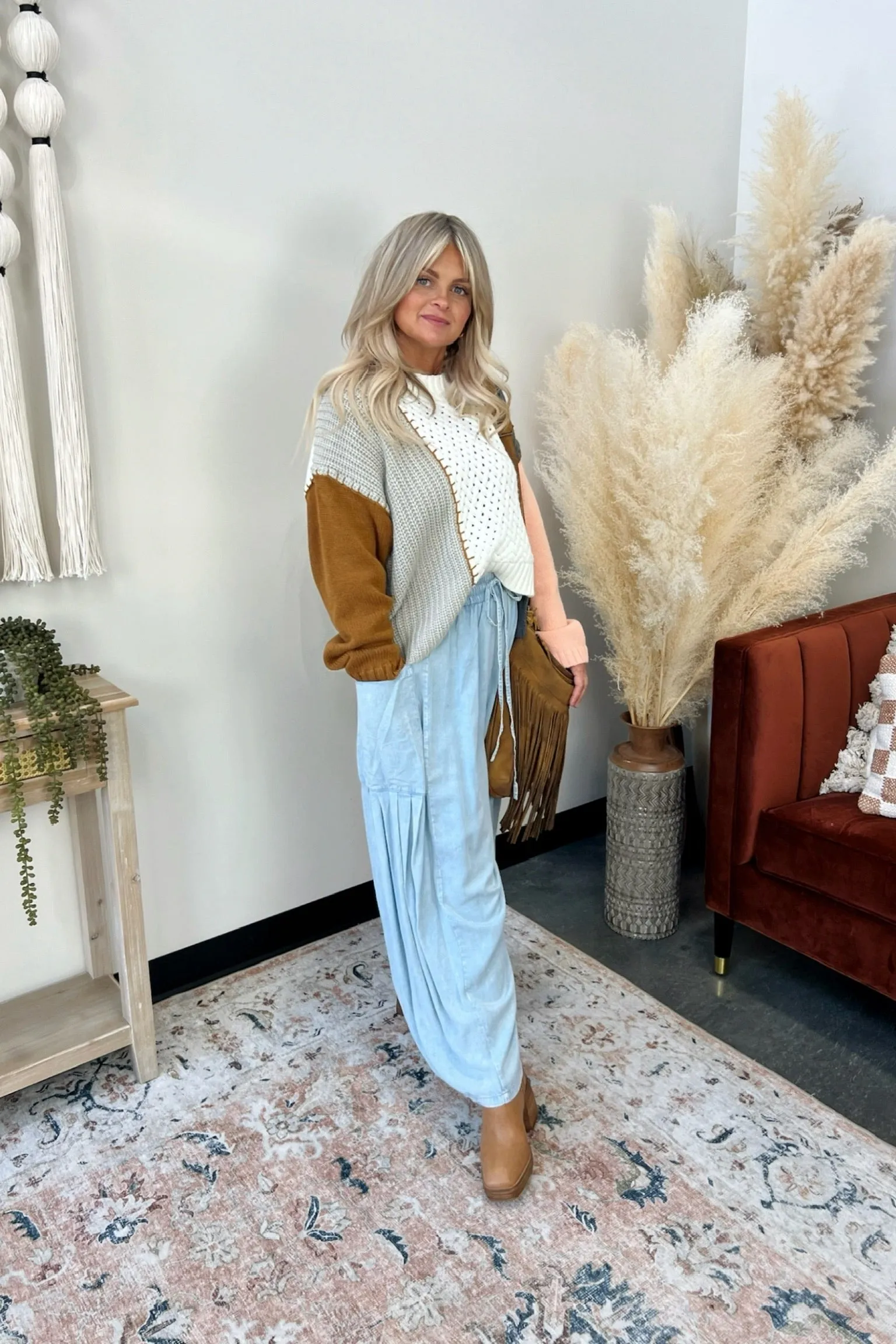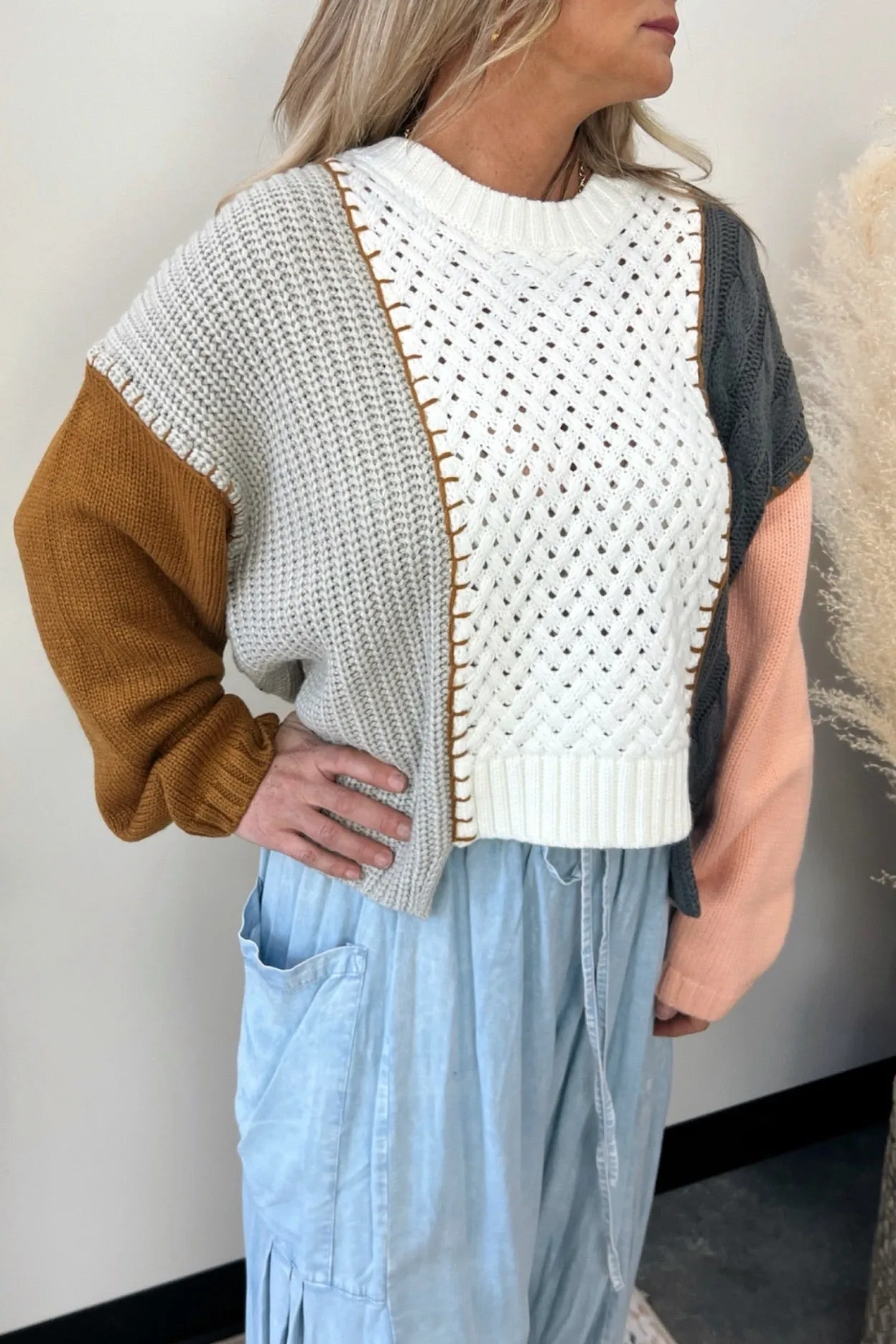 - Stay warm in this multi-knit colorblock sweater.