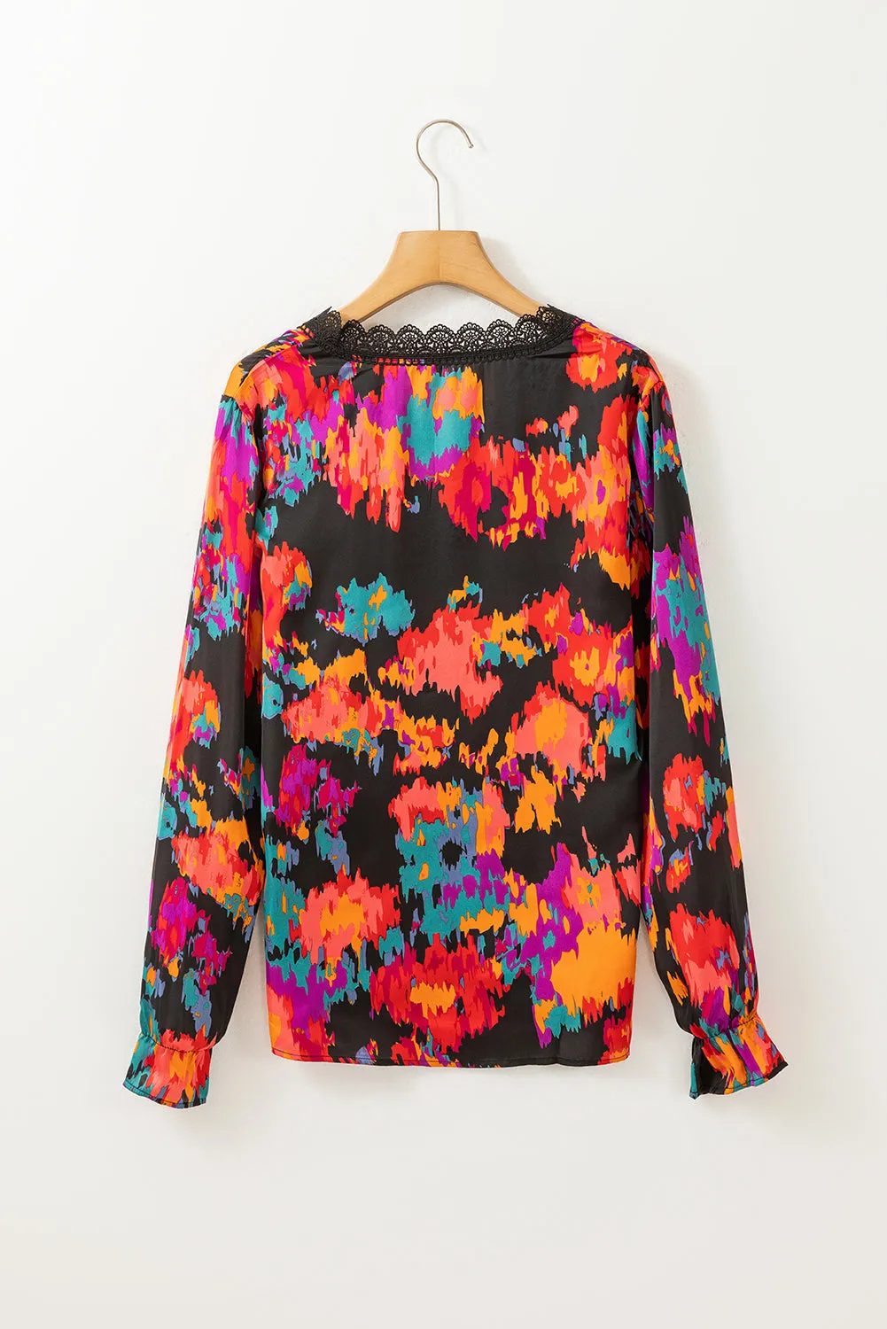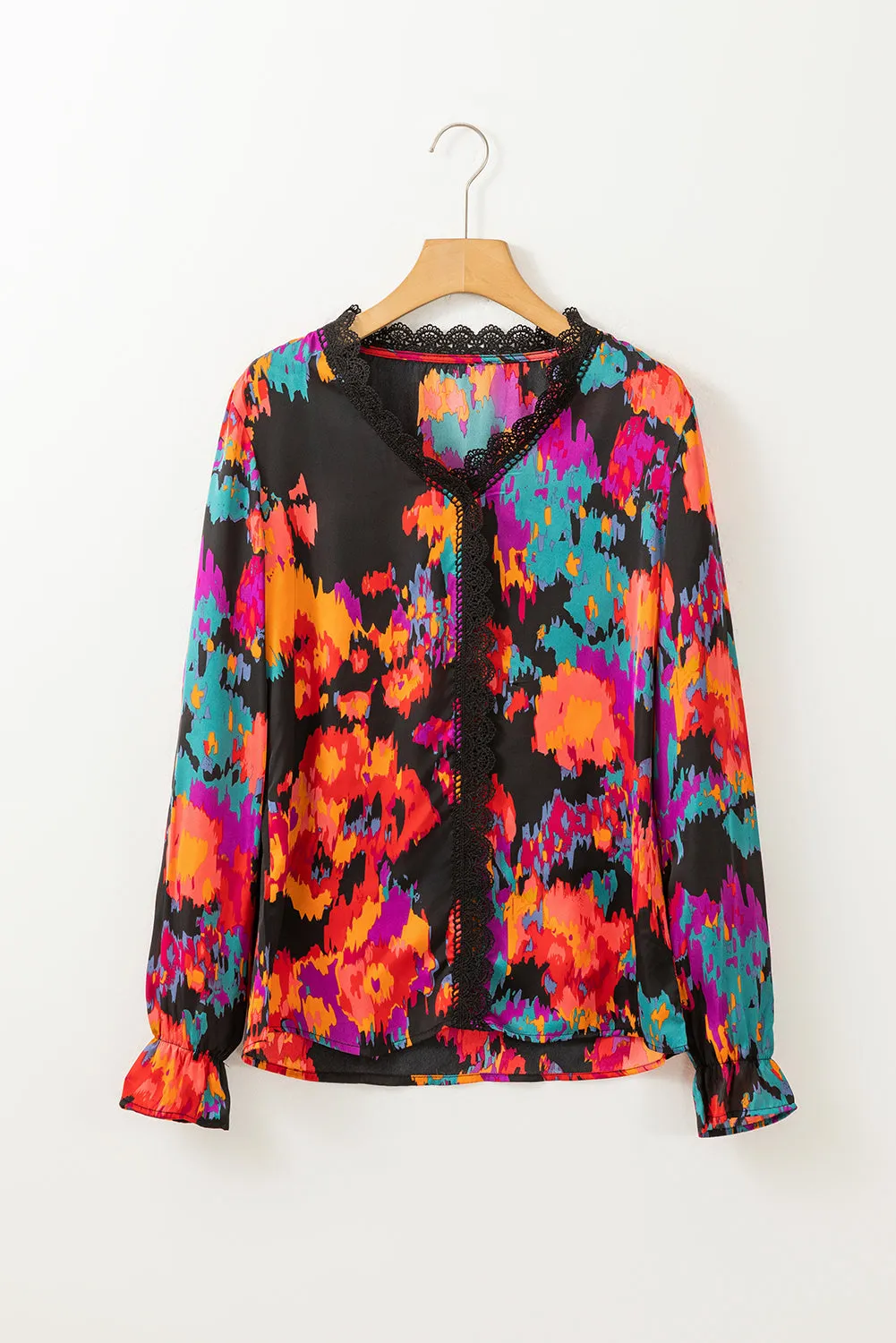 Elevate your wardrobe with this chic and stylish blouse that features a unique abstract pattern and sexy lace V-neck detail. Designed with comfort in mind, it offers a loose fit that allows for easy movement, making it your go-to choice for any occasion. The bubble sleeves and ruffled cuffs add a playful touch, making this top both fashionable and fun.
