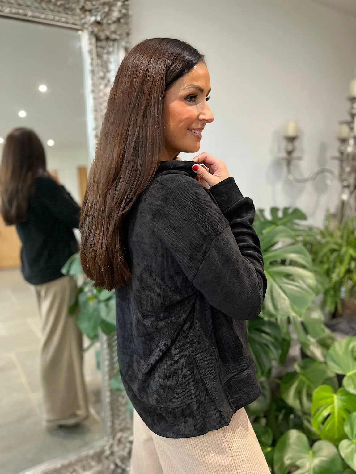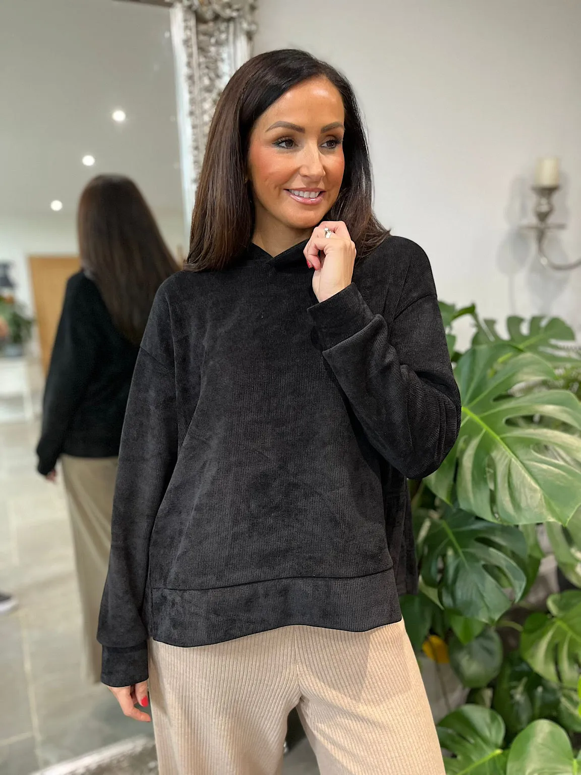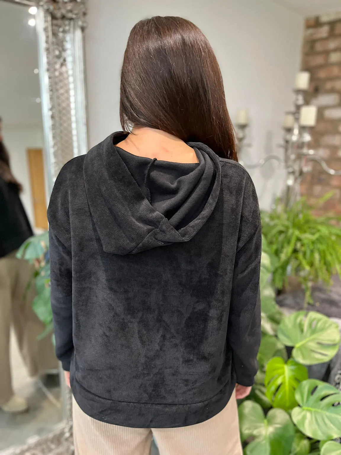 Look and feel comfortable all day in the Black Chenille Hoodie Donna. Made from cosy chenille fabric, this stylish hoodie will keep you warm and comfortable in any situation. Experience exceptional comfort with this must-have hoodie.