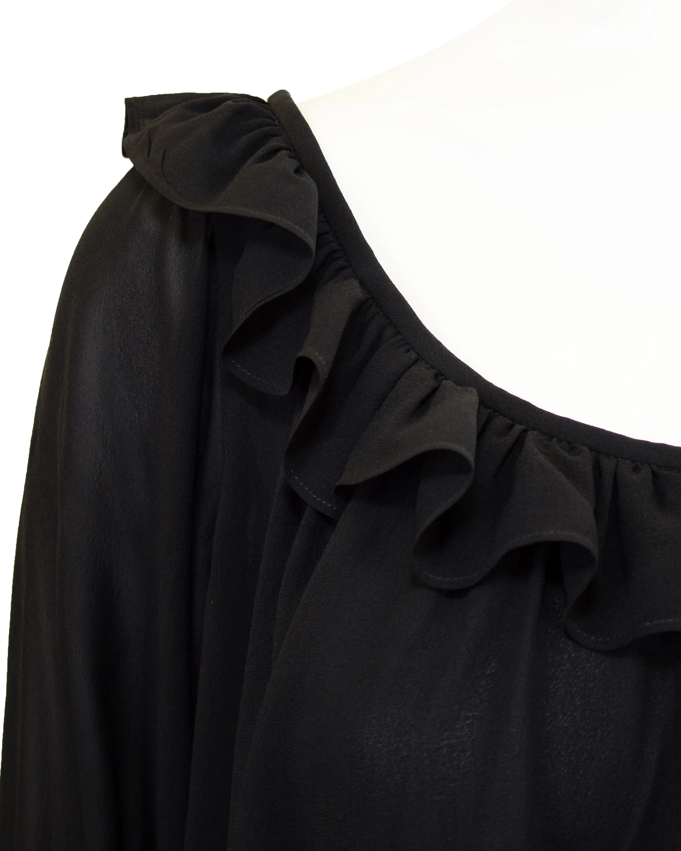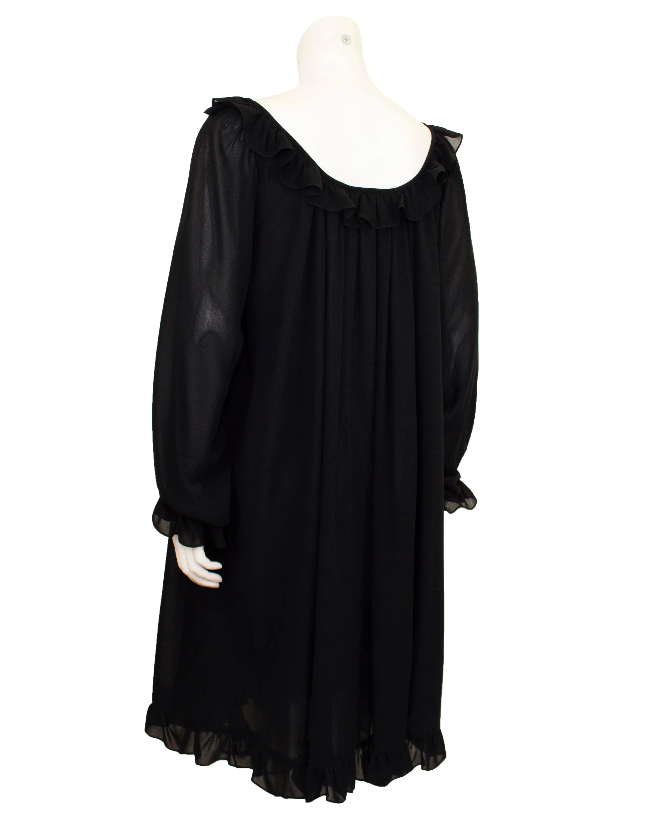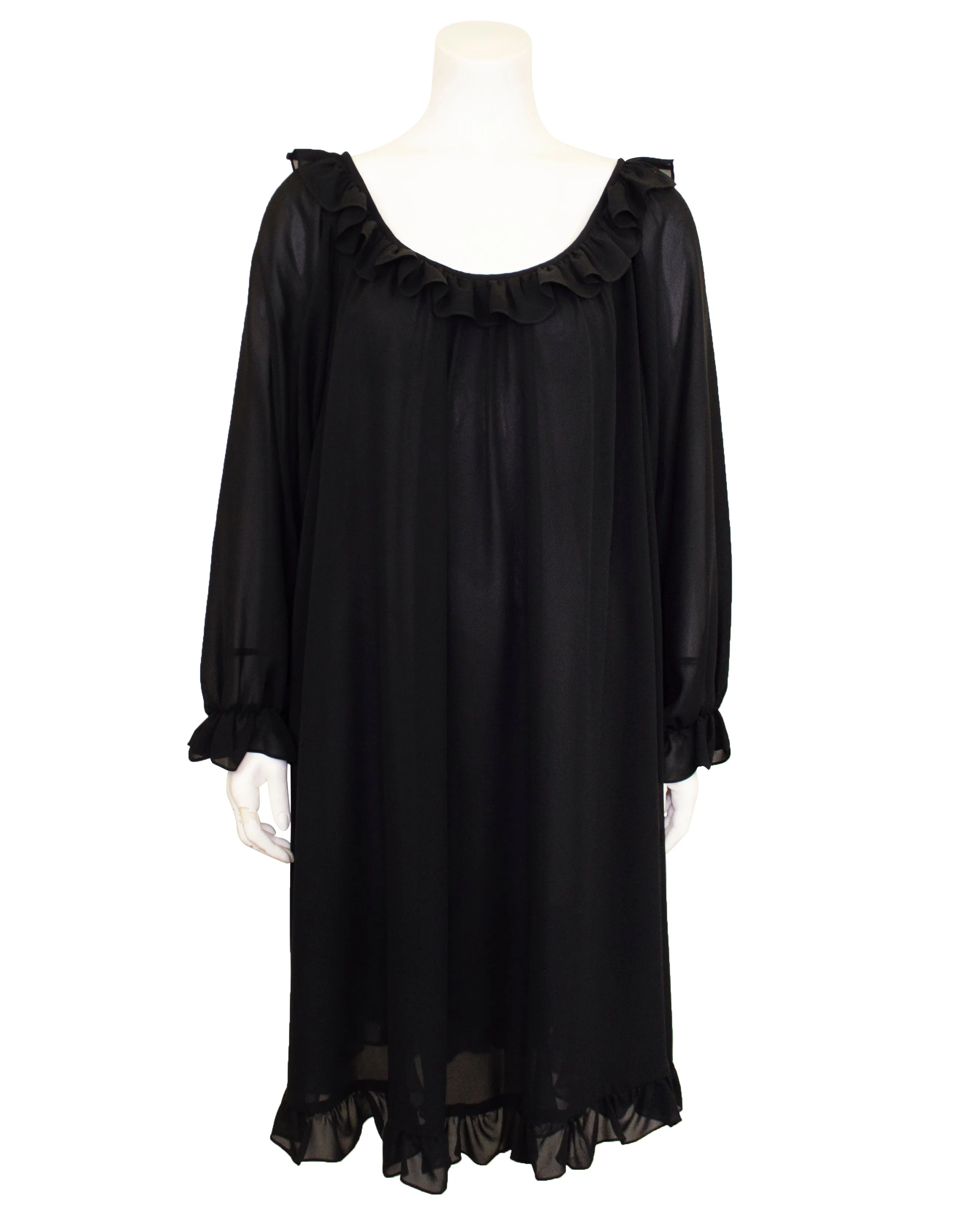 Early 1990s Yves Saint Laurent black chiffon babydoll dress. Long sleeve with a scoop neckline. Ruffle trim at the neckline, cuffs and hem. The body is lined, while the sleeves are sheer. Loose through the body and can fit sizes 4-10. Excellent vintage condition. Made in France.