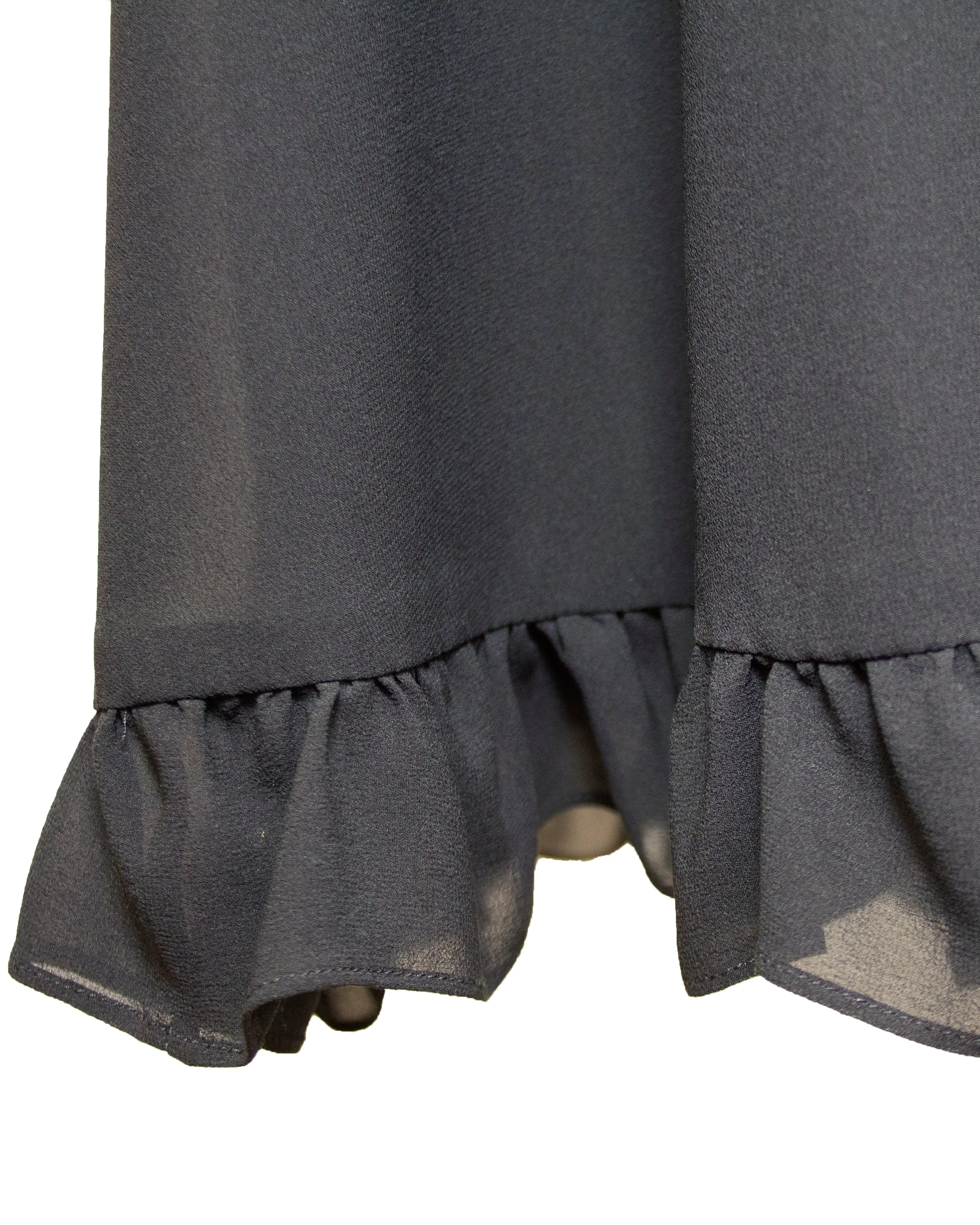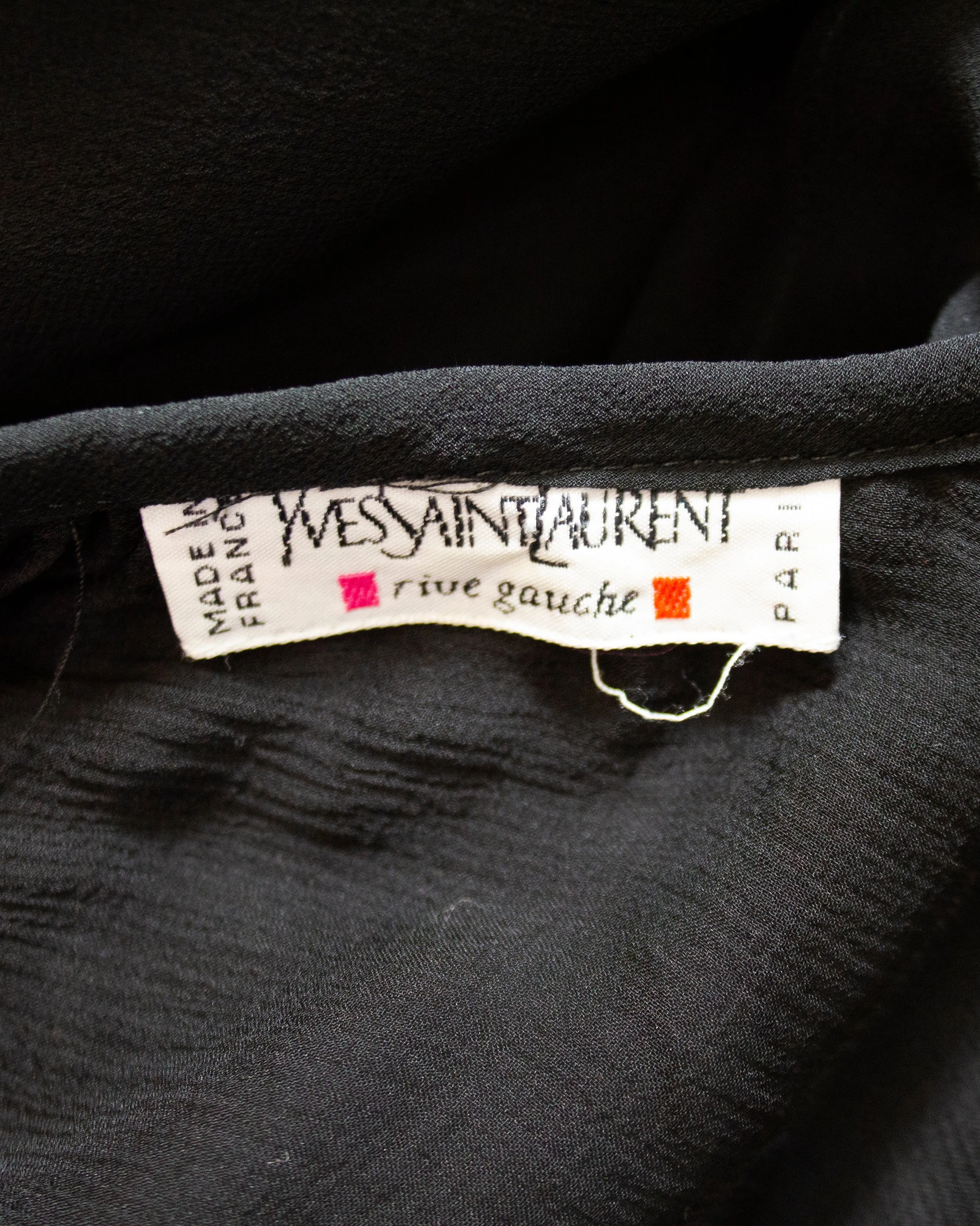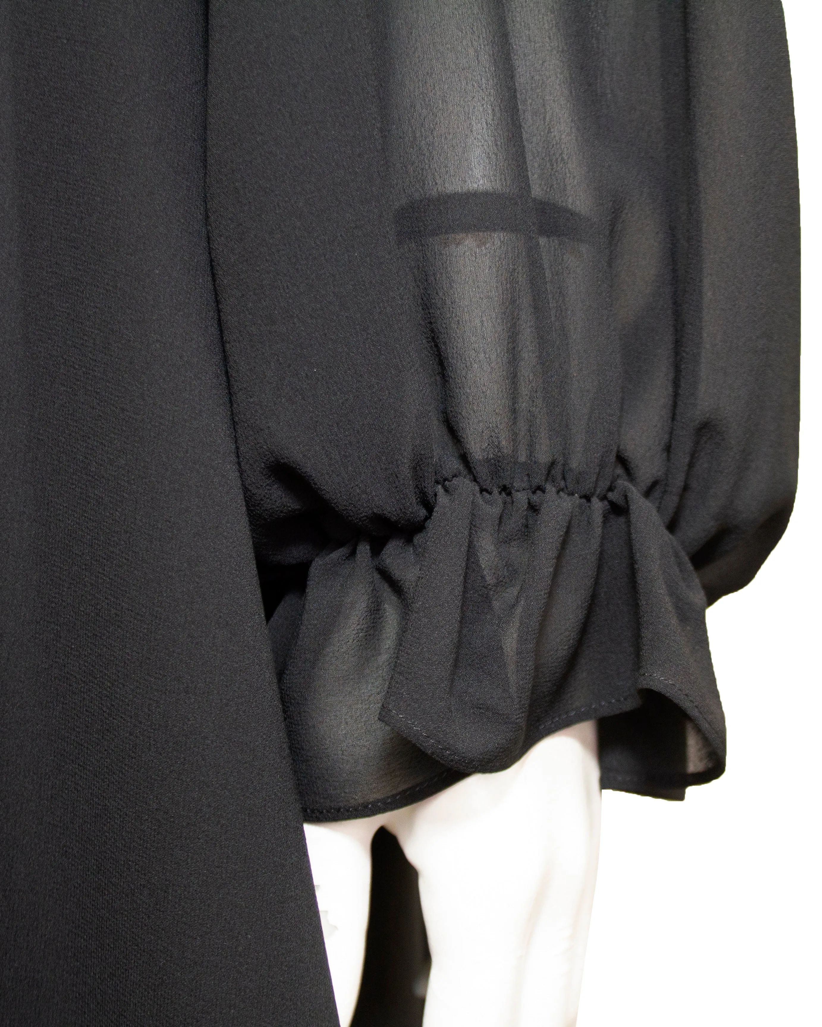Early 1990s Yves Saint Laurent black chiffon babydoll dress. Long sleeve with a scoop neckline. Ruffle trim at the neckline, cuffs and hem. The body is lined, while the sleeves are sheer. Loose through the body and can fit sizes 4-10. Excellent vintage condition. Made in France.