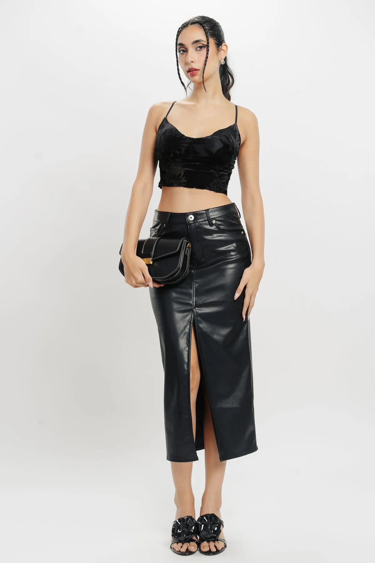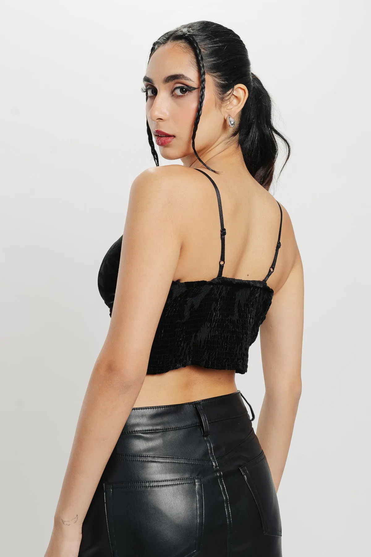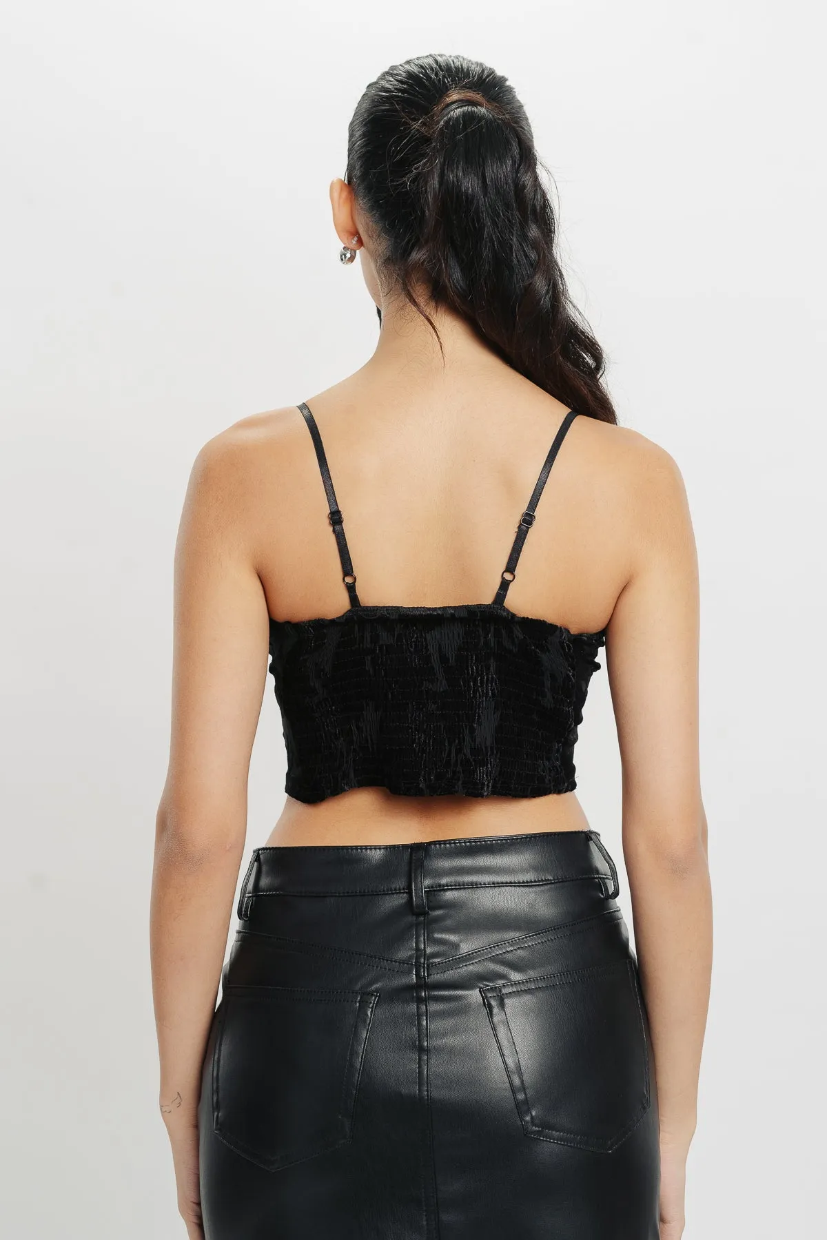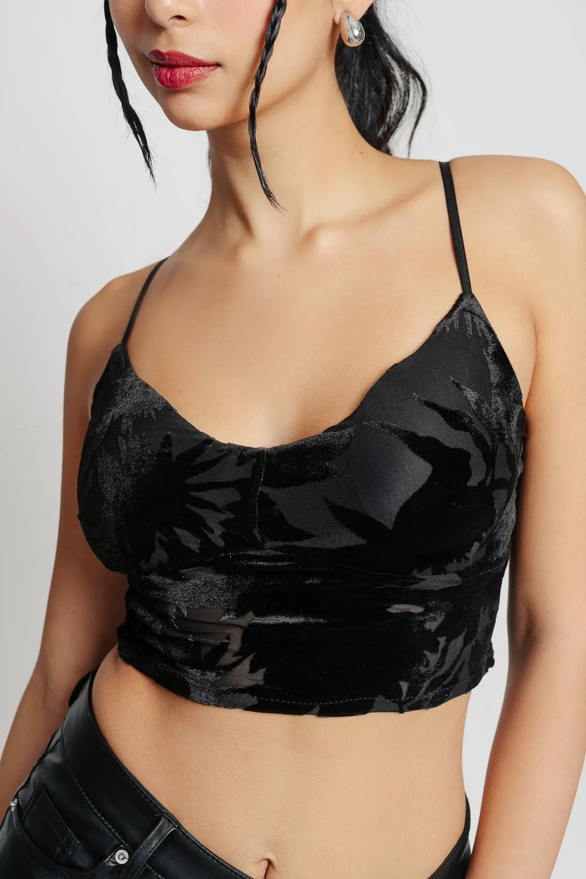 Description: Elevate your wardrobe with this Black Floral Crop Top. Crafted from mesh fabric, it features delicate velvet floral patterns and a trendy strappy design. The smocking back ensures a comfortable fit while adding a touch of allure. Perfect for pairing with high-waisted jeans or skirts for a chic, feminine look.
