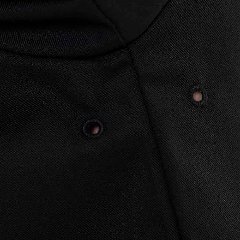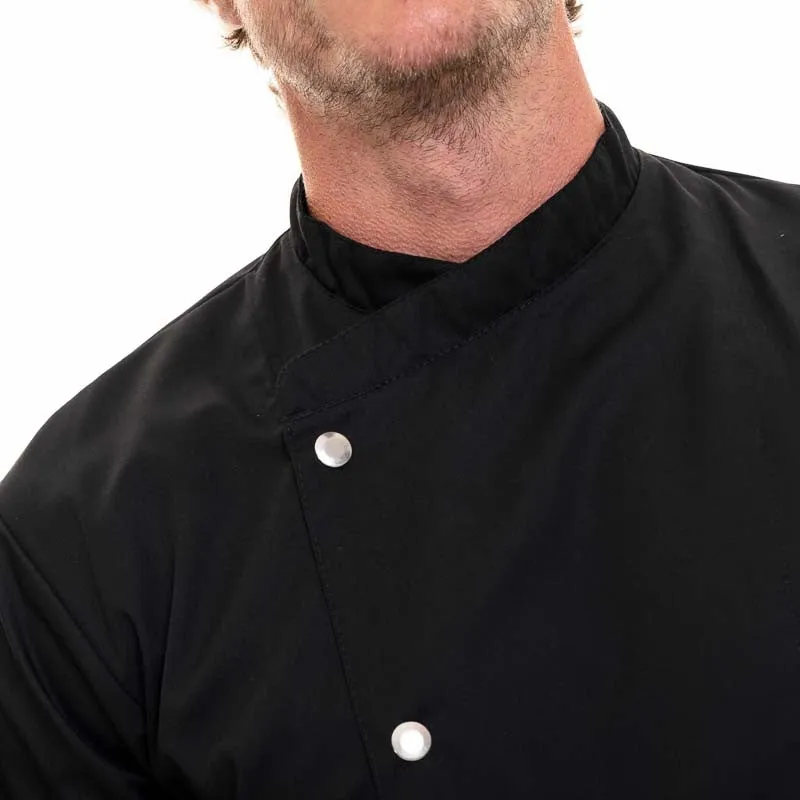This chef coat will satisfy professionals, apprentices, and individuals alike. Perfectly resistant, it will protect you from all types of splatters. Its snap buttons provide the detail that will set you apart from your colleagues. Its understated black color is perfect for an elegant kitchen outfit. Its silver buttons add a sophisticated touch.