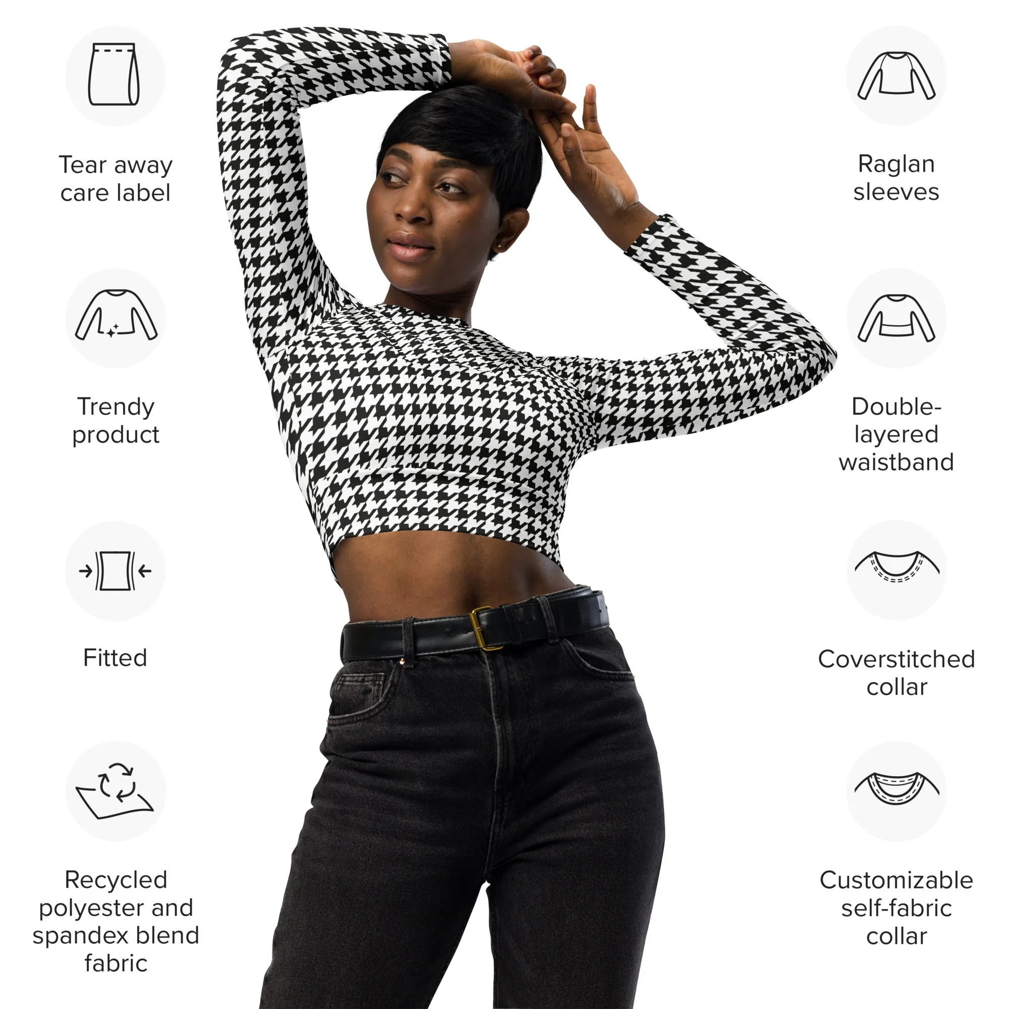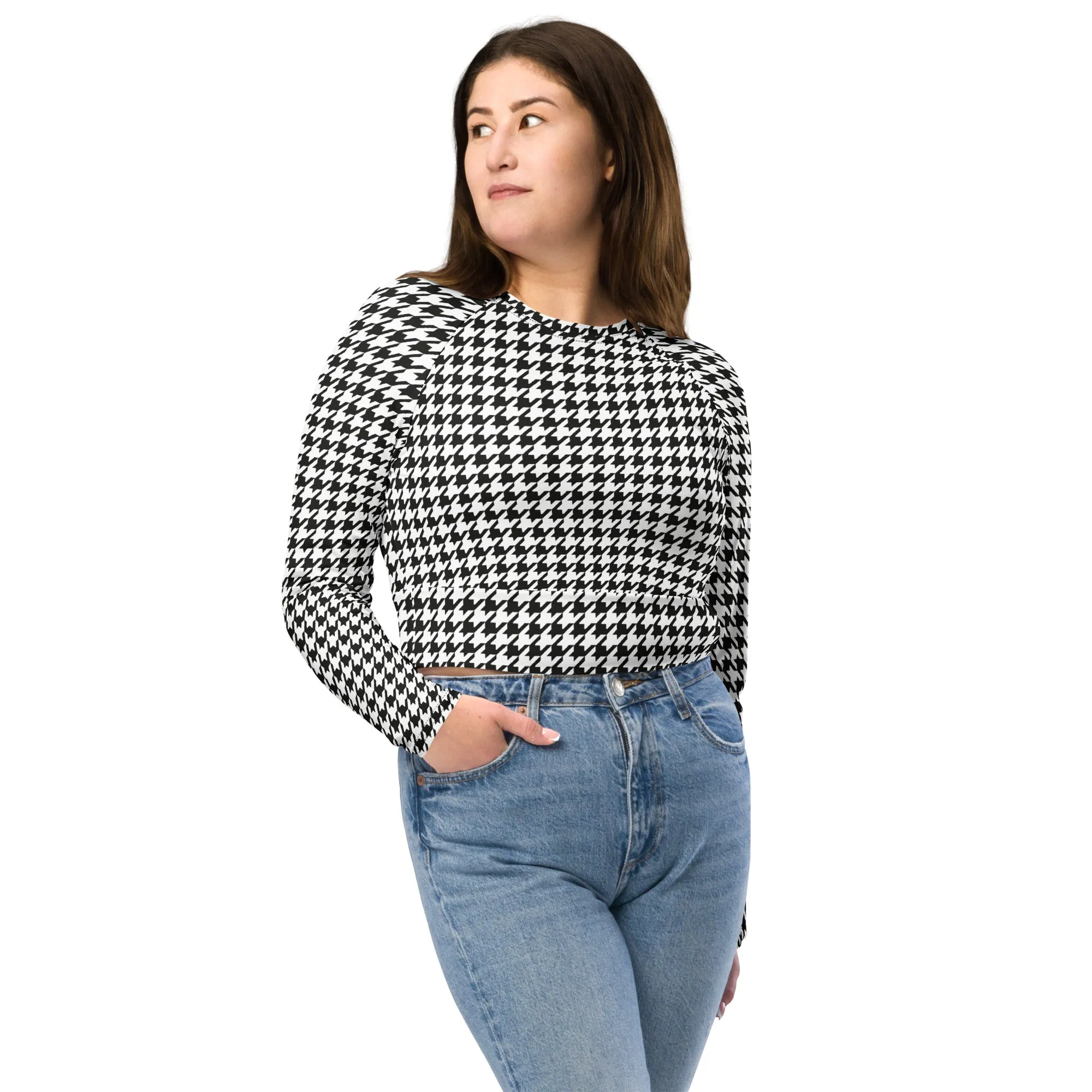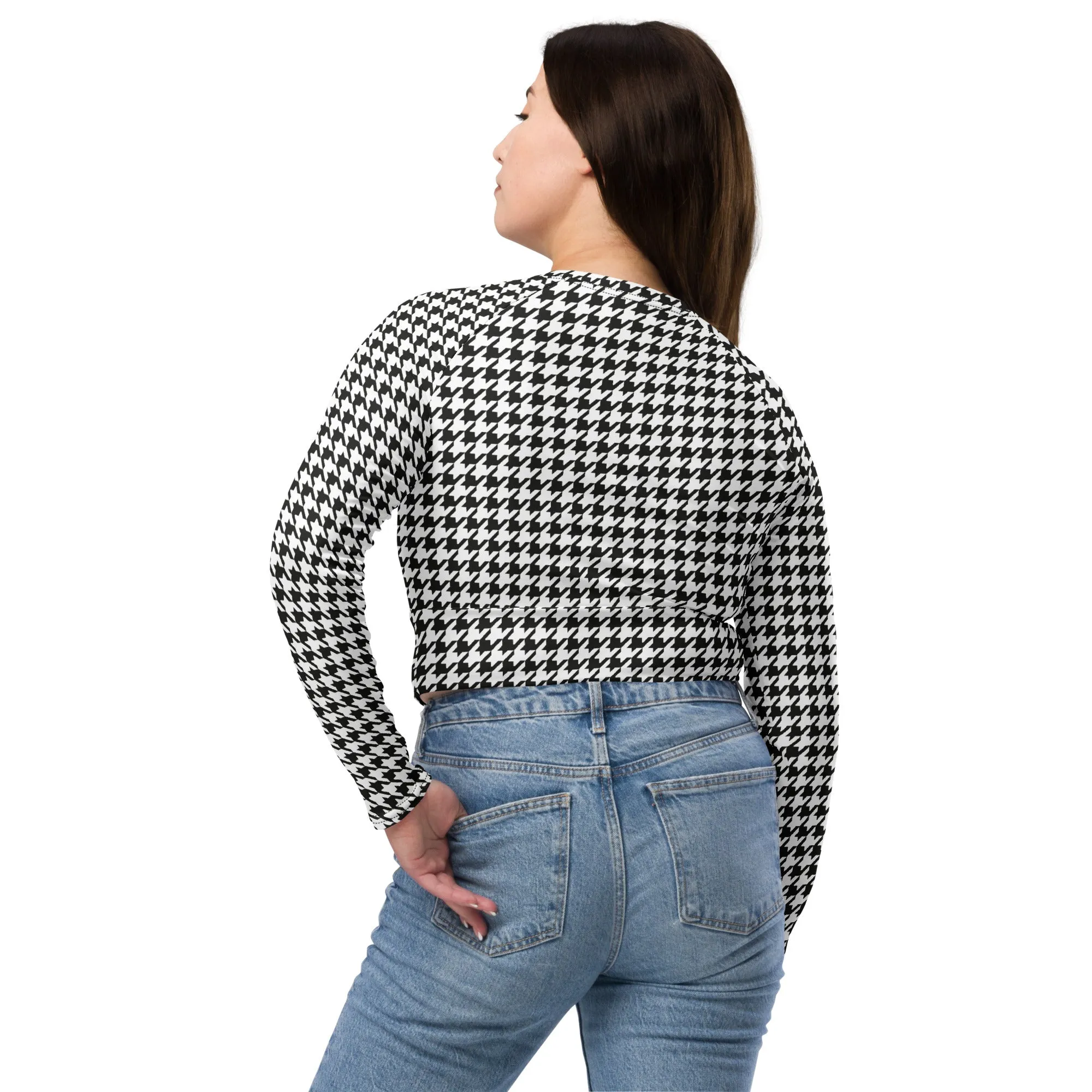 Black & White Houndstooth Print Recycled Long-sleeve Crop Top