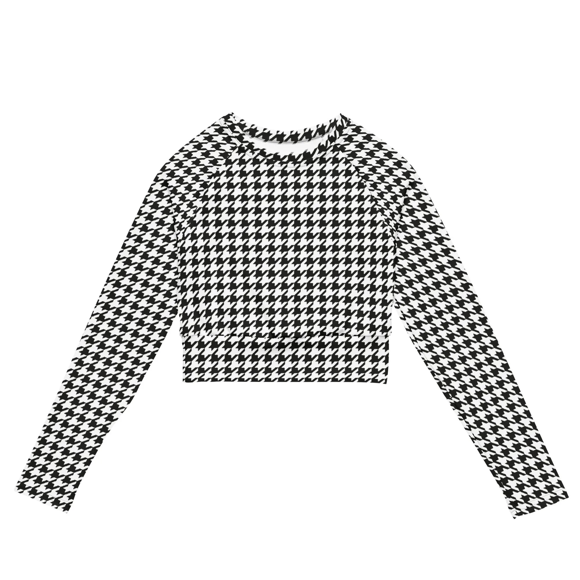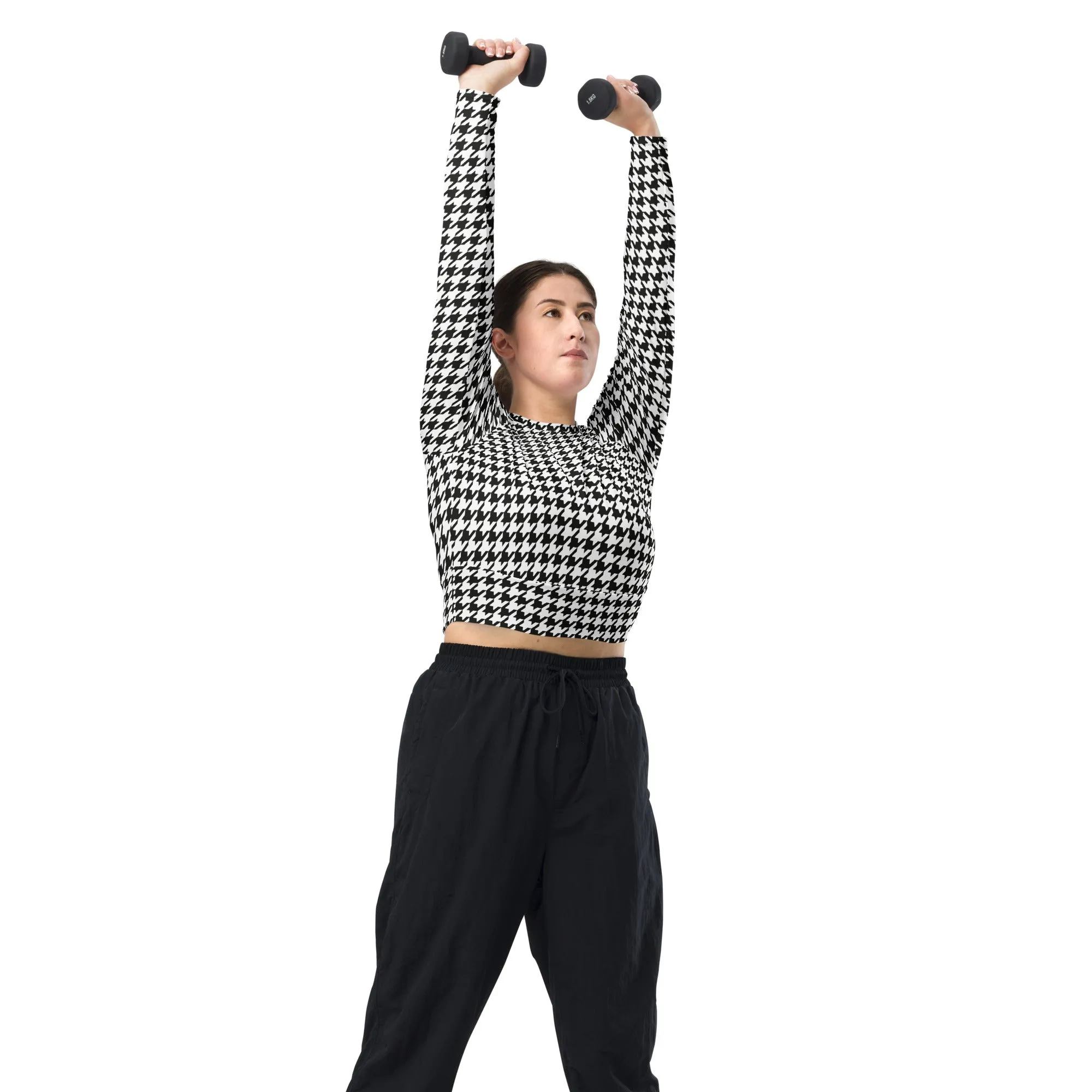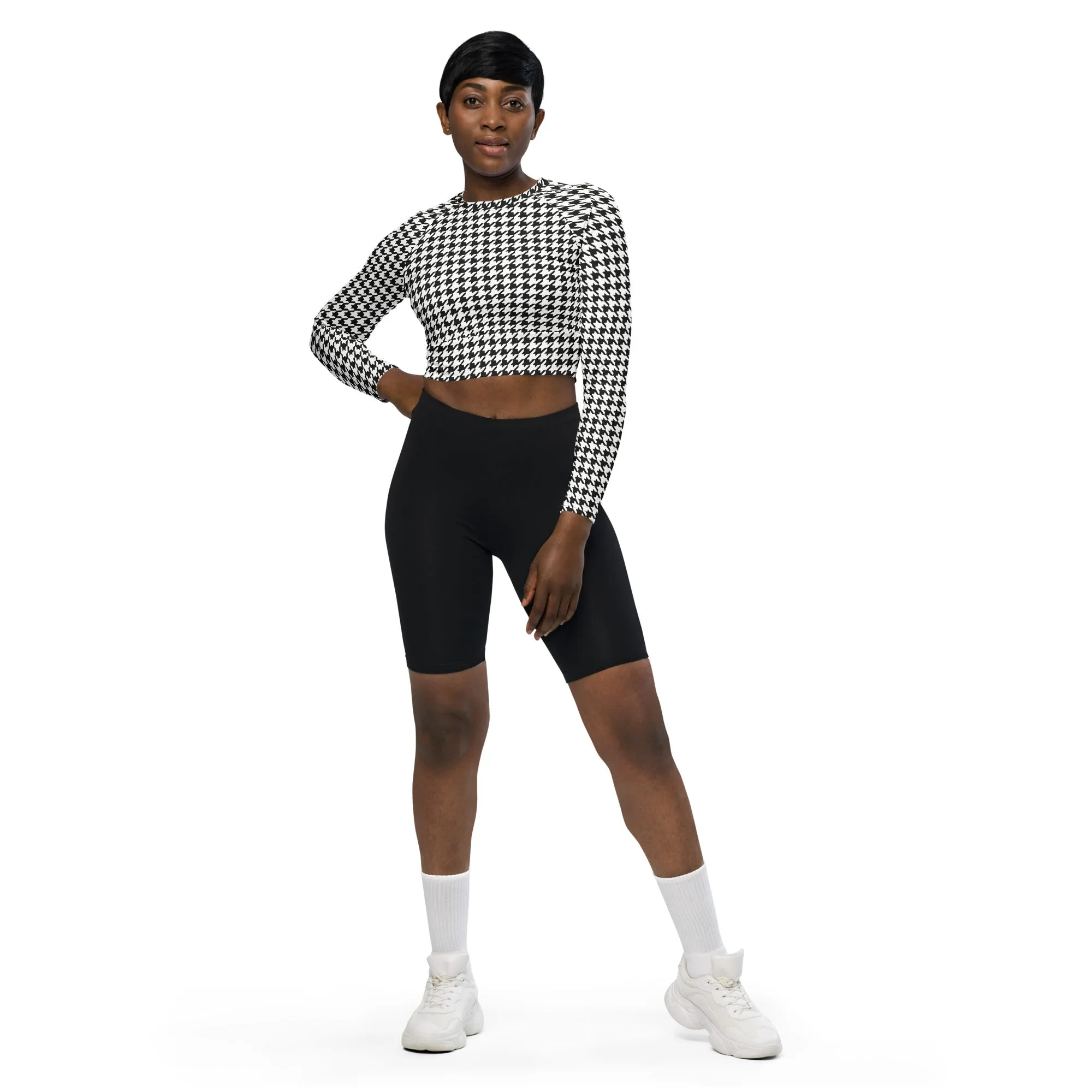 Black & White Houndstooth Print Recycled Long-sleeve Crop Top
