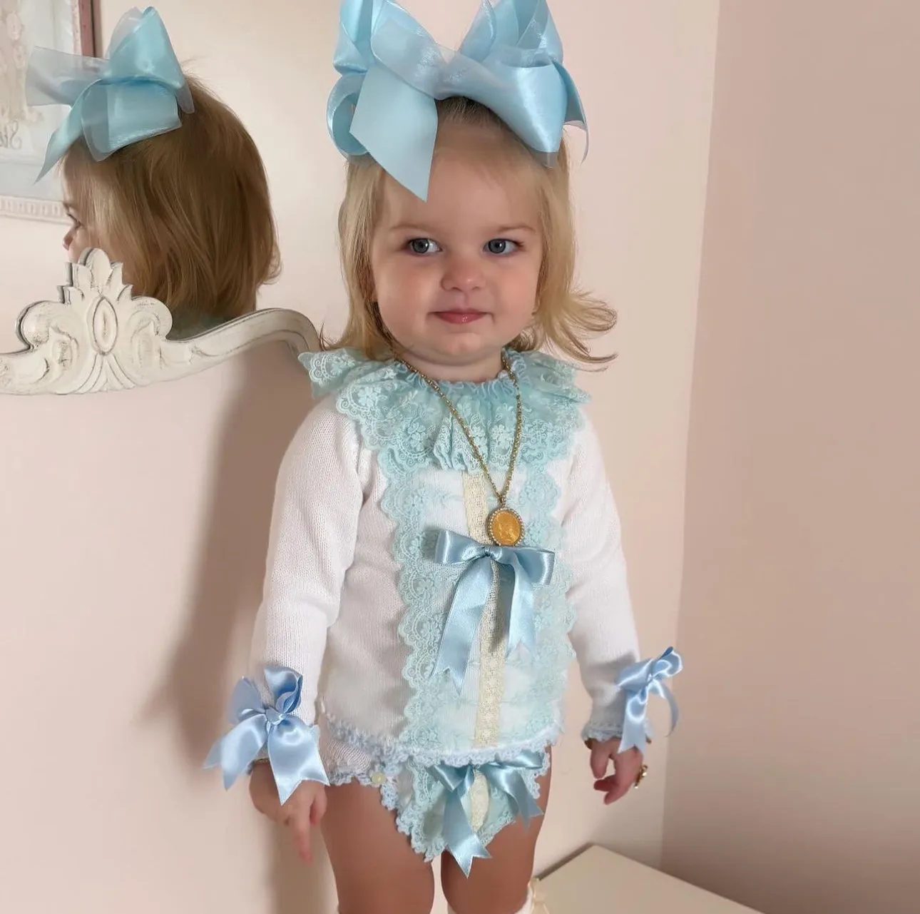 The beautiful combination of white and blue is a beautiful knit combination. This three piece set is a new fall piece that includes the sweater, bloomer and bonnet.