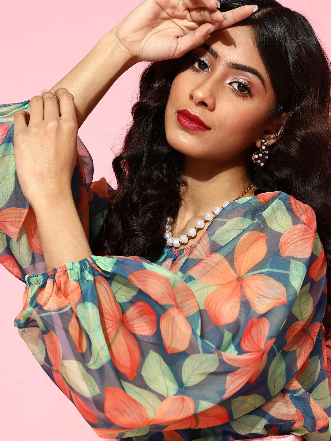 Blue Floral Organza Bardot Flounce Sleeve Top , in Organza fabric, Polyester , Regular Length , Comfort Fit, Elasticated Neck Line, Straight Hemline and features Flounce Sleeve Detail