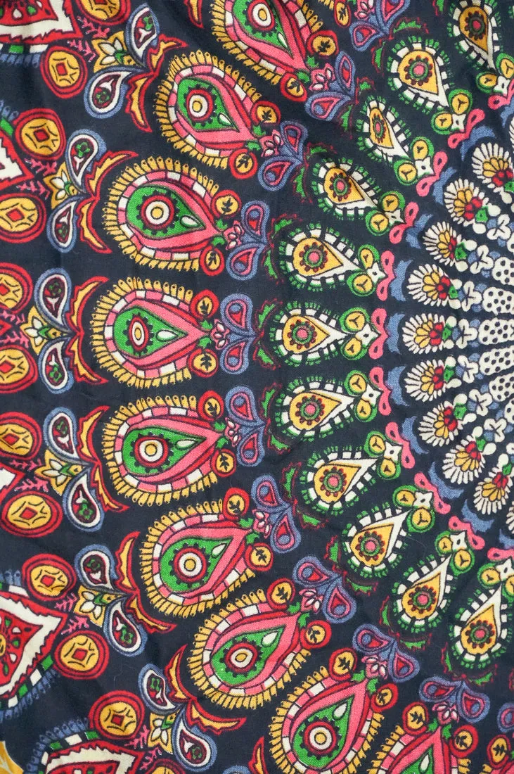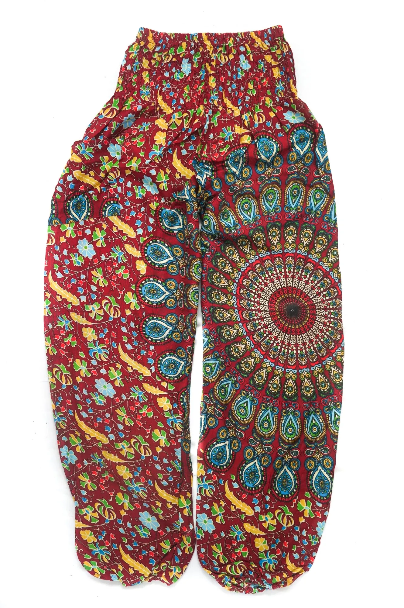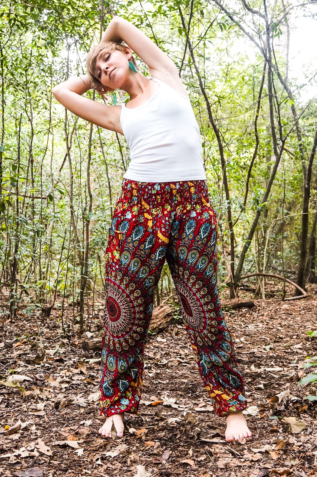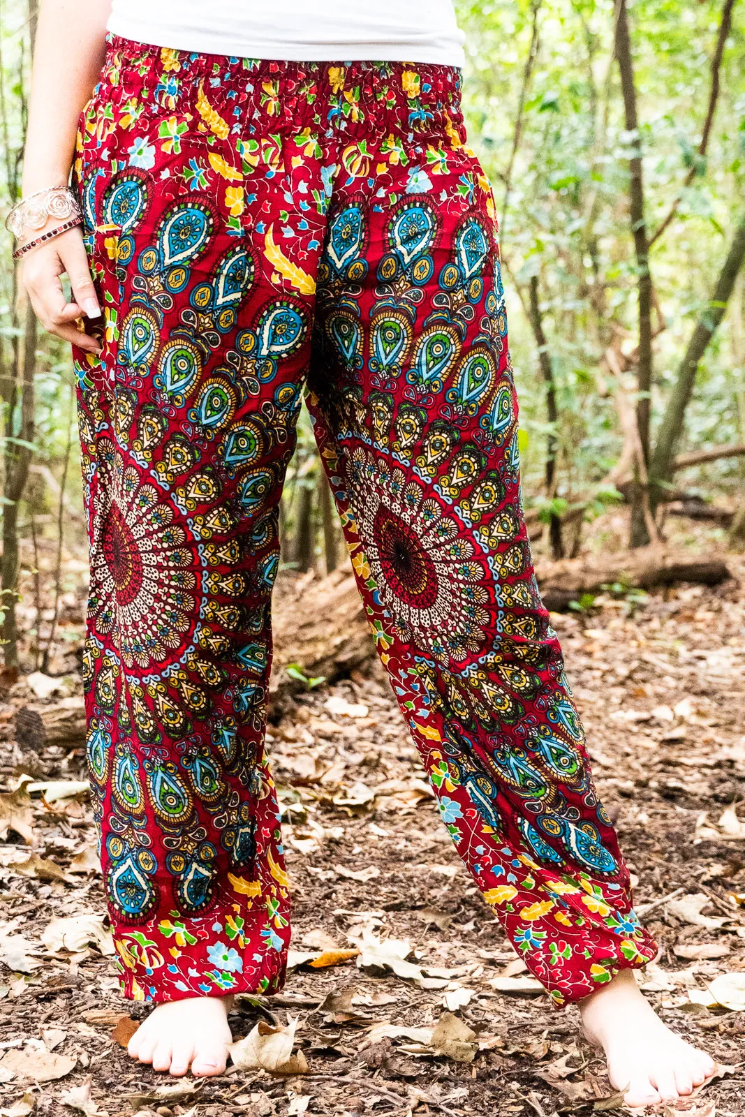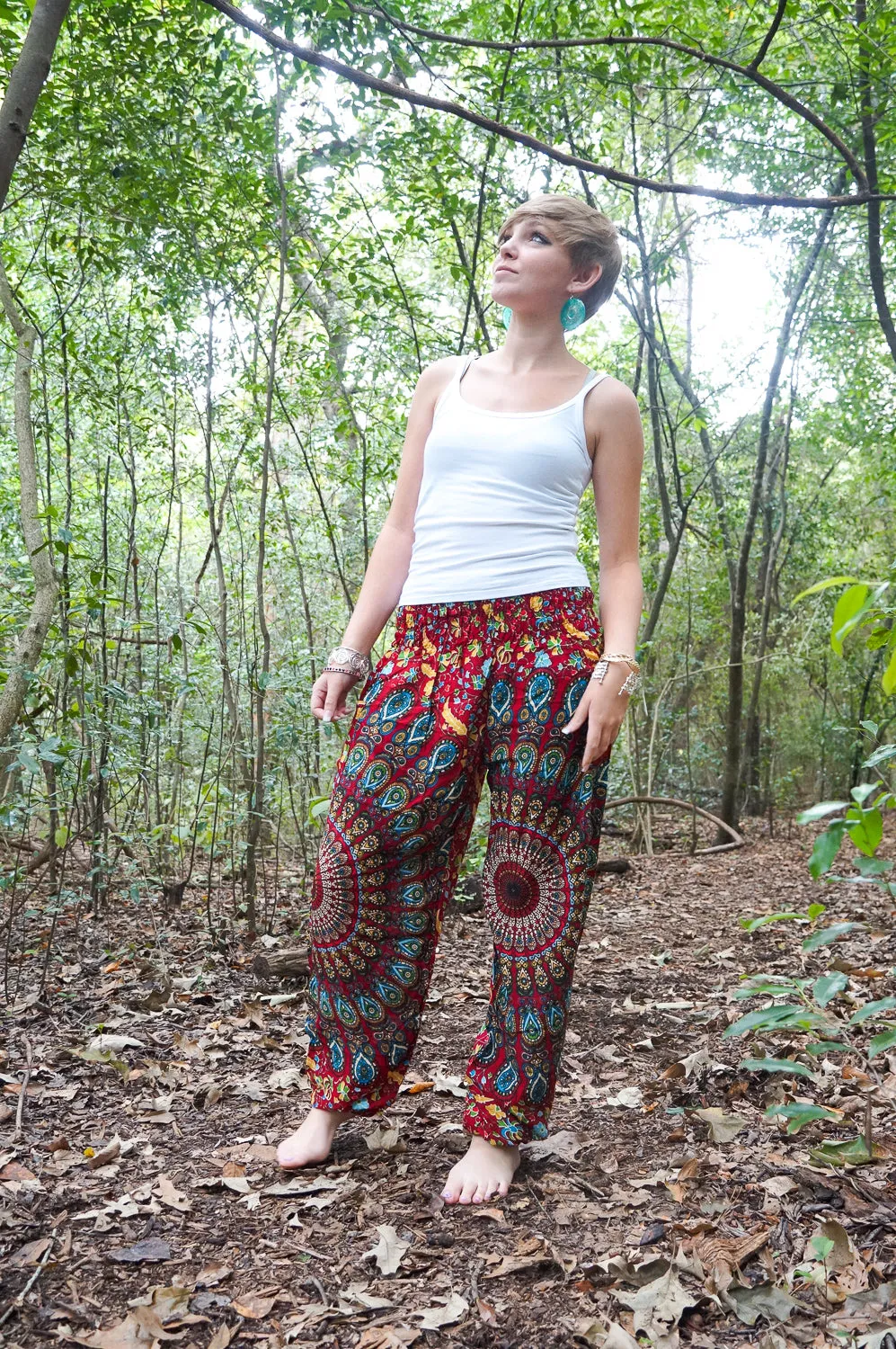 Check out this dazzling addition to the chakra mandala collection with its vibrant bohemian red with woven turquoise petals. The eye-catching turquoise jewels complete the floral mandala. These pants will uplift your boho spirit.