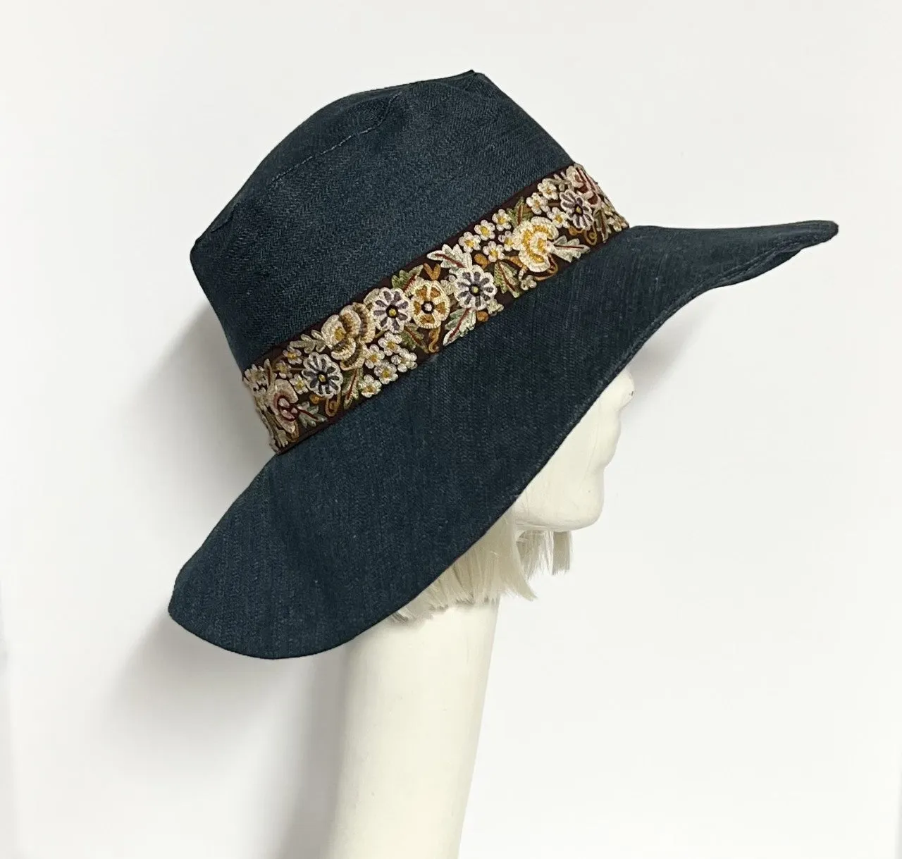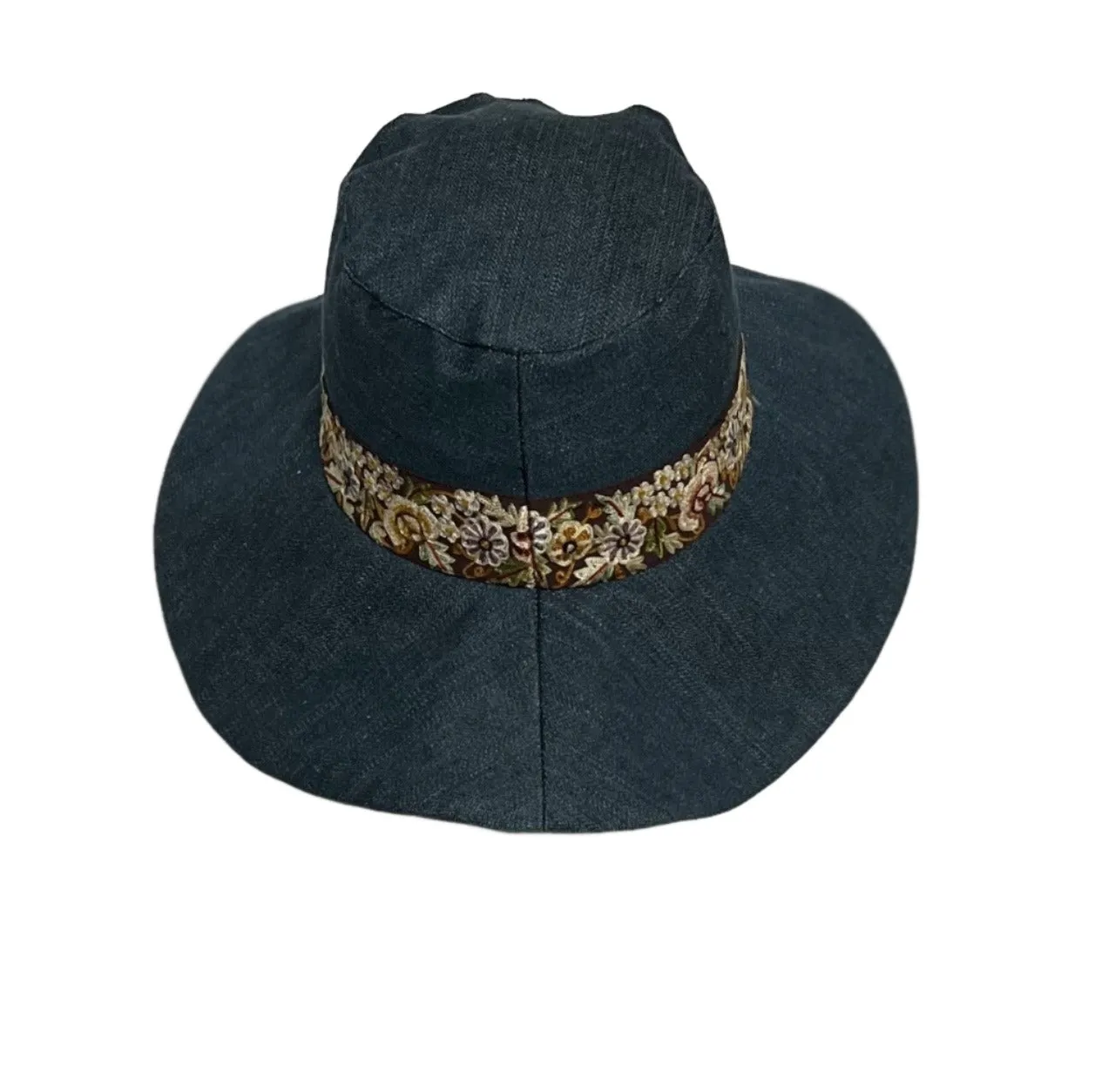 Elevate your summer style with our Boho Denim Sun Hat! Made in the USA with high quality denim and featuring vintage embroidery trim, this sun hat is both stylish and durable. The lined rayon print and soft padded cotton inside band provide comfort and protection from the sun. Hand crafted with love, this hat is the perfect addition to any outfit.