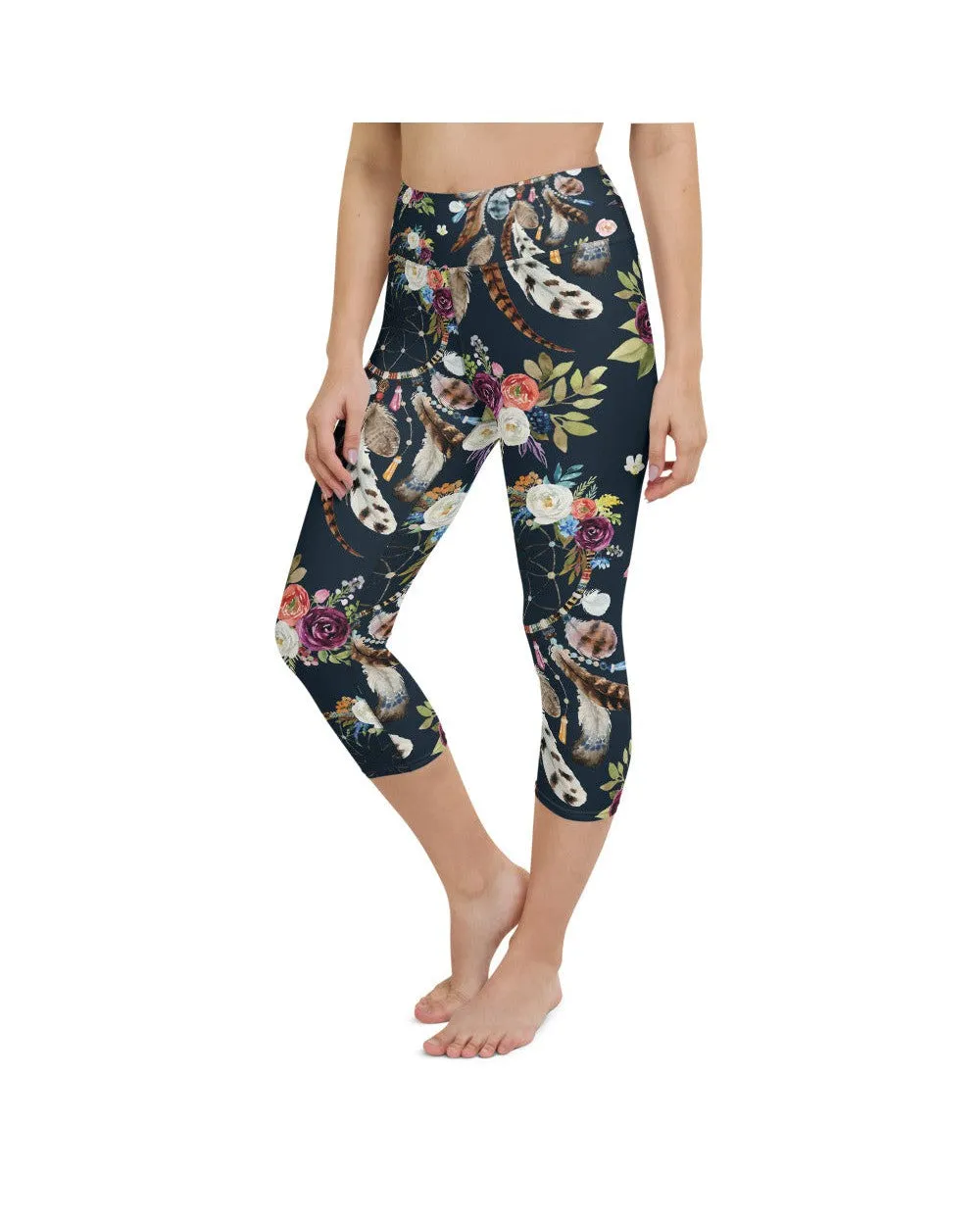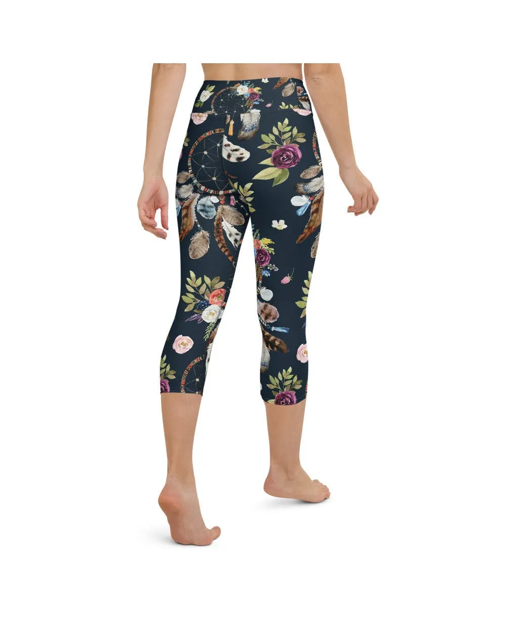 Feathers, dreamcatchers, flowers, black, white, brown, green, purple, blue and pink, bohemian and hippie come together in the Gearbunch Boho Dreamcatcher and Flowers Yoga Capris