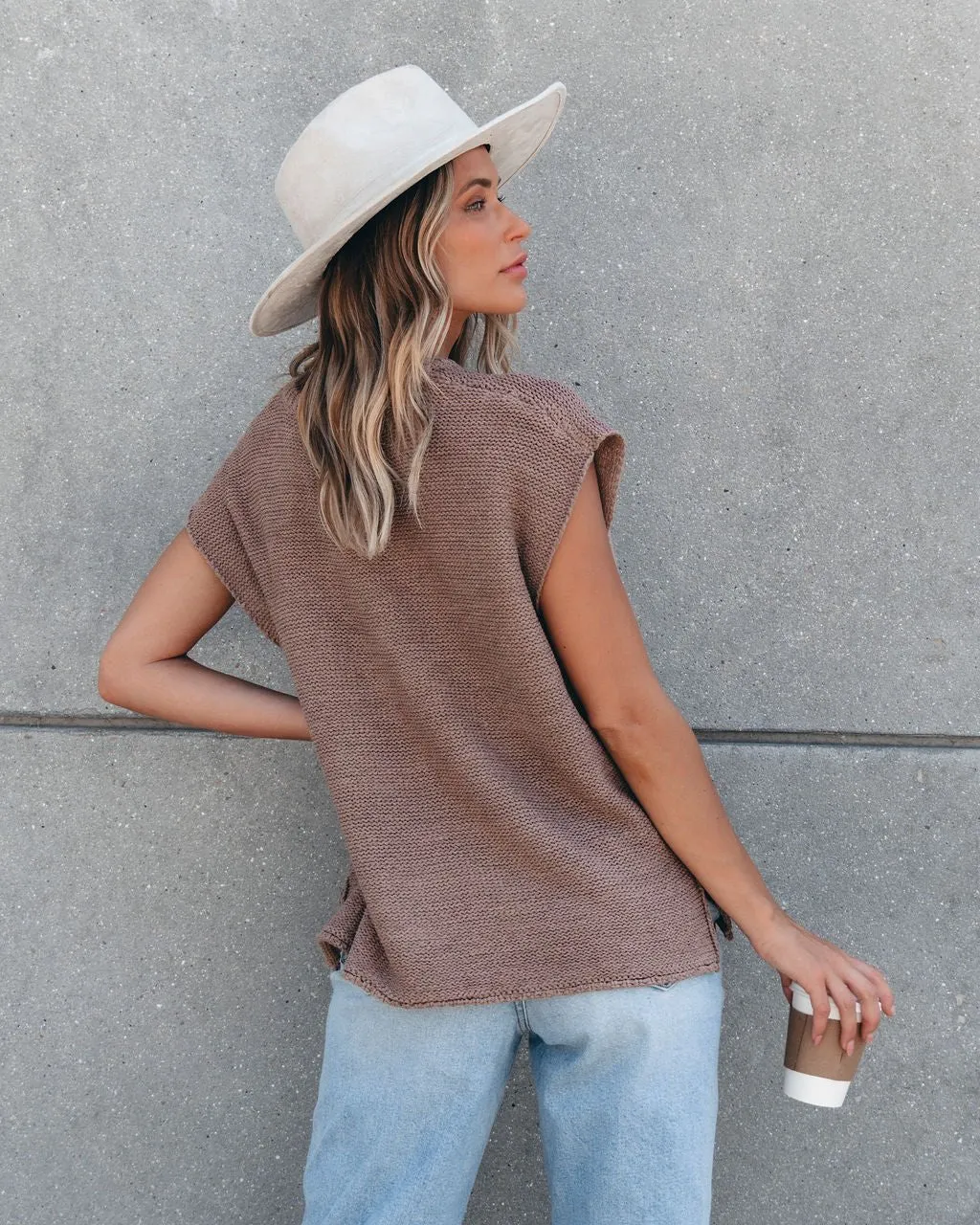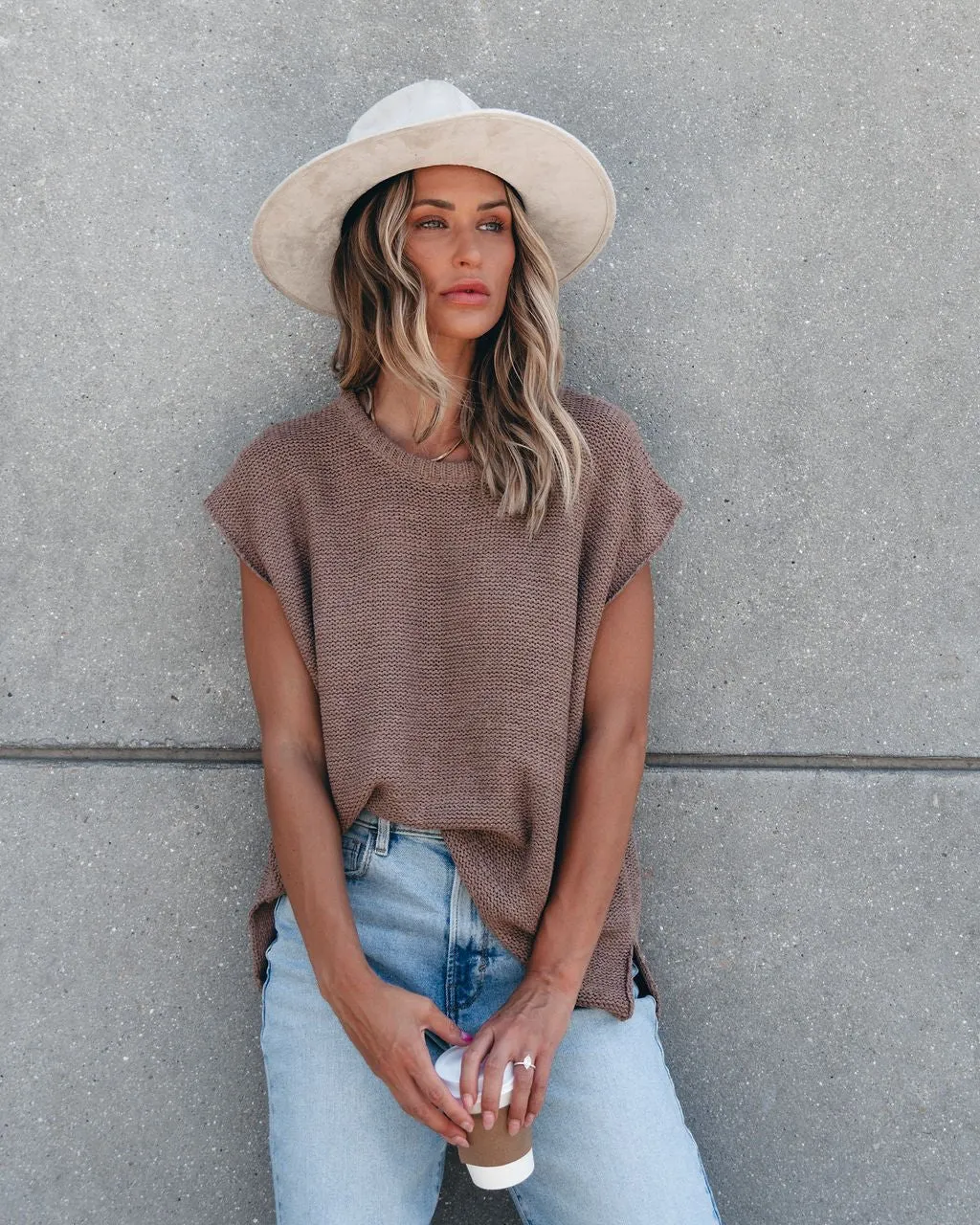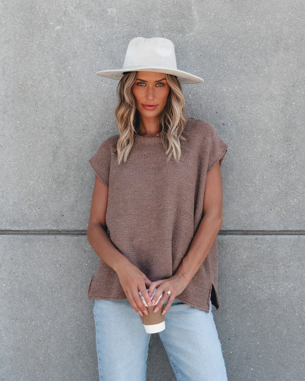 This breezy mocha pullover sweater features short cap sleeves, ribbed detail, and side slits. Made with 53% acrylic and 47% nylon, it offers a comfortable and stylish option for cooler weather. Style it with , , a wide brim , and simple gold for a boho chic outfit!