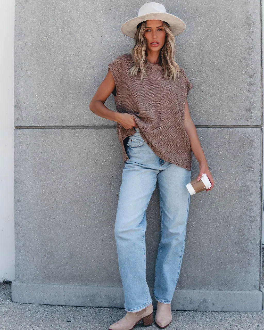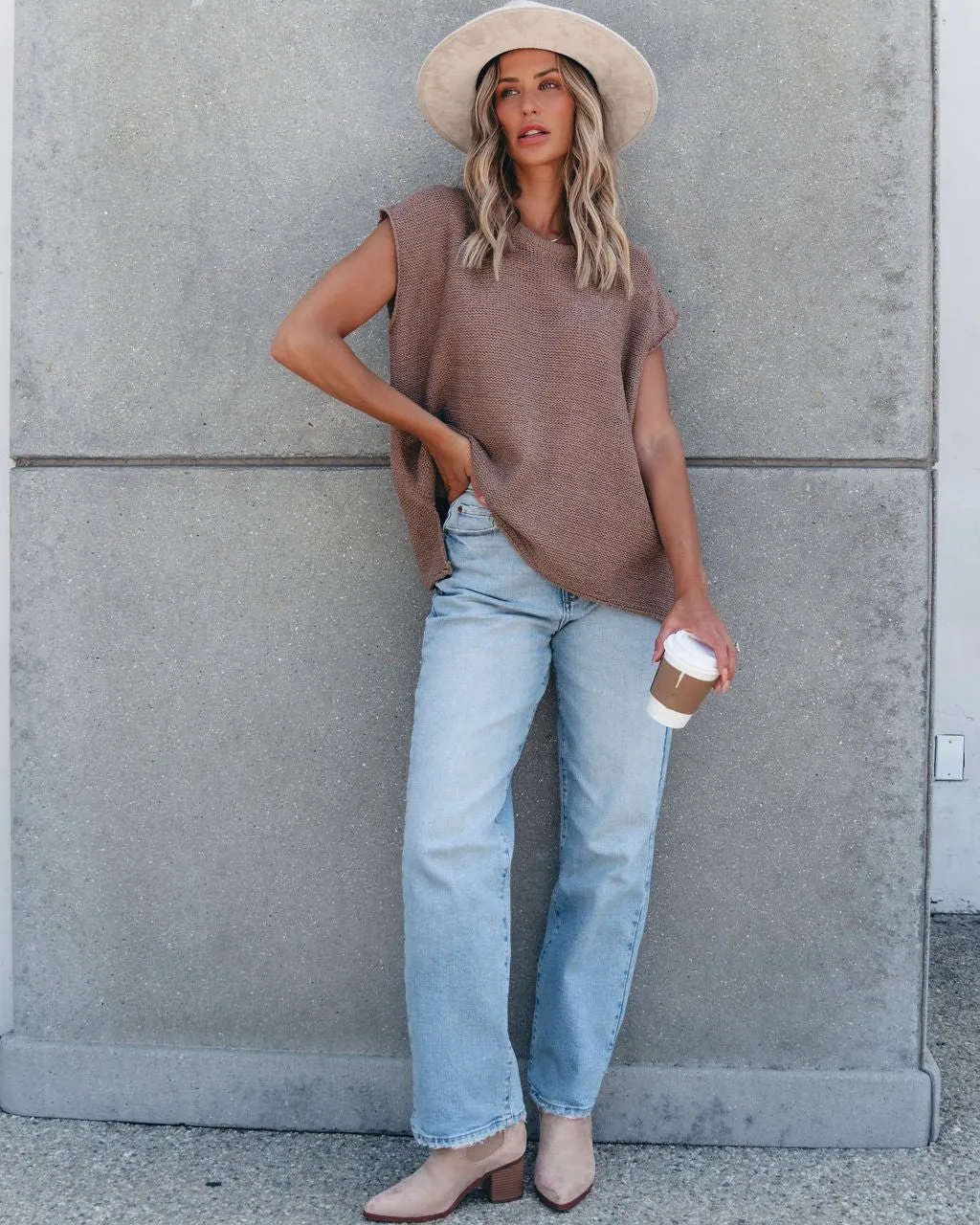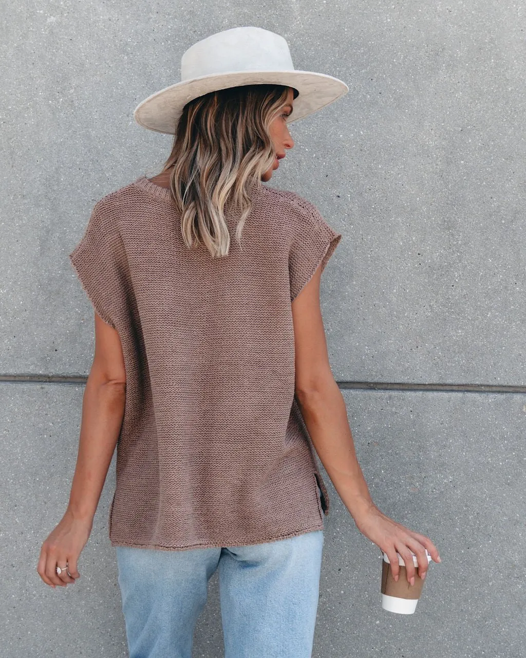 This breezy mocha pullover sweater features short cap sleeves, ribbed detail, and side slits. Made with 53% acrylic and 47% nylon, it offers a comfortable and stylish option for cooler weather. Style it with , , a wide brim , and simple gold for a boho chic outfit!