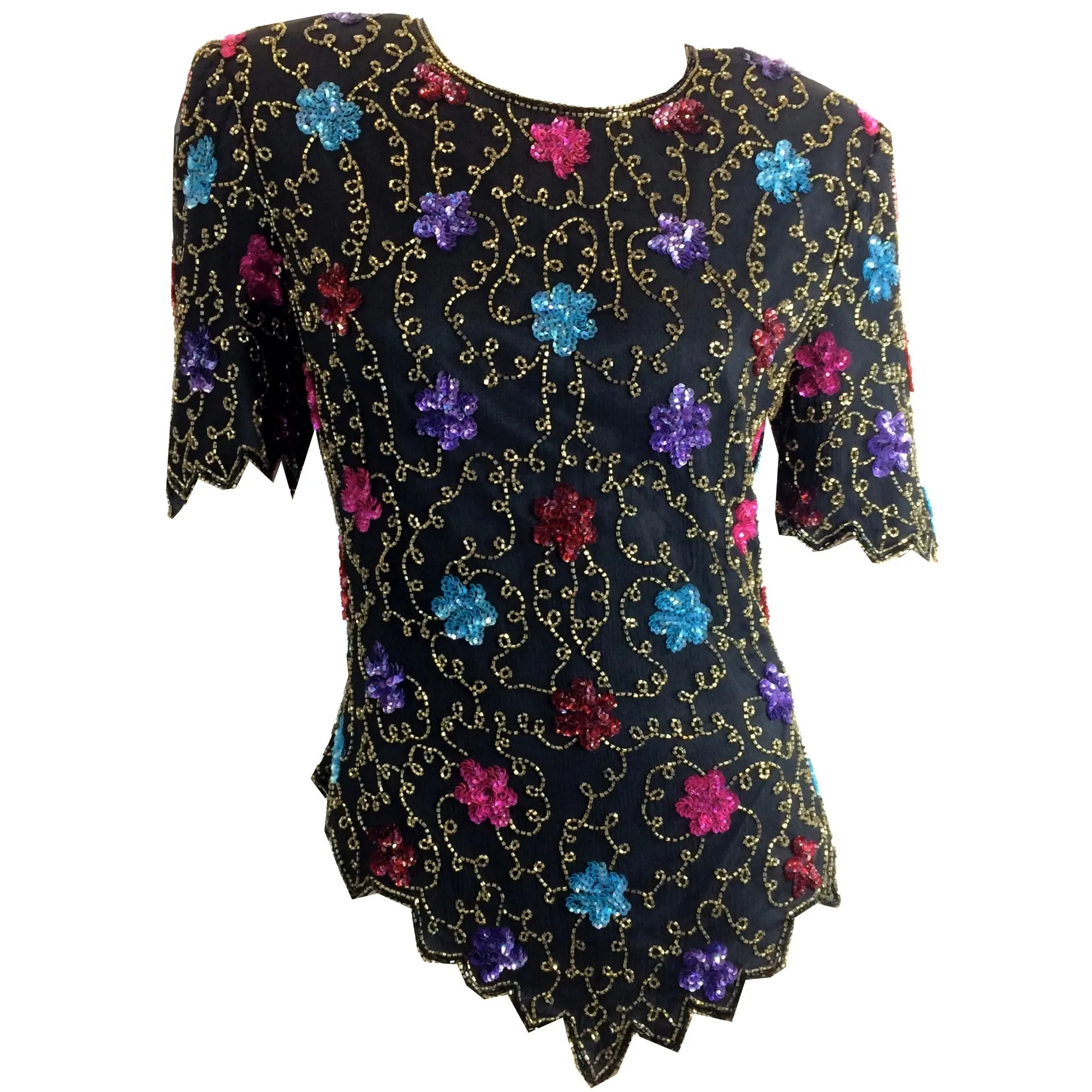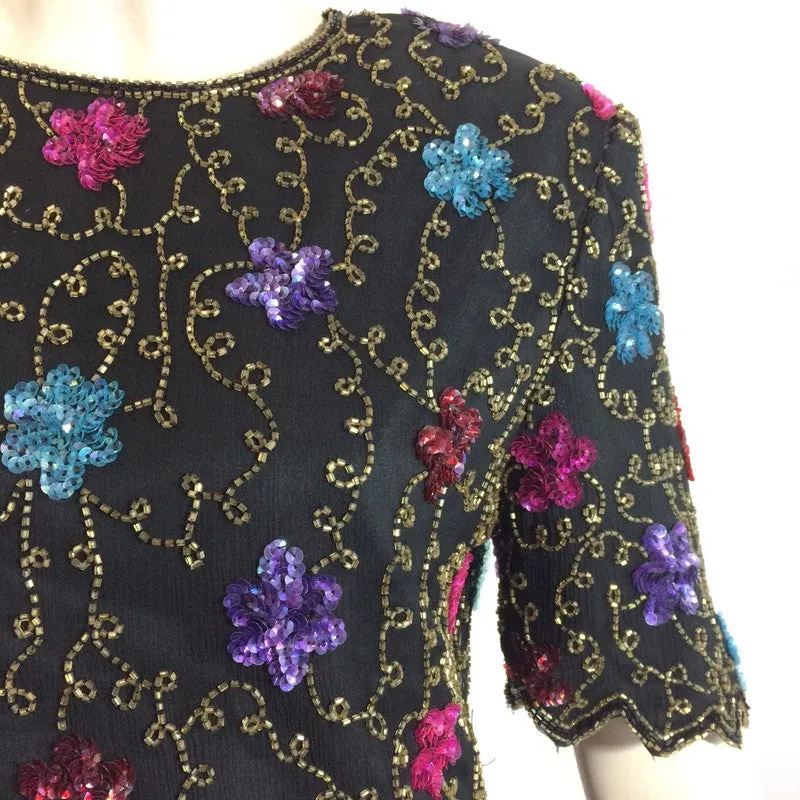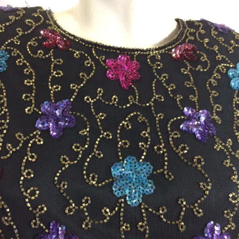 1980s black rayon and chiffon beaded and sequined tunic with petal hem and sleeves. Sheer sleeves, lined body. By Lawrence Kazar. Has shoulder pads, back zip. No flaws.