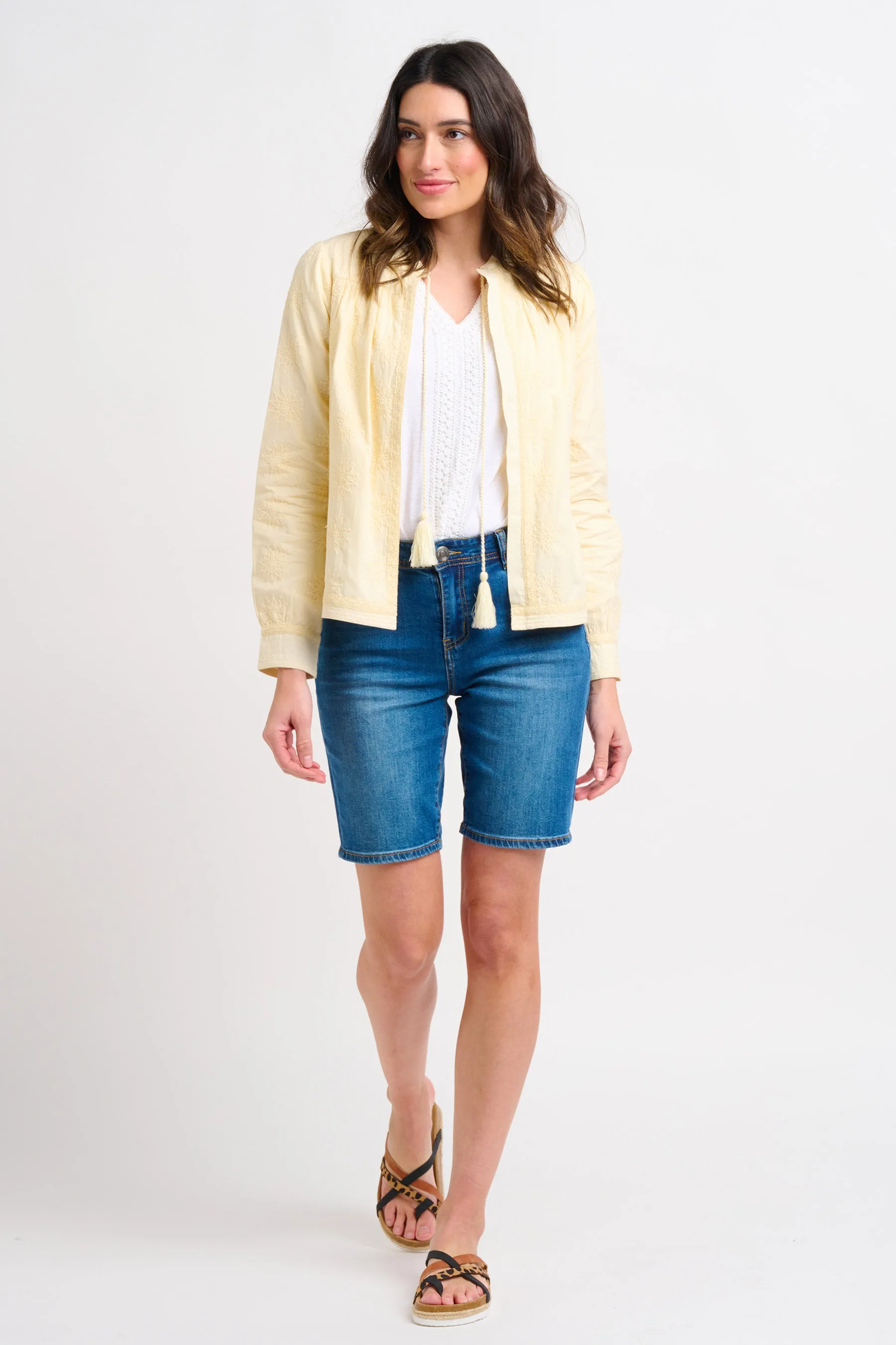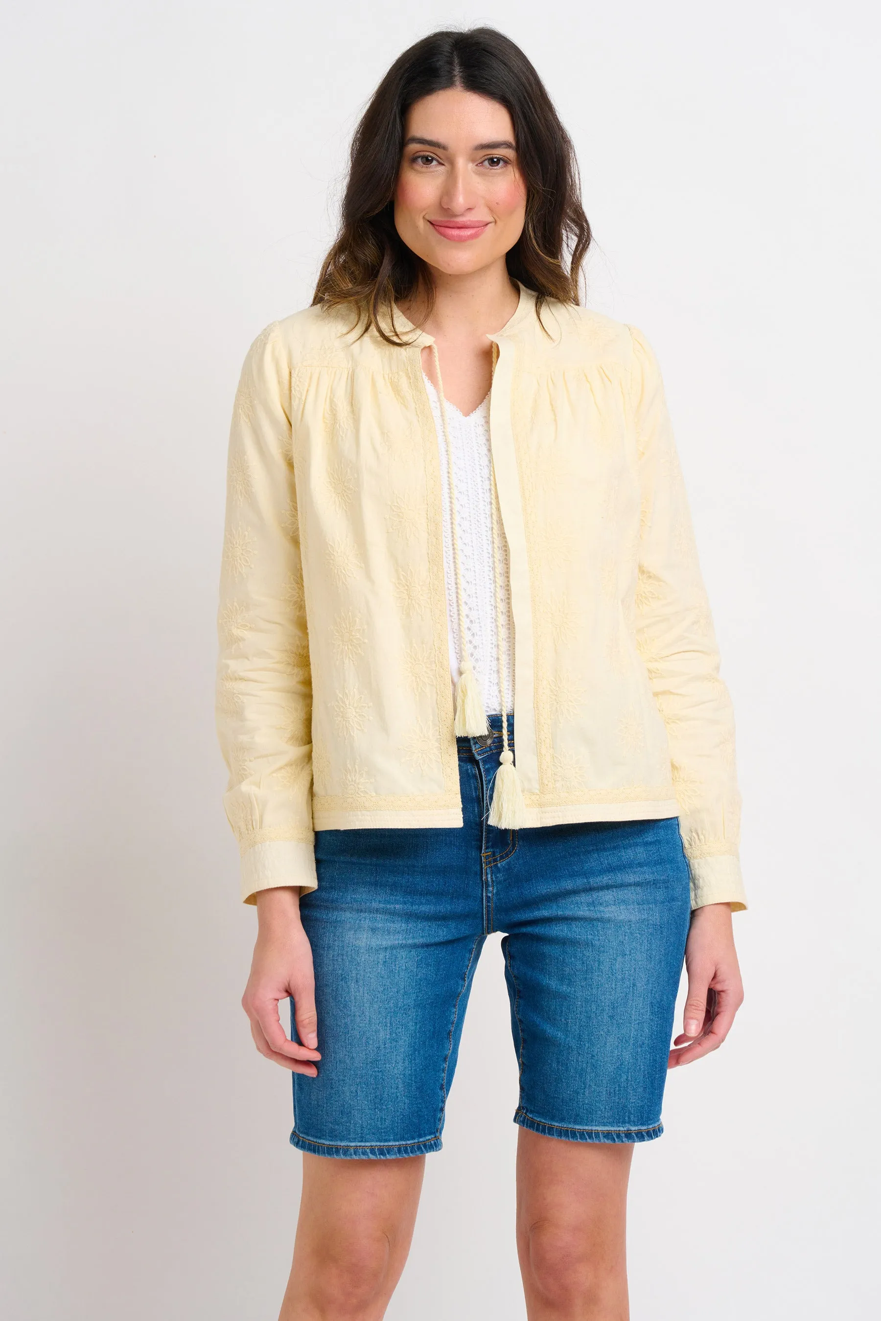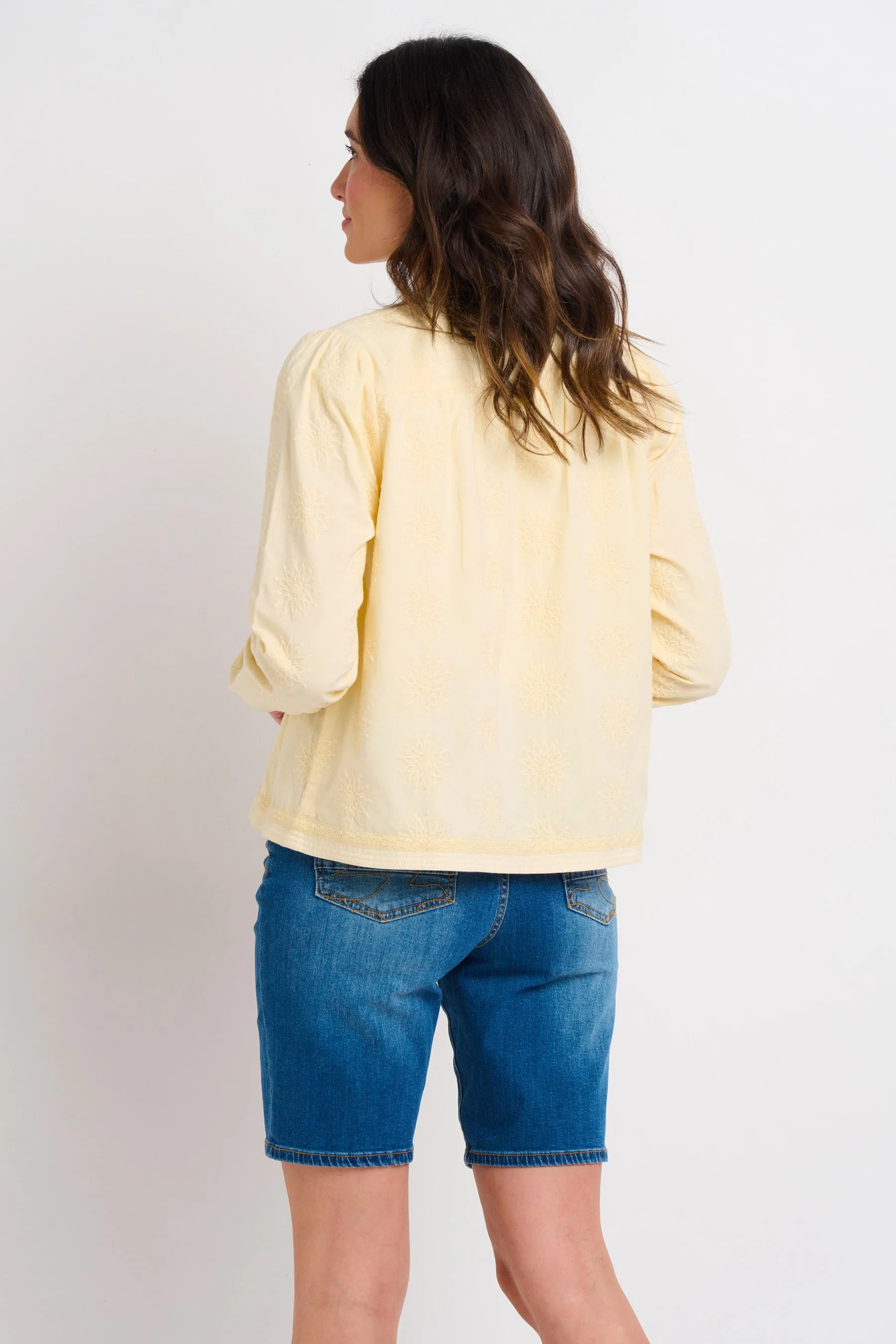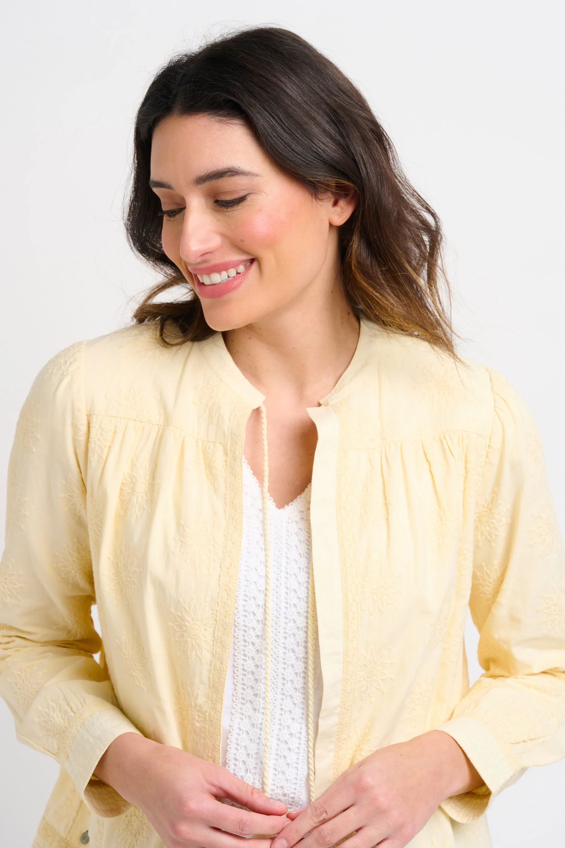 With feminine flowers embroidered all over this pure cotton cream shirt, you’ll look and feel like you’ve just stepped off the catwalk. The lace-detail strips running down the front and around the cuffs is a lovely finishing touch, as are the tasteful tassel ties at the neck.