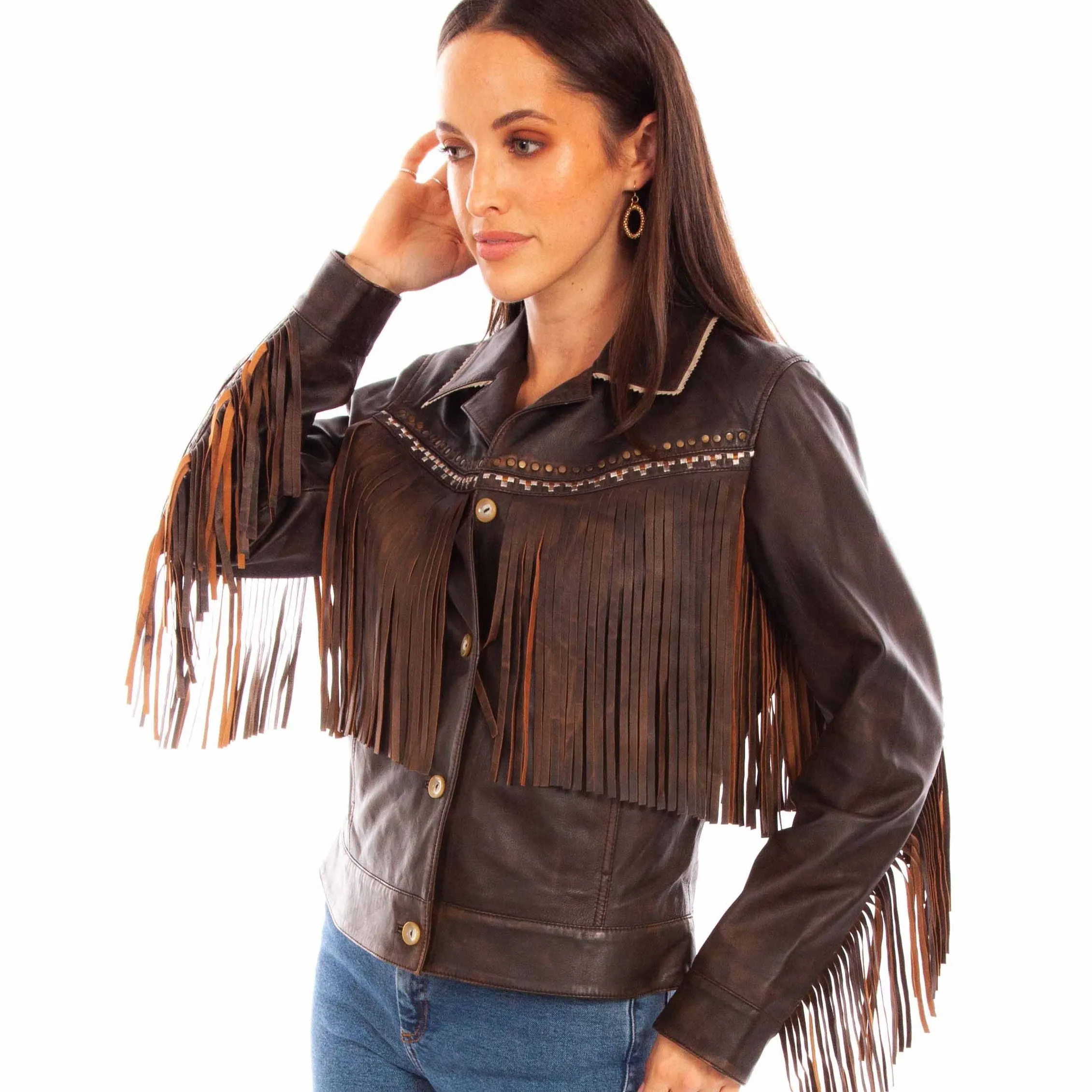Chocolate brown embroidered fringe leather jacket by Scully. This vintage inspired leather fringe jacket will bring out the cowgirl in you!. It features a button front closure, front and back yokes with gorgeous embroidery along the perimeter of the yokes. Sleeves have fringe the entire length. Dry clean only. Perfect western style jacket for any cowgirl.