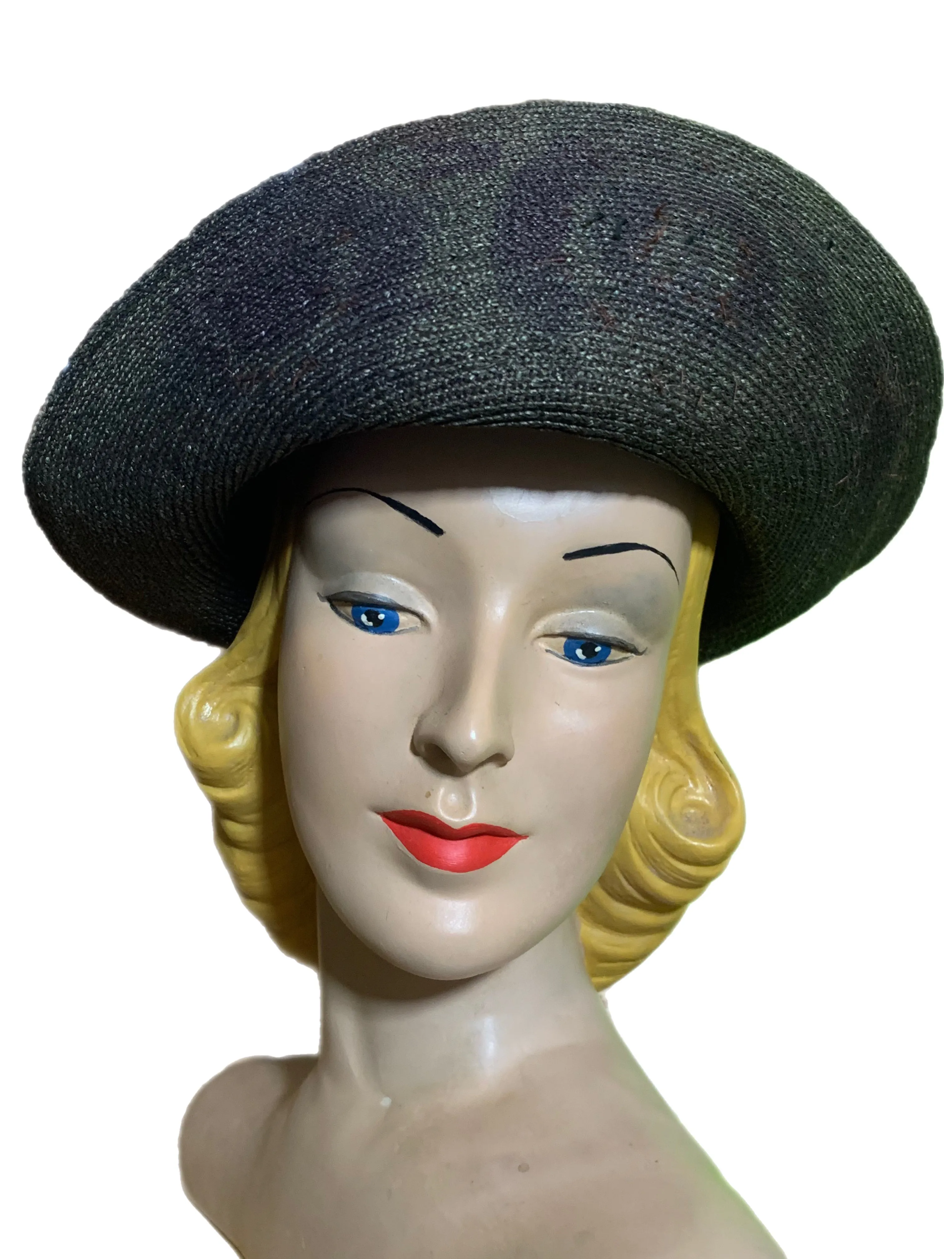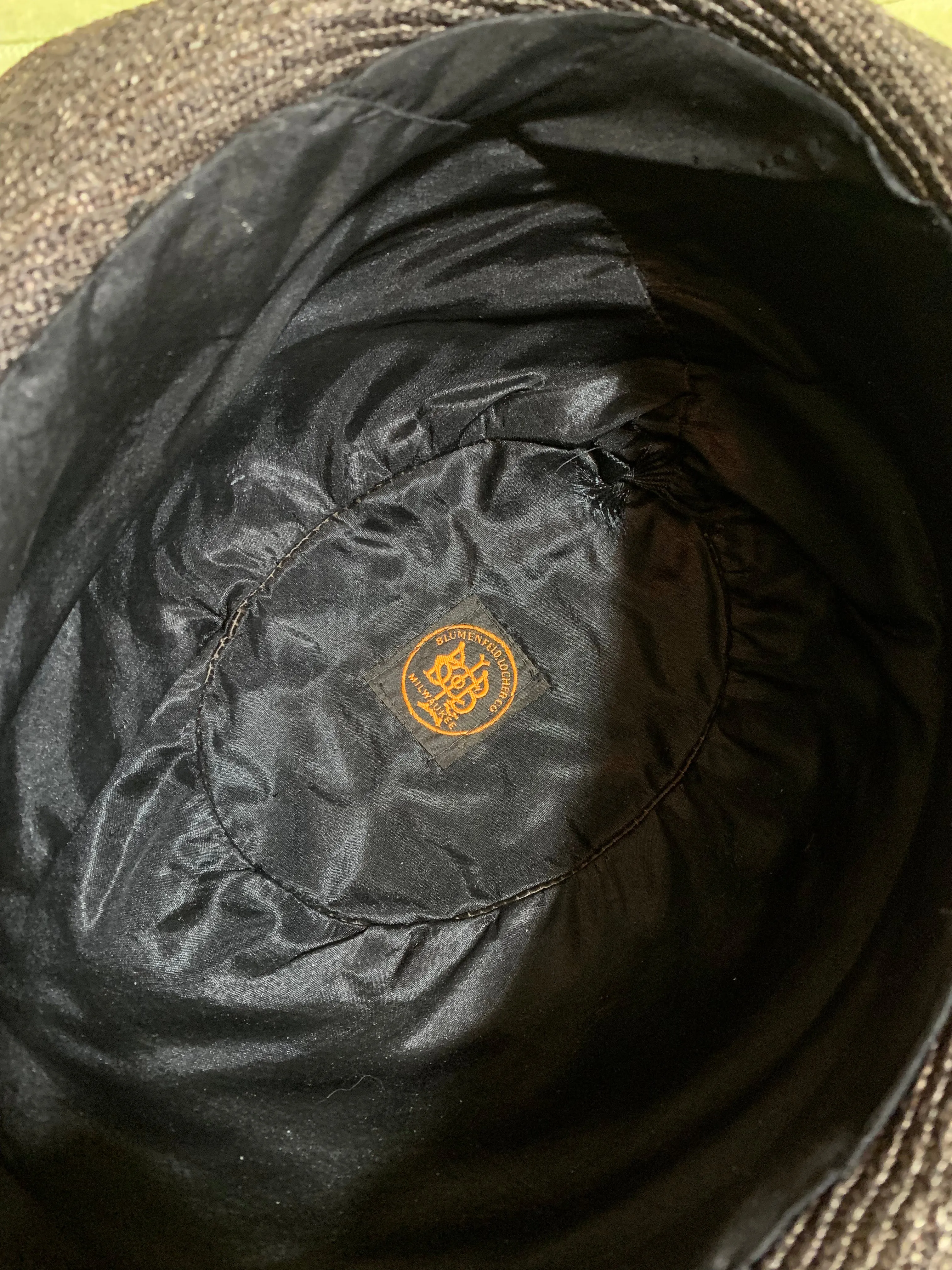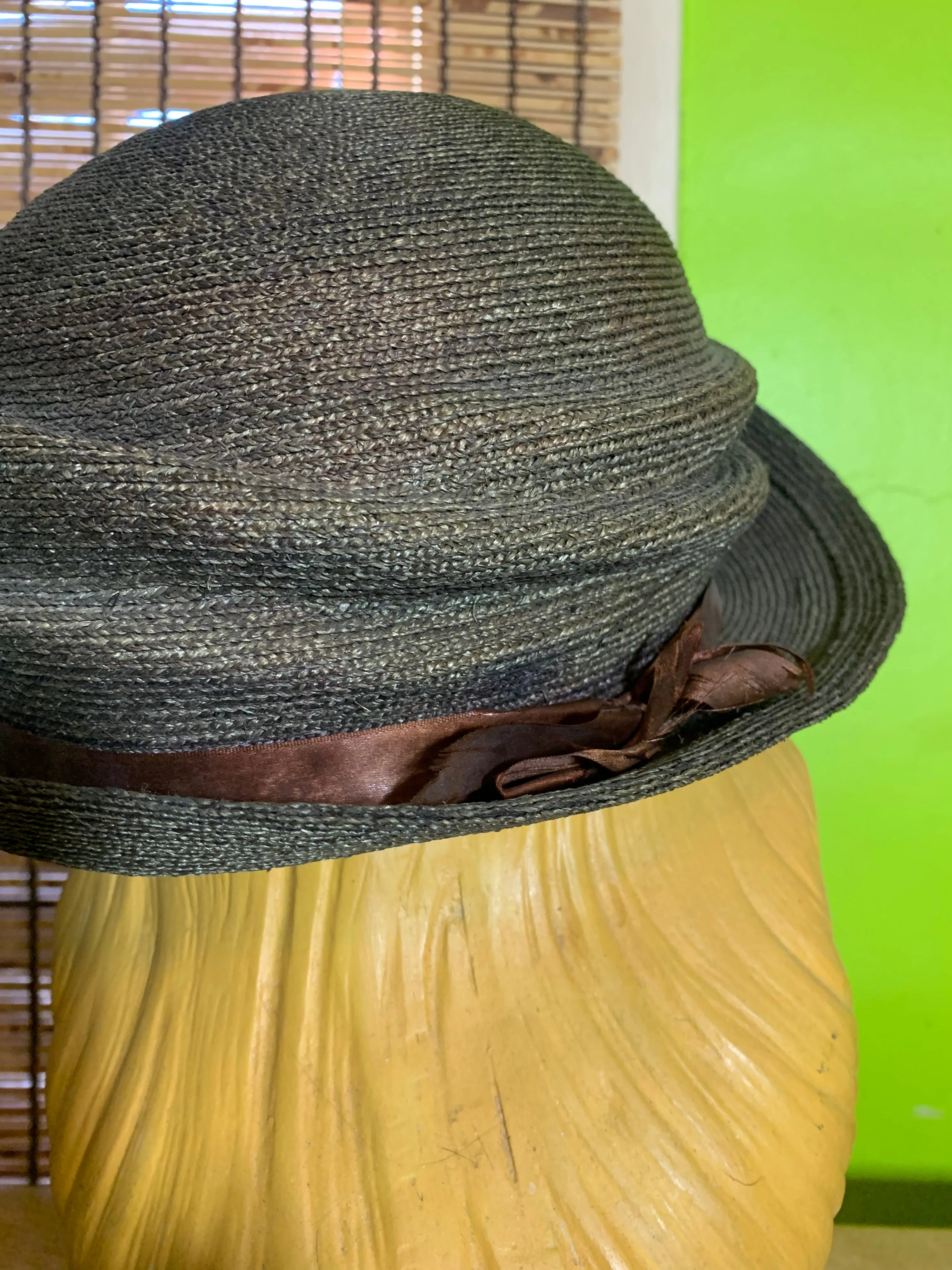Medium brown colored sisal hat with upturned wide brim, lined in black silk. Missing the trimmings from front of brim which has left fade- ready to add to! Cello ribbon and bow. By Blumenfeld Locher of Milwaukee.  A few areas where braids are separated. Size 22.
