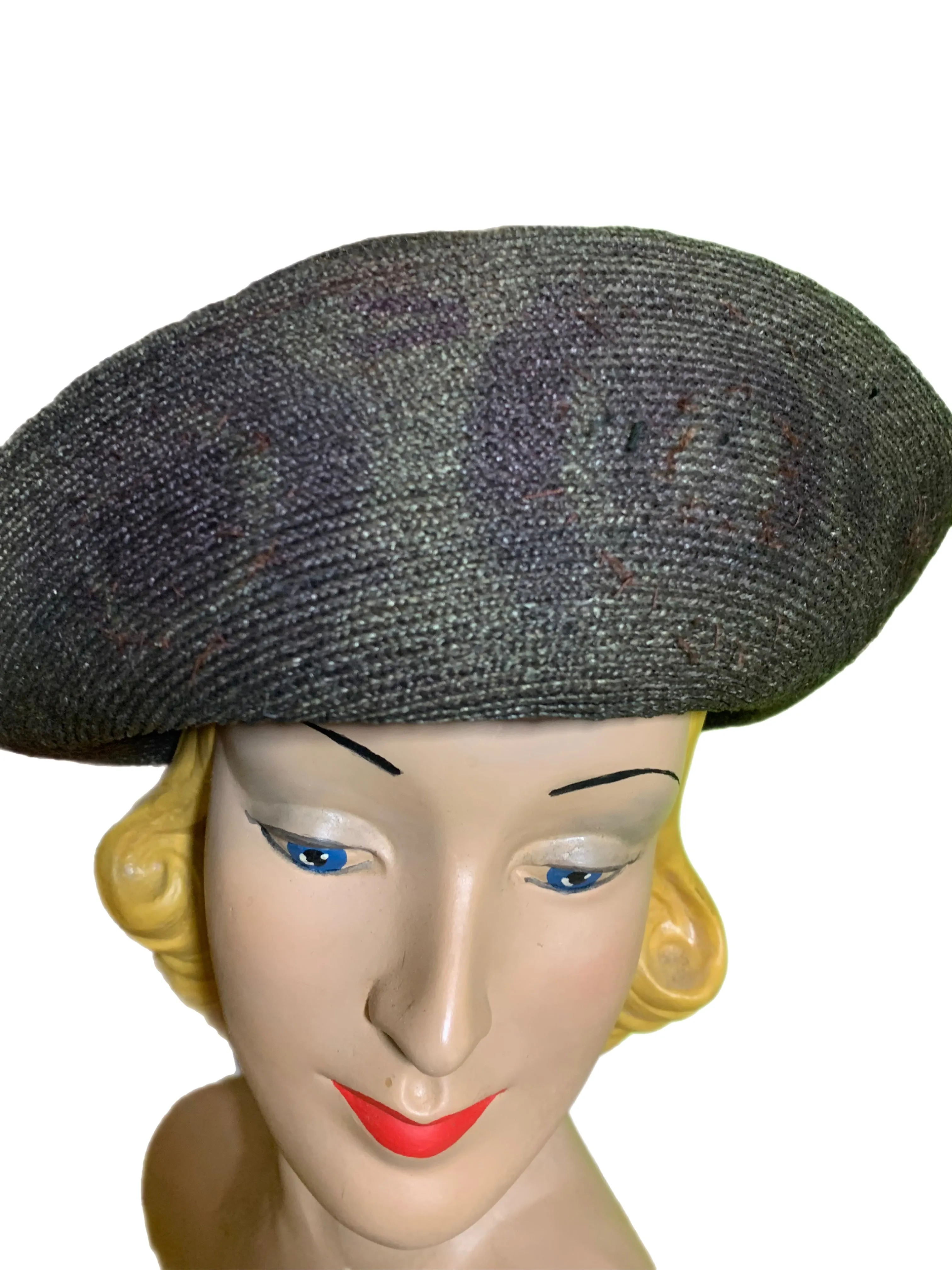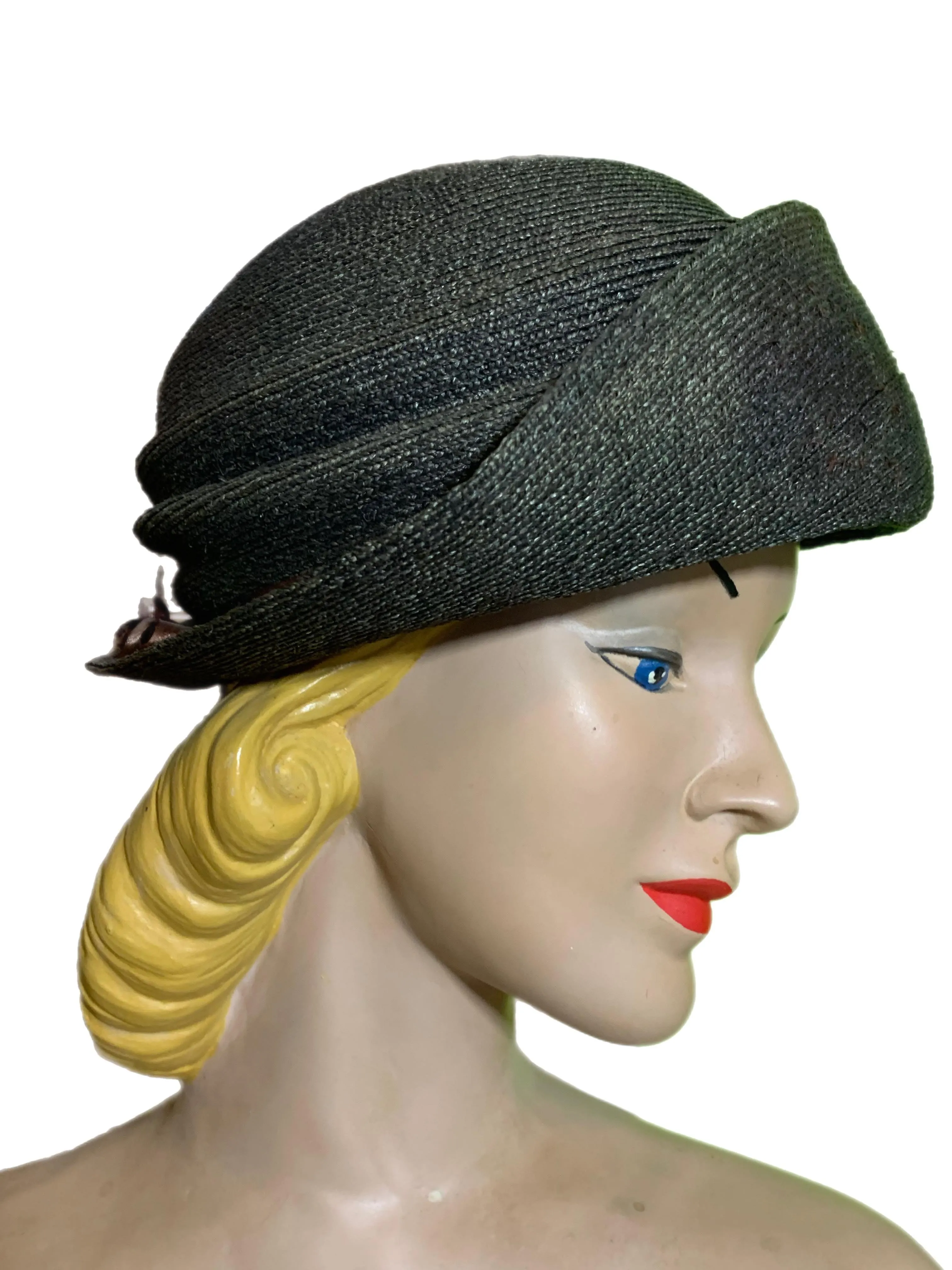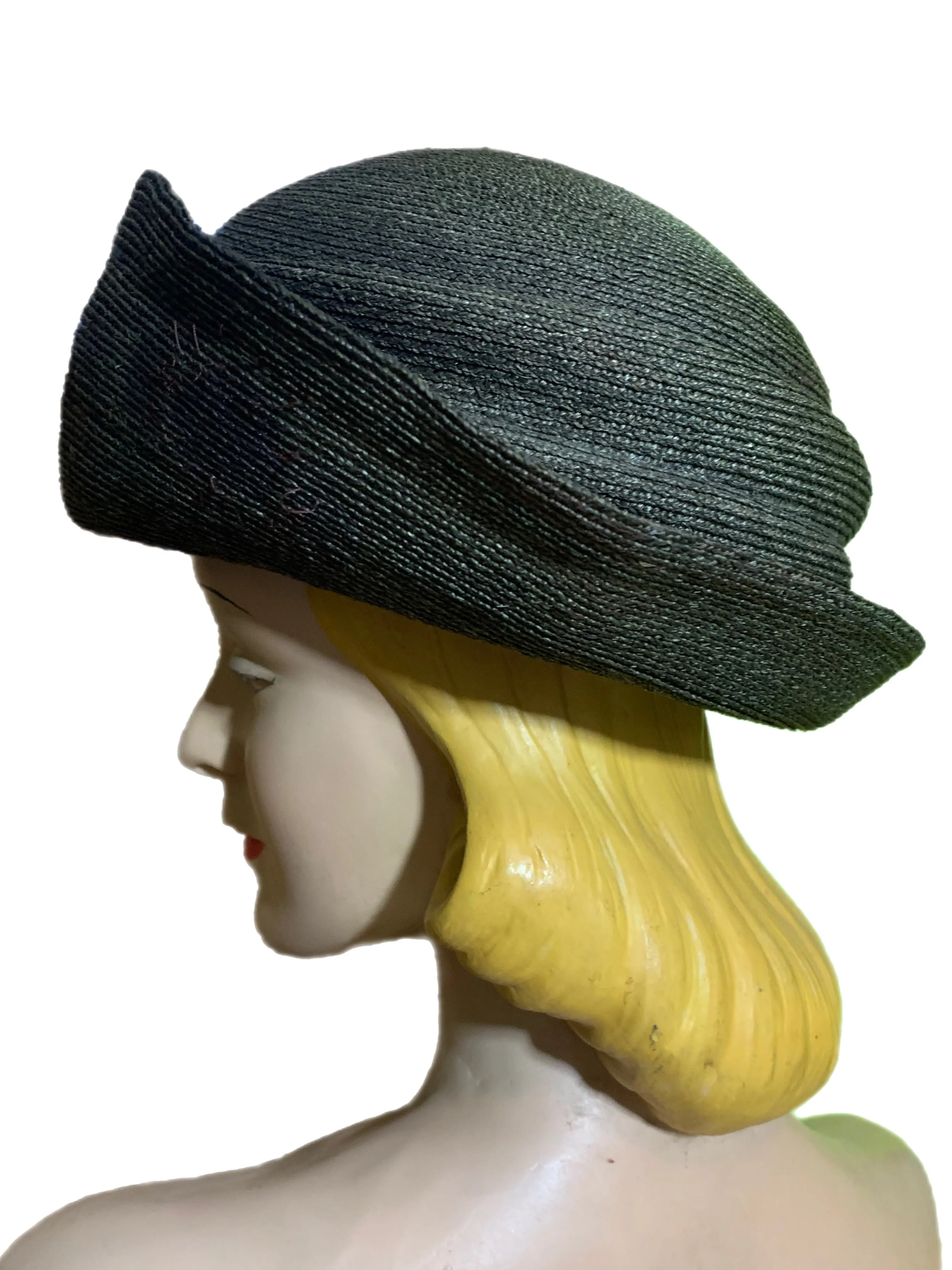 Medium brown colored sisal hat with upturned wide brim, lined in black silk. Missing the trimmings from front of brim which has left fade- ready to add to! Cello ribbon and bow. By Blumenfeld Locher of Milwaukee.  A few areas where braids are separated. Size 22.