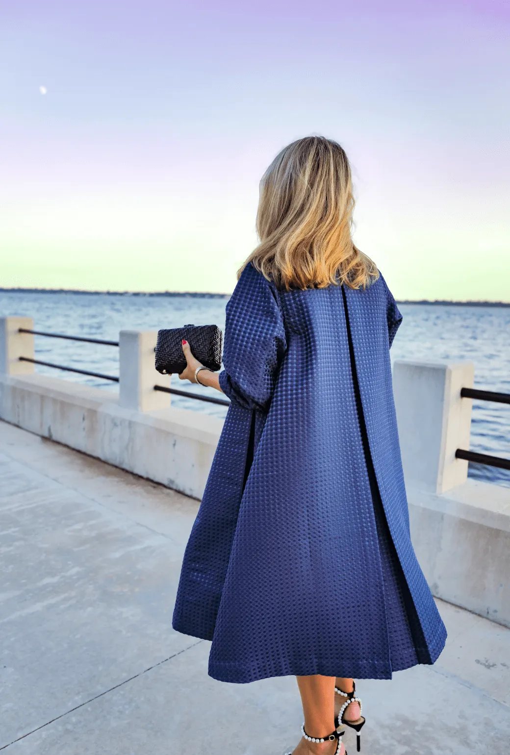 Say hello to the most decadent Swing Coat in stunning Chelsea blue. The retro-inspired design and exquisite textile will elevate your look both day and night. And with an included self-belt, you can adjust the silhouette with ease.